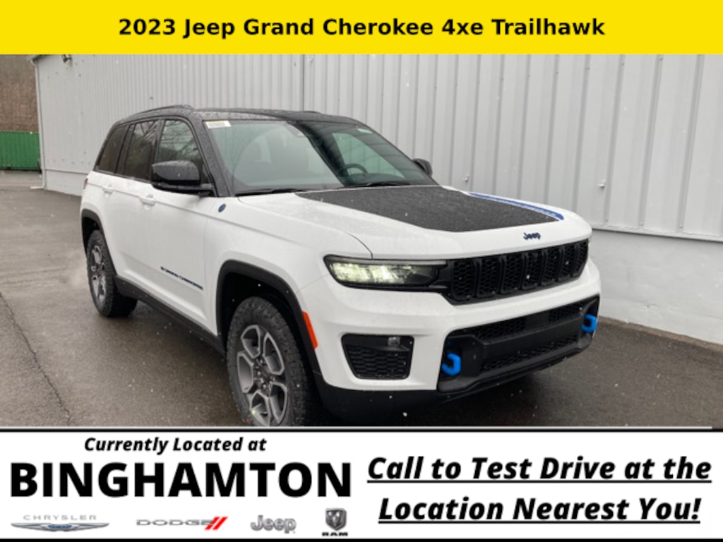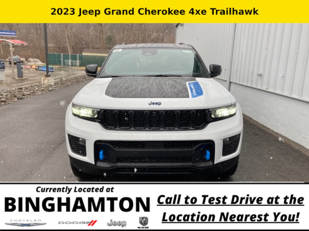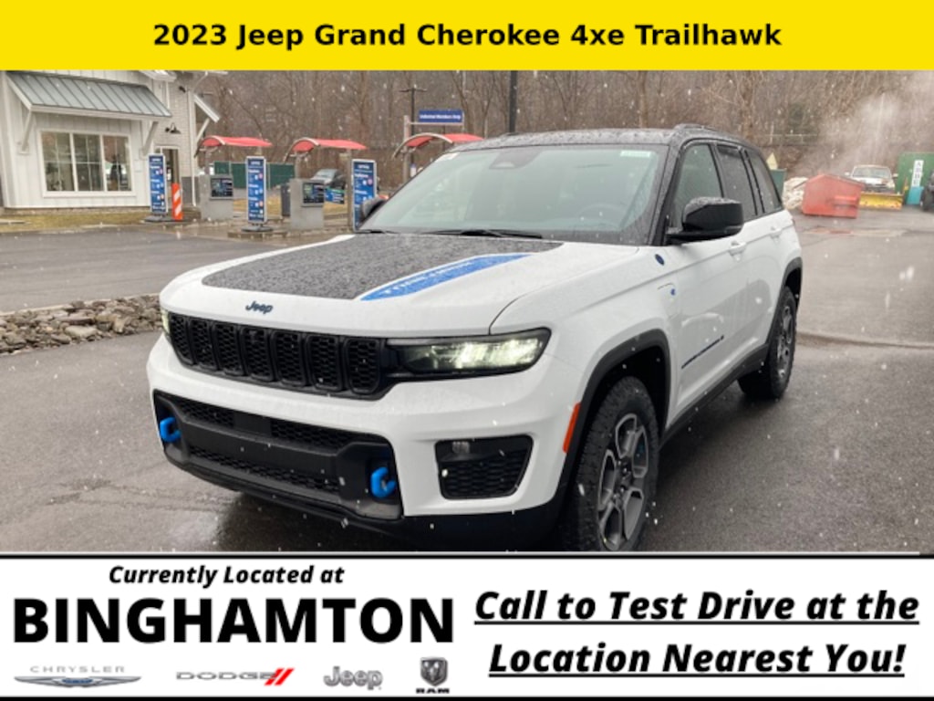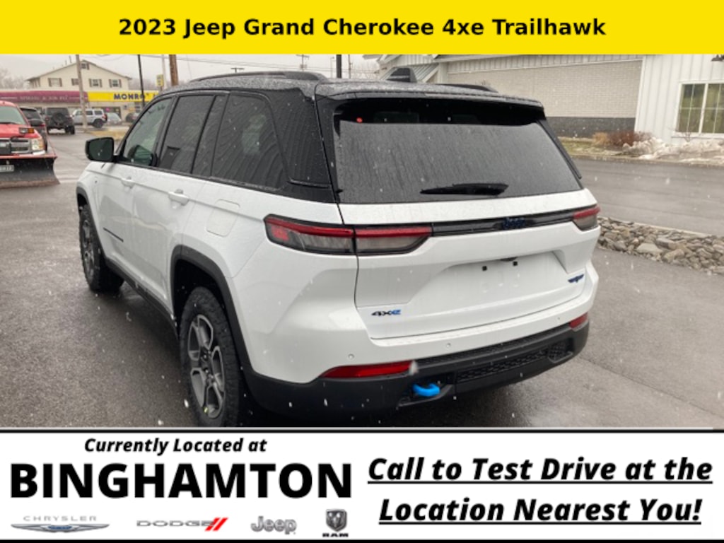 Bright White Clearcoat 2023 Jeep Grand Cherokee Trailhawk 4xe 4WD 8-Speed Automatic 2.0L I4 DOHC Save Time at the Dealership by Customizing your Deal Online!, 2.0L I4 DOHC, 4WD, 10 Speakers, 3.70 Rear Axle Ratio, 4-Wheel Disc Brakes, ABS brakes, Adaptive suspension, Air Conditioning, Alloy wheels, AM/FM radio: SiriusXM with 360L, Anti-whiplash front head restraints, Audio memory, Auto High-beam Headlights, Auto-dimming door mirrors, Auto-dimming Rear-View mirror, Auto-leveling suspension, Automatic temperature control, Brake assist, Bumpers: body-color, Capri Leather/Suede Seats, Compass, Delay-off headlights, Driver door bin, Driver vanity mirror, Dual front impact airbags, Dual front side impact airbags, Electronic Stability Control, Four wheel independent suspension, Front anti-roll bar, Front Bucket Seats, Front Center Armrest w/Storage, Front dual zone A/C, Front fog lights, Front License Plate Bracket, Front reading lights, Fully automatic headlights, Garage door transmitter, Heated door mirrors, Heated front seats, Heated rear seats, Heated steering wheel, Heavy Duty Suspension, Illuminated entry, Knee airbag, Leather Shift Knob, Low tire pressure warning, Manufacturer's Statement of Origin (DISC), Memory seat, Navigation System, Occupant sensing airbag, Outside temperature display, Overhead airbag, Overhead console, Panic alarm, Passenger door bin, Passenger vanity mirror, Power door mirrors, Power driver seat, Power Liftgate, Power passenger seat, Power steering, Power windows, Quick Order Package 27K, Radio data system, Radio: Uconnect 5 Nav w/10.1" Display, Rear anti-roll bar, Rear reading lights, Rear seat center armrest, Rear window defroster, Rear window wiper, Remote keyless entry, Security system, Speed control, Speed-Sensitive Wipers, Split folding rear seat, Spoiler, Steering wheel mounted audio controls, Tachometer, Telescoping steering wheel, Tilt steering wheel, Traction control, Trip computer, Turn signal indicator mirrors, Two Tone Paint Group, Variably intermittent wipers, Ventilated front seats, Voltmeter, Wheels: 18" x 8" Machined Face/Painted Aluminum, 2.0L I4 DOHC, 4WD.