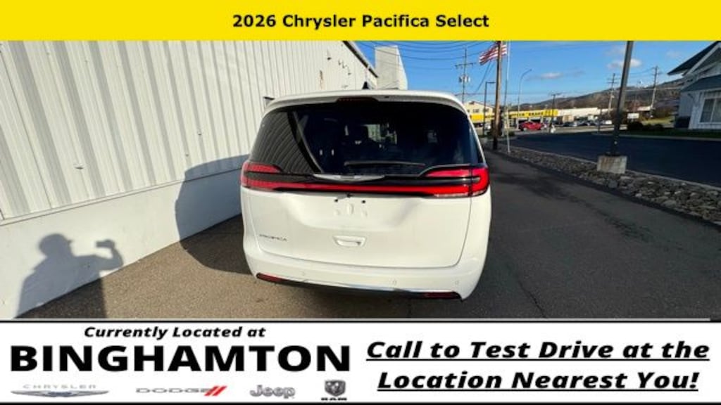 Bright White Clearcoat 2026 Chrysler Pacifica Select FWD 9-Speed 948TE Automatic 3.6L V6 24V VVT Save Time at the Dealership by Customizing your Deal Online!, 10.1" Touchscreen Display, 17" x 7.0" Aluminum Wheels, 3.25 Axle Ratio, 3rd row seats: split-bench, 4-Wheel Disc Brakes, 4G LTE Wi-Fi Hot Spot, 6 Speakers, ABS brakes, Air Conditioning, Alloy wheels, AM/FM radio: SiriusXM, Apple CarPlay, Apple CarPlay/Android Auto, Auto-dimming Rear-View mirror, Automatic temperature control, Black Seats, Brake assist, Bumpers: body-color, Caprice Leatherette Bucket Seats, Compass, Connectivity - US/Canada, Delay-off headlights, Disassociated Touchscreen Display, Driver door bin, Driver vanity mirror, Driver's Seat Mounted Armrest, Dual front impact airbags, Dual front side impact airbags, Electronic Stability Control, Emergency communication system: Chrysler Connect, For Details, Visit DriveUconnect.com, Four wheel independent suspension, Front anti-roll bar, Front Bucket Seats, Front dual zone A/C, Front fog lights, Front reading lights, Fully automatic headlights, Garage door transmitter, Google Android Auto, GPS Antenna Input, Heated door mirrors, Heated front seats, Heated steering wheel, Illuminated entry, Integrated Active Noise Cancellation, Integrated Center Stack Radio, Knee airbag, Low tire pressure warning, Memory seat, Occupant sensing airbag, Outside temperature display, Overhead airbag, Overhead console, Panic alarm, ParkView Rear Back-Up Camera, Passenger door bin, Passenger seat mounted armrest, Passenger vanity mirror, Power door mirrors, Power driver seat, Power Liftgate, Power steering, Power windows, Quick Order Package 27L, Radio data system, Radio: Uconnect 5 with 10.1" Display, Rain sensing wipers, Rear air conditioning, Rear reading lights, Rear window defroster, Rear window wiper, Reclining 3rd row seat, Remote keyless entry, Security system, Speed control, Split folding rear seat, Spoiler, Steering wheel mounted audio controls, Tachometer, Telescoping steering wheel, Tilt steering wheel, Touring Suspension, Traction control, Trip computer, Turn signal indicator mirrors, USB Host Flip, Variably intermittent wipers, Voltmeter.