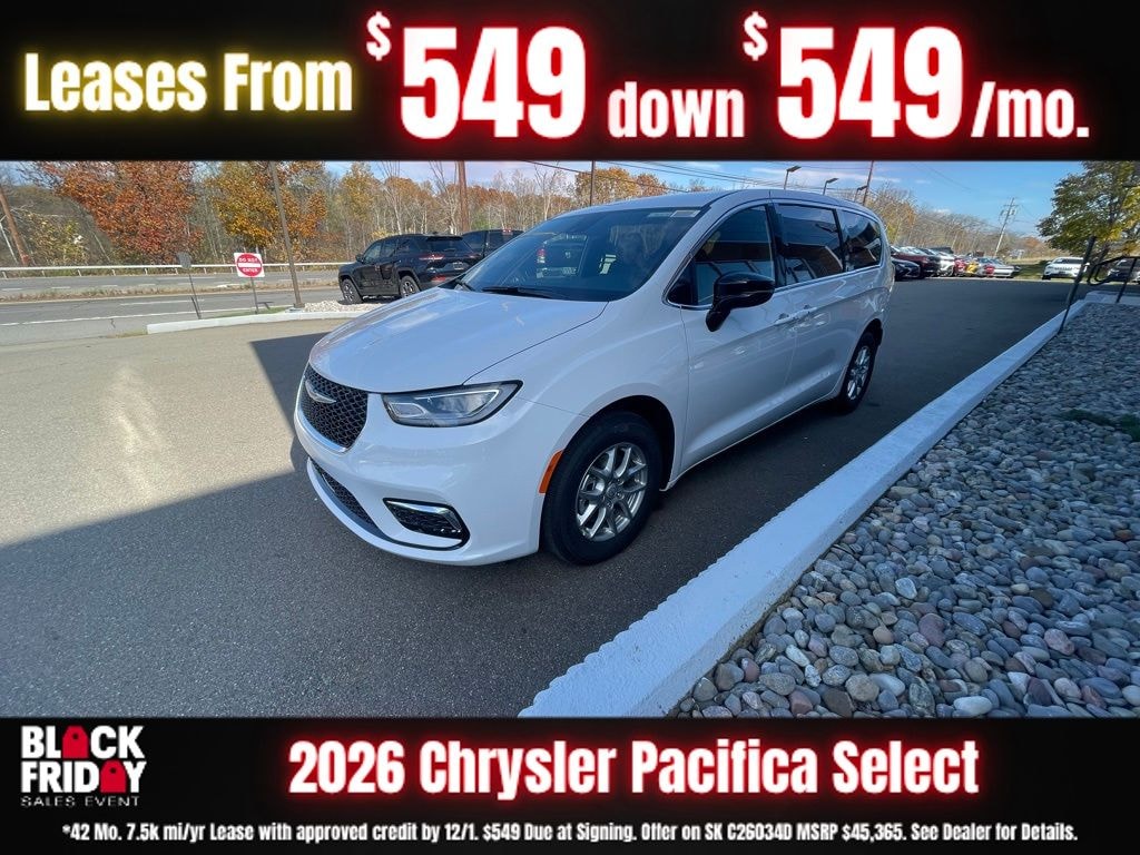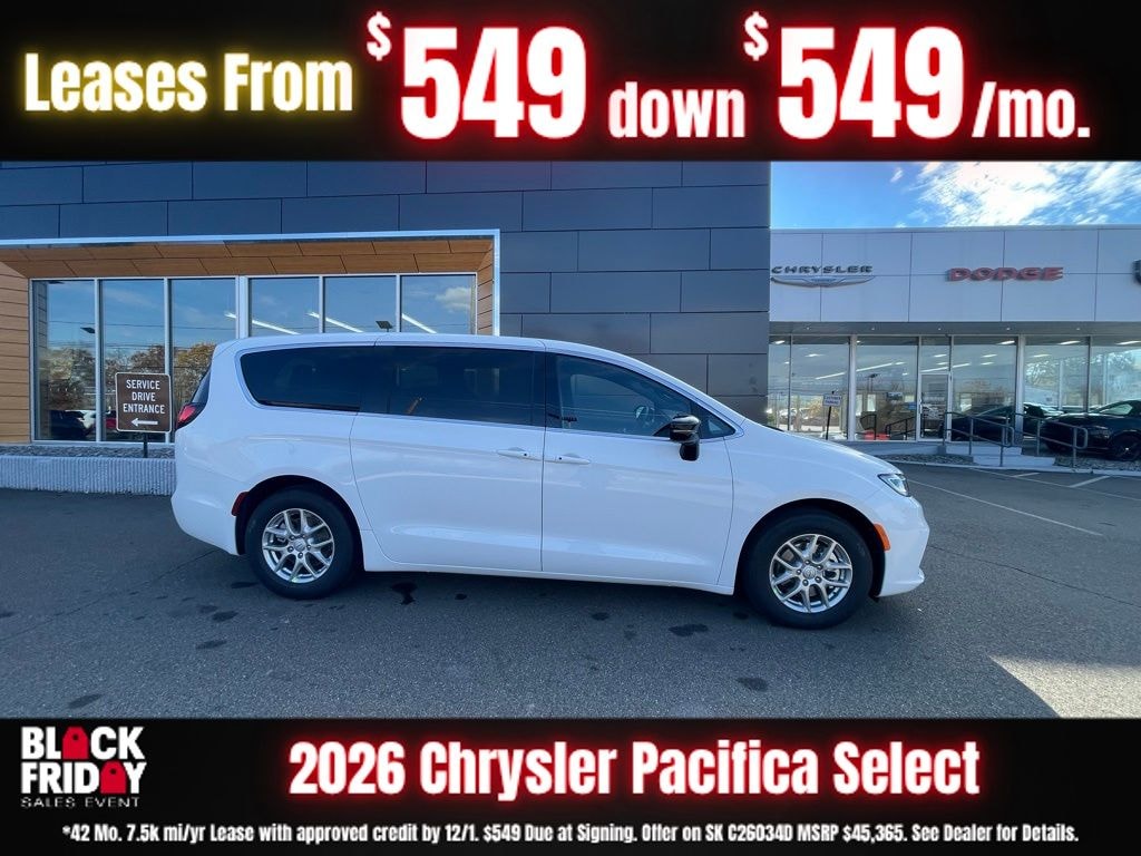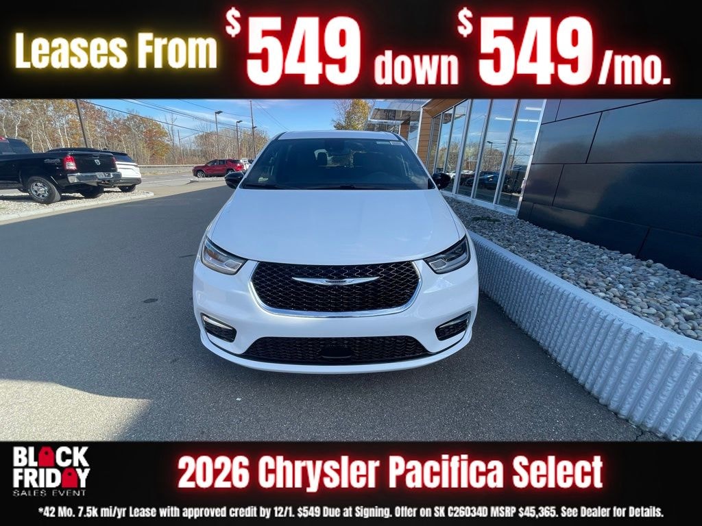 Bright White Clearcoat 2026 Chrysler Pacifica Select FWD 9-Speed 948TE Automatic 3.6L V6 24V VVT 10.1" Touchscreen Display, 17" x 7.0" Aluminum Wheels, 3.25 Axle Ratio, 3rd row seats: split-bench, 4-Wheel Disc Brakes, 4G LTE Wi-Fi Hot Spot, 6 Speakers, ABS brakes, Air Conditioning, Alloy wheels, AM/FM radio: SiriusXM, Apple CarPlay, Apple CarPlay/Android Auto, Auto-dimming Rear-View mirror, Automatic temperature control, Black Seats, Bluetooth, Brake assist, Bumpers: body-color, Caprice Leatherette Bucket Seats, Compass, Connectivity - US/Canada, Delay-off headlights, Disassociated Touchscreen Display, Driver door bin, Driver vanity mirror, Driver's Seat Mounted Armrest, Dual front impact airbags, Dual front side impact airbags, Electronic Stability Control, Emergency communication system: Chrysler Connect, For Details, Visit DriveUconnect.com, Four wheel independent suspension, Front anti-roll bar, Front Bucket Seats, Front dual zone A/C, Front fog lights, Front reading lights, Fully automatic headlights, Garage door transmitter, Google Android Auto, GPS Antenna Input, Heated door mirrors, Heated front seats, Heated steering wheel, Illuminated entry, Integrated Active Noise Cancellation, Integrated Center Stack Radio, Knee airbag, Low tire pressure warning, Memory seat, Occupant sensing airbag, Outside temperature display, Overhead airbag, Overhead console, Panic alarm, ParkView Rear Back-Up Camera, Passenger door bin, Passenger seat mounted armrest, Passenger vanity mirror, Power door mirrors, Power driver seat, Power Liftgate, Power steering, Power windows, Quick Order Package 27L, Radio data system, Radio: Uconnect 5 w/10.1" Display, Rain sensing wipers, Rear air conditioning, Rear reading lights, Rear window defroster, Rear window wiper, Reclining 3rd row seat, Remote keyless entry, Security system, Speed control, Split folding rear seat, Spoiler, Steering wheel mounted audio controls, Tachometer, Telescoping steering wheel, Tilt steering wheel, Touring Suspension, Traction control, Trip computer, Turn signal indicator mirrors, USB Host Flip, Variably intermittent wipers.