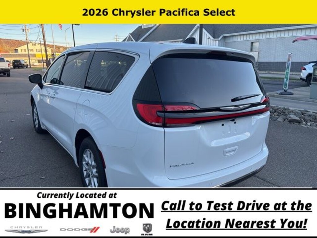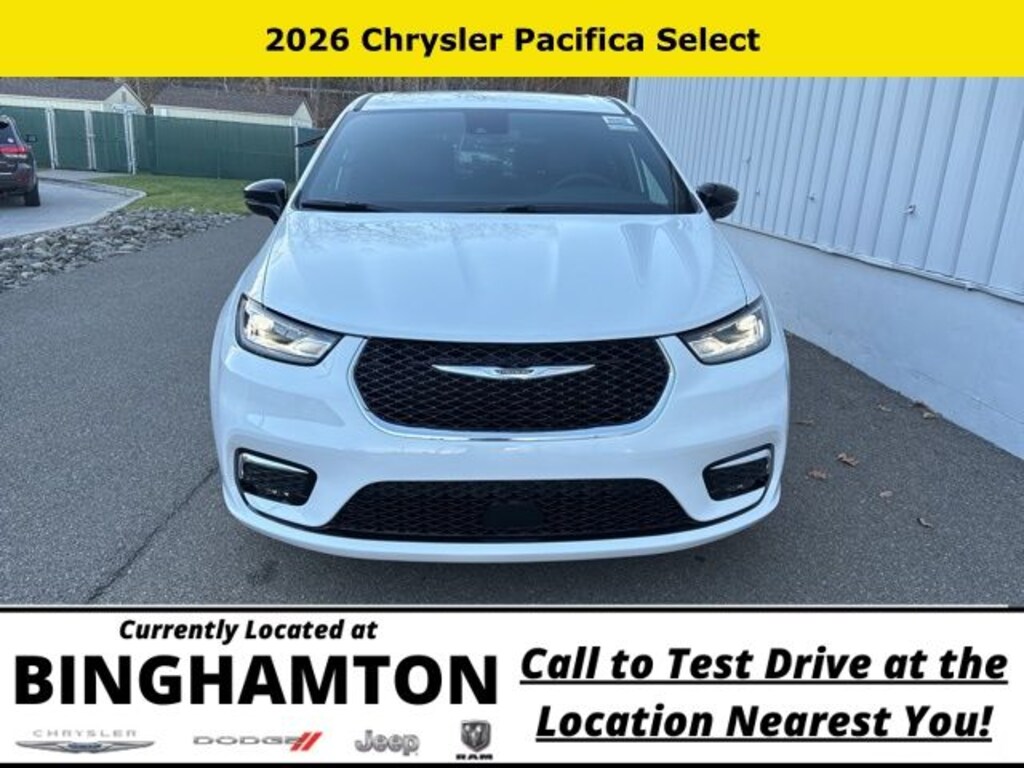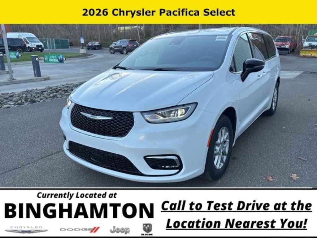 Bright White Clearcoat 2026 Chrysler Pacifica Select FWD 9-Speed 948TE Automatic 3.6L V6 24V VVT Save Time at the Dealership by Customizing your Deal Online!, 10.1" Touchscreen Display, 17" x 7.0" Aluminum Wheels, 3.25 Axle Ratio, 3rd row seats: split-bench, 4-Wheel Disc Brakes, 4G LTE Wi-Fi Hot Spot, 6 Speakers, 8-Passenger Seating, ABS brakes, Air Conditioning, Alloy wheels, AM/FM radio: SiriusXM, Apple CarPlay, Apple CarPlay/Android Auto, Auto-dimming Rear-View mirror, Automatic temperature control, Black Seats, Brake assist, Bumpers: body-color, Caprice Leatherette Bucket Seats, Compass, Connectivity - US/Canada, Delay-off headlights, Disassociated Touchscreen Display, Driver door bin, Driver vanity mirror, Driver's Seat Mounted Armrest, Dual front impact airbags, Dual front side impact airbags, Electronic Stability Control, Emergency communication system: Chrysler Connect, For Details, Visit DriveUconnect.com, Four wheel independent suspension, Front anti-roll bar, Front Bucket Seats, Front dual zone A/C, Front fog lights, Front reading lights, Fully automatic headlights, Garage door transmitter, Google Android Auto, GPS Antenna Input, Heated door mirrors, Heated front seats, Heated steering wheel, Illuminated entry, Integrated Active Noise Cancellation, Integrated Center Stack Radio, Knee airbag, Low tire pressure warning, Memory seat, Occupant sensing airbag, Outside temperature display, Overhead airbag, Overhead console, Panic alarm, ParkView Rear Back-Up Camera, Passenger door bin, Passenger seat mounted armrest, Passenger vanity mirror, Power door mirrors, Power driver seat, Power Liftgate, Power steering, Power windows, Quick Order Package 27L, Radio data system, Radio: Uconnect 5 w/10.1" Display, Rain sensing wipers, Rear air conditioning, Rear reading lights, Rear window defroster, Rear window wiper, Reclining 3rd row seat, Remote keyless entry, Security system, Speed control, Split folding rear seat, Spoiler, Steering wheel mounted audio controls, Tachometer, Telescoping steering wheel, Tilt steering wheel, Touring Suspension, Traction control, Trip computer, Turn signal indicator mirrors, USB Host Flip, Variably intermittent wipers, Voltmeter.