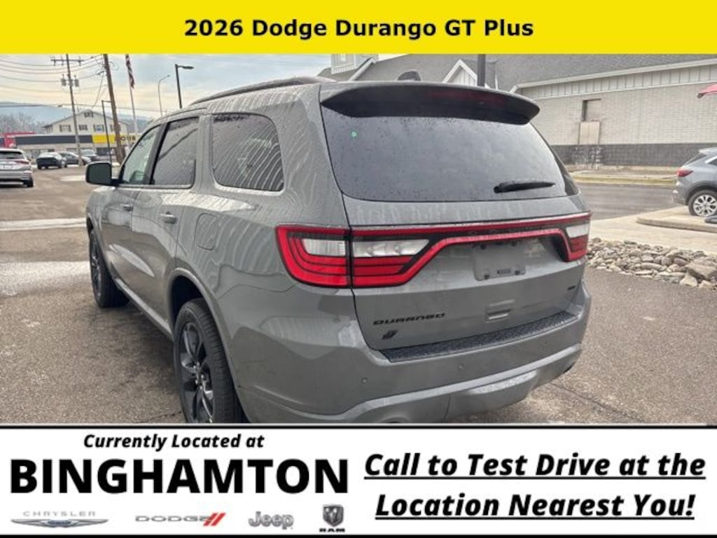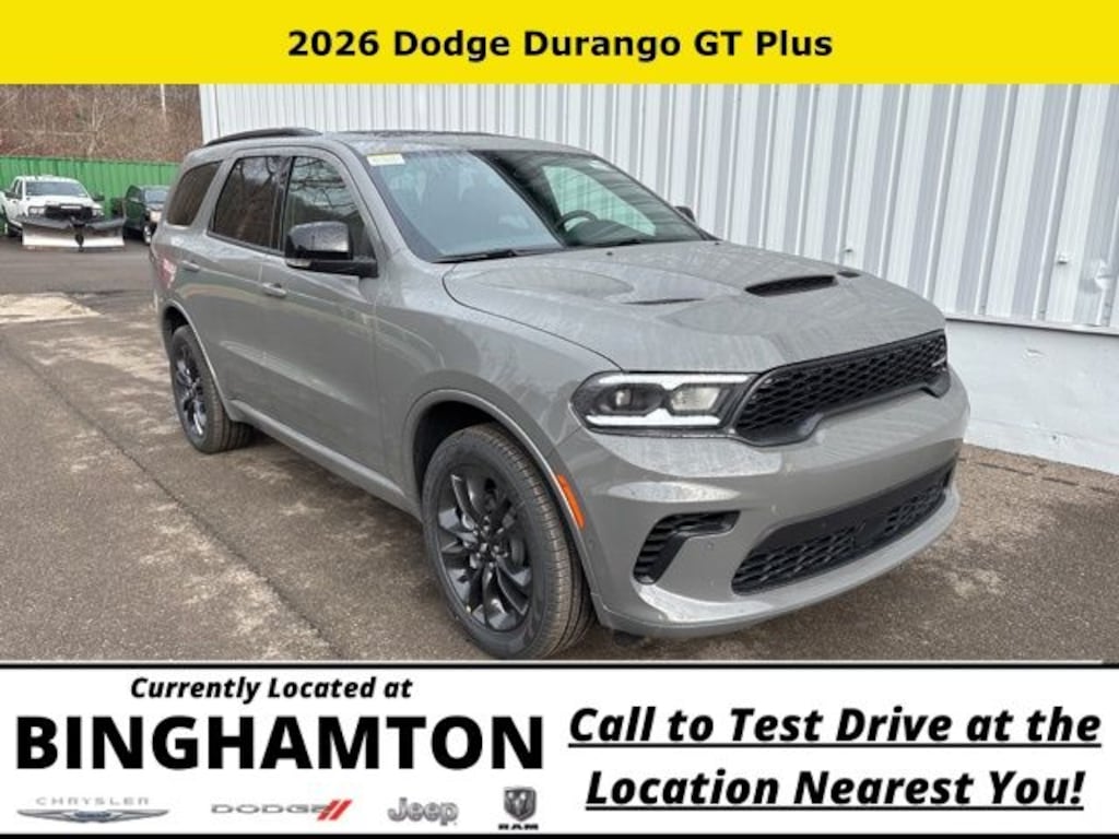Destroyer Gray Clearcoat 2026 Dodge Durango GT Plus AWD 8-Speed Automatic 3.6L V6 24V VVT Save Time at the Dealership by Customizing your Deal Online!, AWD, 115V Auxiliary Power Outlet, 180 Amp Alternator, 3.45 Rear Axle Ratio, 3rd row seats: split-bench, 4-Wheel Disc Brakes, 506 Watt Amplifier, 6 Speakers, 7 and 4 Pin Wiring Harness, 9 Alpine Amplified Speakers with Subwoofer, ABS brakes, Adaptive Cruise Control with Stop, Advanced Brake Assist, Air Conditioning, Alloy wheels, AM/FM radio: SiriusXM w/360L, Apple CarPlay/Android Auto, Auto High Beam Headlamp Control, Auto-Dimming Exterior Driver Mirror, Auto-dimming Rear-View mirror, Automatic temperature control, Black Roof Rails, Blacktop Package, Blind Spot with Trailer Detection, Brake assist, Bright Cargo Area Scuff Pads, Bumpers: body-color, Class IV Receiver Hitch, Cloth Bucket Seats with Shift Insert, Compass, Delay-off headlights, Driver door bin, Driver vanity mirror, Dual front impact airbags, Dual front side impact airbags, Dual Remote USB Port - Charge Only, Electronic Stability Control, Emergency communication system: Dodge Connect, Exterior Mirrors with Heating Element, Exterior Mirrors with Memory, Exterior Mirrors with Supplemental Signals, Four wheel independent suspension, Front anti-roll bar, Front Bucket Seats, Front Center Armrest w/Storage, Front dual zone A/C, Front License Plate Bracket, Front reading lights, Full Speed Forward Collision Warning Plus, Fully automatic headlights, Garage door transmitter, Gloss Black Badges, Gloss Black Exterior Mirrors, GT Gloss Black Badging, Heated door mirrors, Heated front seats, Heated Second Row Seats, Heated steering wheel, Heavy-Duty Engine Cooling, Illuminated entry, Integrated Roof Rail Crossbars, Knee airbag, Lane Departure Warning Plus, Leather steering wheel, Leather Trimmed Bucket Seats, Leather Wrapped Door Panels, LED Auxiliary Low Beam and Turn Signal, Low tire pressure warning, MyFlexCare Service Plan, Navigation System, Occupant sensing airbag, Outside temperature display, Overhead airbag, Overhead console, Panic alarm, ParkSense Front/Rear Park Assist with Stop, ParkView Rear Back-Up Camera, Passenger door bin, Passenger vanity mirror, Power 6x9 Multi-Function Foldaway Mirrors, Power 8-Way Driver Memory 8-Way Passenger Seats, Power door mirrors, Power driver seat, Power Driver/Passenger 4-Way Lumbar Adjust, Power Liftgate, Power steering, Power Sunroof, Power Tilt and Telescopic Steering Column, Power windows, Quick Order Package 2BH GT Plus, Radio data system, Radio: Uconnect 5 Nav with 10.1" Display, Rear air conditioning, Rear anti-roll bar, Rear Load Leveling Suspension, Rear reading lights, Rear seat center armrest, Rear window defroster, Rear window wiper, Red Accent Stitching, Remote keyless entry, Satin Black Dodge Tail Lamp Badge, Security Alarm, Speed control, Speed-sensing steering, Speed-Sensitive Wipers, Split folding rear seat, Spoiler, Sport steering wheel, Steering wheel mounted audio controls, Sun Visors with Illuminated Vanity Mirrors, Tachometer, Telescoping steering wheel, Tilt steering wheel, Traction control, Trailer Brake Control, Trip computer, Variably intermittent wipers, Ventilated Front Seats, Voltmeter, Wheels: 20" x 8" Black Noise Aluminum, Wheels: 20" x 8" Fine Silver, Wireless Charging Pad, AWD.