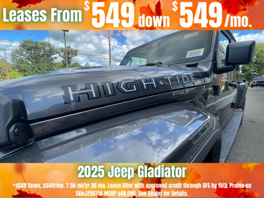 Granite Crystal Metallic Clearcoat 2025 Jeep Gladiator 4WD 8-Speed Automatic 3.6L V6 24V VVT 110 MPH Vehicle Max Speed Calibration, 12.3" Touchscreen Display, 3.73 Rear Axle Ratio, 4-Wheel Disc Brakes, 4G LTE Wi-Fi Hot Spot, 8 Speakers, 97 MPH Vehicle Max Speed Calibration, ABS brakes, Advanced Brake Assist, Air Conditioning, Alexa Built-In, AM/FM radio: SiriusXM, Apple CarPlay, Apple CarPlay/Android Auto, Automatic Headlamps, Bluetooth, Body Color 3-Piece Hard Top, Body Color Fender Flares (2-Piece), Brake assist, Cloth Low-Back Bucket Seats, Compass, Connectivity - US/Canada, Convenience Group, Corning Gorilla Glass, Daytime Running Lamp System, Deep Tint Sunscreen Windows, Delay-off headlights, Driver door bin, Driver vanity mirror, Dual front impact airbags, Dual front side impact airbags, Electronic Stability Control, Emergency/Assistance Call, Freedom Panel Storage Bag, Front anti-roll bar, Front Bucket Seats, Front Center Armrest w/Storage, Front Door Locks 2-Door Passive Entry, Front fog lights, Front License Plate Bracket, Front reading lights, Full Length Floor Console Premium Armrest, Full Speed Forward Collision Warning Plus, Google Android Auto, Hard Seat Back, Heated Front Seats, Heated Steering Wheel, High Tide, High Tide Tailgate & Hood Decals, Illuminated entry, Integrated Radar Camera Module (IRCM), Integrated roll-over protection, Leather Wrapped Park Brake Handle, Leather Wrapped Shift Knob, Low tire pressure warning, MOPAR All-Weather Slush Mats, Normal Duty Suspension, Occupant sensing airbag, Outside temperature display, Overhead airbag, Panic alarm, ParkView Rear Back-Up Camera, Passenger door bin, Passenger vanity mirror, Power 4-Way Driver Lumbar Adjust, Power 4-Way Passenger Lumbar Adjust, Power Adjust 8-Way Driver Seat, Power Adjust 8-Way Front Passenger Seat, Power Heated Mirrors, Power steering, Power windows, Premium Door Trim Panel, Premium McKinley Trimmed Seats, Premium Wrapped Steering Wheel, Quick Order Package 24Q High Tide, Radio data system, Radio: Uconnect 5 w/12.3" Display, Rear anti-roll bar, Rear Armrest w/Cupholder Seat, Rear reading lights, Rear Sliding Window, Rear Window Defroster, Remote keyless entry, Remote Start System, Security Alarm, Side Steps, Speed control, Split folding rear seat, Steering wheel mounted audio controls, Sun Visors w/Illuminated Vanity Mirrors, Tachometer, Telescoping steering wheel, Tilt steering wheel, Traction control, Trip computer, Universal Garage Door Opener, USB Host Flip, Variably intermittent wipers, Wheels: 17" x 7.5" Black Steel Styled, Wheels: 17" x 7.5" Painted Black, Willys Suspension.