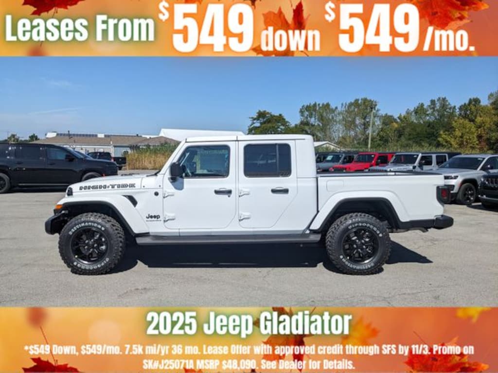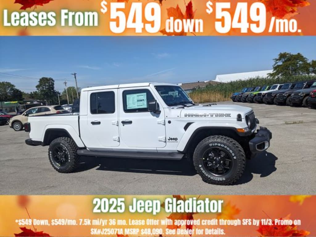 Bright White Clearcoat 2025 Jeep Gladiator 4WD 8-Speed Automatic 3.6L V6 24V VVT Save Time at the Dealership by Customizing your Deal Online!, 110 MPH Vehicle Max Speed Calibration, 12.3" Touchscreen Display, 3.73 Rear Axle Ratio, 4-Wheel Disc Brakes, 4G LTE Wi-Fi Hot Spot, 8 Speakers, 97 MPH Vehicle Max Speed Calibration, ABS brakes, Advanced Brake Assist, Air Conditioning, Alexa Built-In, AM/FM radio: SiriusXM, Apple CarPlay, Apple CarPlay/Android Auto, Automatic Headlamps, Body Color 3-Piece Hard Top, Body Color Fender Flares (2-Piece), Brake assist, Cloth Low-Back Bucket Seats, Compass, Connectivity - US/Canada, Convenience Group, Corning Gorilla Glass, Daytime Running Lamp System, Deep Tint Sunscreen Windows, Delay-off headlights, Driver door bin, Driver vanity mirror, Dual front impact airbags, Dual front side impact airbags, Electronic Stability Control, Emergency/Assistance Call, Freedom Panel Storage Bag, Front anti-roll bar, Front Bucket Seats, Front Center Armrest w/Storage, Front Door Locks 2-Door Passive Entry, Front fog lights, Front License Plate Bracket, Front reading lights, Full Length Floor Console Premium Armrest, Full Speed Forward Collision Warning Plus, Google Android Auto, Hard Seat Back, Heated Front Seats, Heated Steering Wheel, High Tide, High Tide Tailgate & Hood Decals, Illuminated entry, Integrated Radar Camera Module (IRCM), Integrated roll-over protection, Leather Wrapped Park Brake Handle, Leather Wrapped Shift Knob, Low tire pressure warning, Manufacturer's Statement of Origin, Normal Duty Suspension, Occupant sensing airbag, Outside temperature display, Overhead airbag, Panic alarm, ParkView Rear Back-Up Camera, Passenger door bin, Passenger vanity mirror, Power 4-Way Driver Lumbar Adjust, Power 4-Way Passenger Lumbar Adjust, Power Adjust 8-Way Driver Seat, Power Adjust 8-Way Front Passenger Seat, Power Heated Mirrors, Power steering, Power windows, Premium Door Trim Panel, Premium McKinley Trimmed Seats, Premium Wrapped Steering Wheel, Quick Order Package 24Q High Tide, Radio data system, Radio: Uconnect 5 w/12.3" Display, Rear anti-roll bar, Rear Armrest w/Cupholder Seat, Rear reading lights, Rear Sliding Window, Rear Window Defroster, Remote keyless entry, Remote Start System, Security Alarm, Side Steps, Speed control, Split folding rear seat, Steering wheel mounted audio controls, Sun Visors w/Illuminated Vanity Mirrors, Tachometer, Telescoping steering wheel, Tilt steering wheel, Traction control, Trip computer, Universal Garage Door Opener, USB Host Flip, Variably intermittent wipers, Voltmeter, Wheels: 17" x 7.5" Black Steel Styled, Wheels: 17" x 7.5" Painted Black, Willys Suspension.