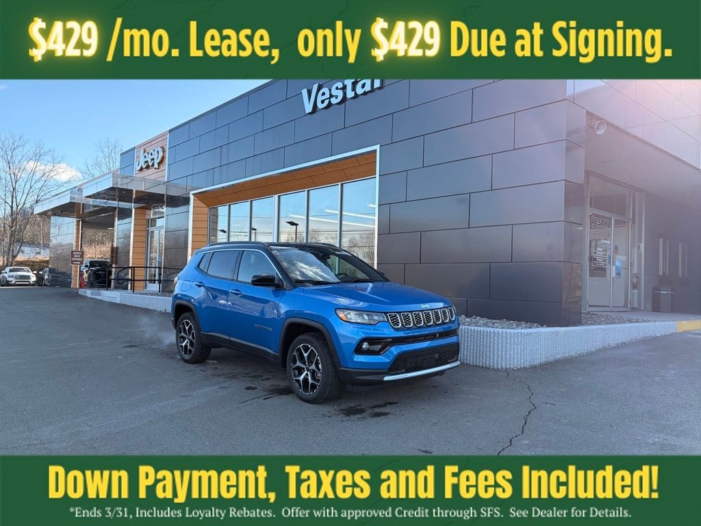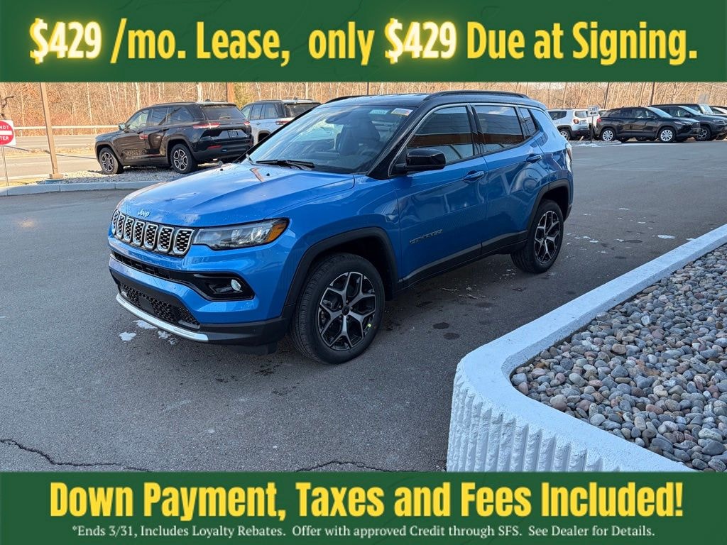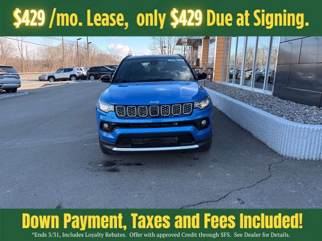 hydro blue pearlcoat 2026 Jeep Compass Limited 4WD 8-Speed Automatic 2.0L I4 DOHC 4WD, 10.1" Touchscreen Display, 3.73 Final Drive Ratio, 4-Wheel Disc Brakes, 4G LTE Wi-Fi Hot Spot, 6 Speakers, ABS brakes, Air Conditioning, Alloy wheels, AM/FM radio: SiriusXM, Auto High-beam Headlights, Auto-dimming Rear-View mirror, Automatic temperature control, Brake assist, Bumpers: body-color, Compass, Delay-off headlights, Driver door bin, Driver vanity mirror, Dual front impact airbags, Dual front side impact airbags, Electronic Stability Control, Emergency communication system: SiriusXM Guardian, Four wheel independent suspension, Front anti-roll bar, Front Bucket Seats, Front Center Armrest w/Storage, Front dual zone A/C, Front fog lights, Front License Plate Bracket, Front reading lights, Fully automatic headlights, Global Telematics Box Module, Heated door mirrors, Heated front seats, Heated steering wheel, Illuminated entry, Knee airbag, Leather Shift Knob, Leather steering wheel, Leatherette Seats, Low tire pressure warning, Occupant sensing airbag, Outside temperature display, Overhead airbag, Overhead console, Panic alarm, ParkView Rear Back-Up Camera, Passenger door bin, Passenger vanity mirror, Power door mirrors, Power driver seat, Power Liftgate, Power steering, Power windows, Premium audio system: UConnect 5, Quick Order Package 29G Limited, Radio: Uconnect 5 with 10.1" Display, Rain sensing wipers, Rear anti-roll bar, Rear seat center armrest, Rear window defroster, Rear window wiper, Remote keyless entry, Security system, SiriusXM Guardian - Included Trail (B), SiriusXM Radio Service, Speed control, Split folding rear seat, Spoiler, Steering wheel mounted audio controls, Tachometer, Telescoping steering wheel, Tilt steering wheel, Traction control, Trip computer, Turn signal indicator mirrors, Variably intermittent wipers, Wheels: 18" x 7" Painted Diamond Cut Aluminum, 4WD.