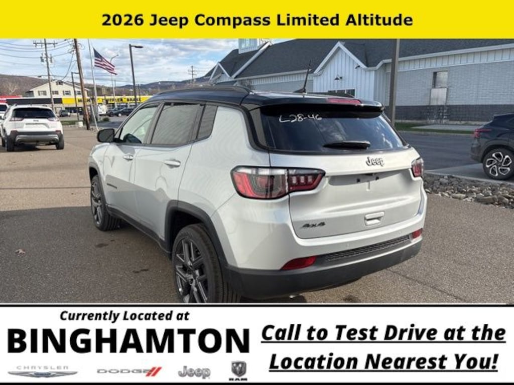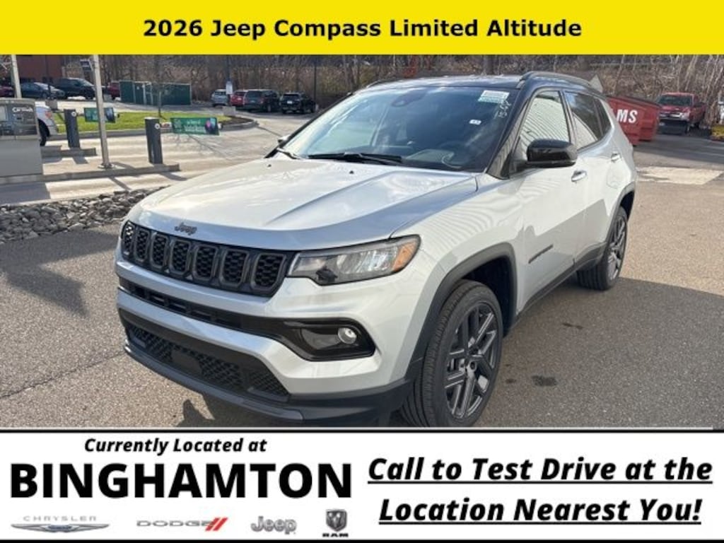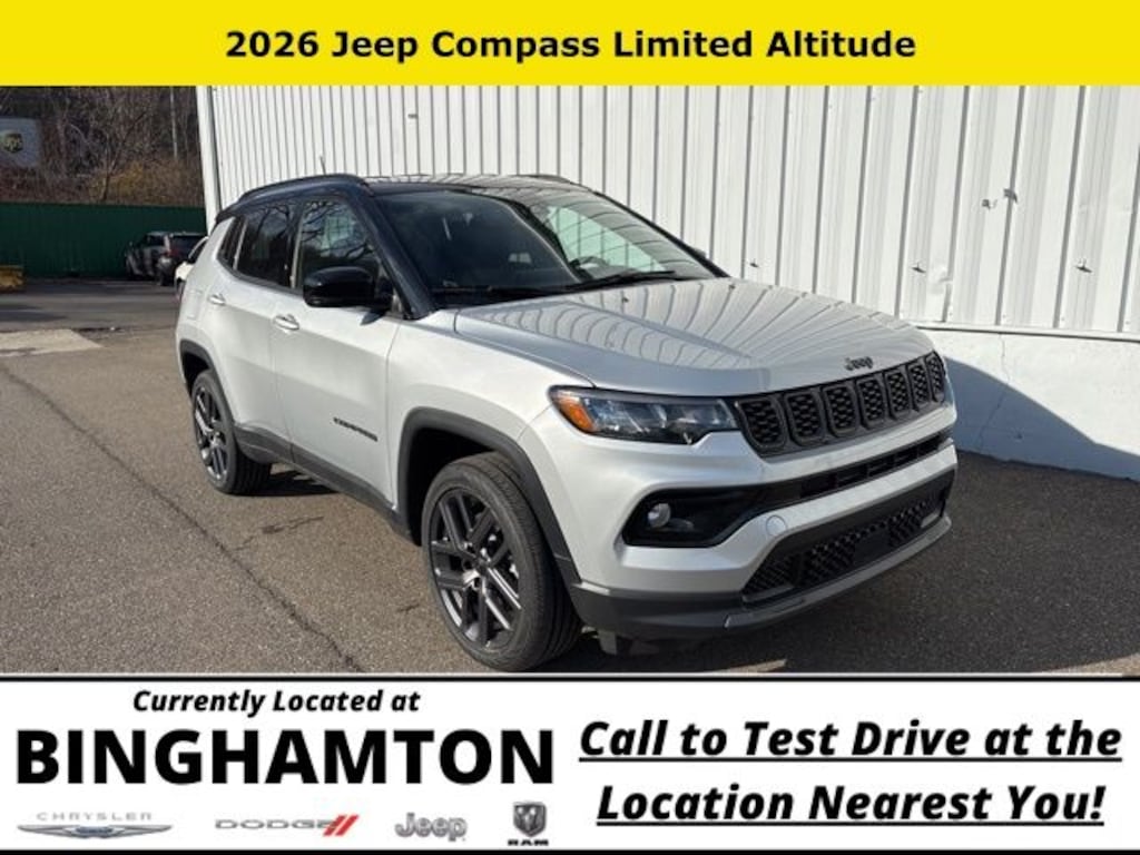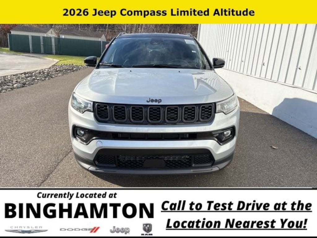Silver Zynith Metallic Clearcoat 2026 Jeep Compass Limited 4WD 8-Speed Automatic 2.0L I4 DOHC Save Time at the Dealership by Customizing your Deal Online!, 4WD, 10.1" Touchscreen Display, 3.73 Final Drive Ratio, 4-Wheel Disc Brakes, 4G LTE Wi-Fi Hot Spot, 6 Speakers, ABS brakes, Air Conditioning, Alloy wheels, AM/FM radio: SiriusXM, Auto High-beam Headlights, Auto-dimming Rear-View mirror, Automatic temperature control, Black Day Light Opening Moldings, Brake assist, Bumpers: body-color, Compass, Delay-off headlights, Driver door bin, Driver vanity mirror, Dual front impact airbags, Dual front side impact airbags, Electronic Stability Control, Emergency communication system: SiriusXM Guardian, Four wheel independent suspension, Front anti-roll bar, Front Bucket Seats, Front Center Armrest w/Storage, Front dual zone A/C, Front fog lights, Front License Plate Bracket, Front reading lights, Fully automatic headlights, Global Telematics Box Module, Gloss Black Surround/Neutral Gray Rings, Heated door mirrors, Heated front seats, Heated steering wheel, Illuminated entry, Knee airbag, Leather Shift Knob, Leather steering wheel, Leatherette Seats, Limited Altitude Pack, Low tire pressure warning, Neutral Gray Exterior Accents, Neutral Gray Exterior Badging, Occupant sensing airbag, Outside temperature display, Overhead airbag, Overhead console, Panic alarm, ParkView Rear Back-Up Camera, Passenger door bin, Passenger vanity mirror, Piano Black Interior Accents, Power door mirrors, Power driver seat, Power Liftgate, Power steering, Power windows, Premium audio system: UConnect 5, Quick Order Package 29W Limited Altitude, Radio: Uconnect 5 with 10.1" Display, Rain sensing wipers, Rear anti-roll bar, Rear seat center armrest, Rear window defroster, Rear window wiper, Remote keyless entry, Security system, SiriusXM Guardian - Included Trail (B), SiriusXM Radio Service, Speed control, Split folding rear seat, Spoiler, Steering wheel mounted audio controls, Tachometer, Telescoping steering wheel, Tilt steering wheel, Traction control, Trip computer, Turn signal indicator mirrors, Variably intermittent wipers, Wheels: 18" x 7" Painted Diamond Cut Aluminum, Wheels: 19" x 7.5" Aluminum Painted, 4WD.