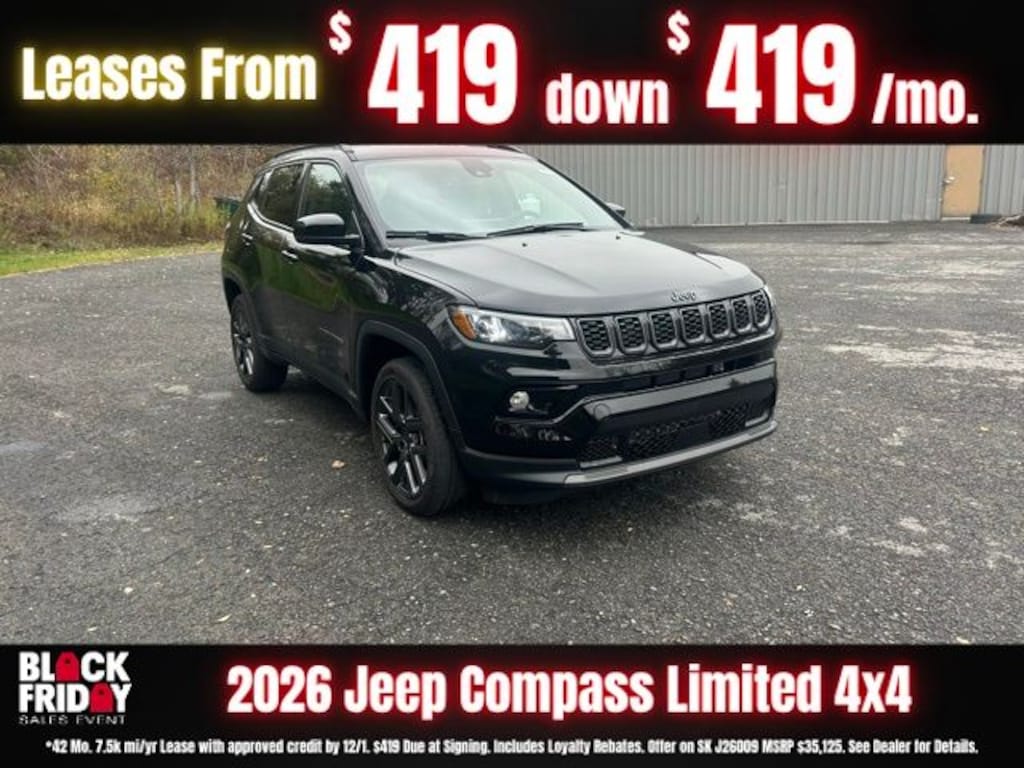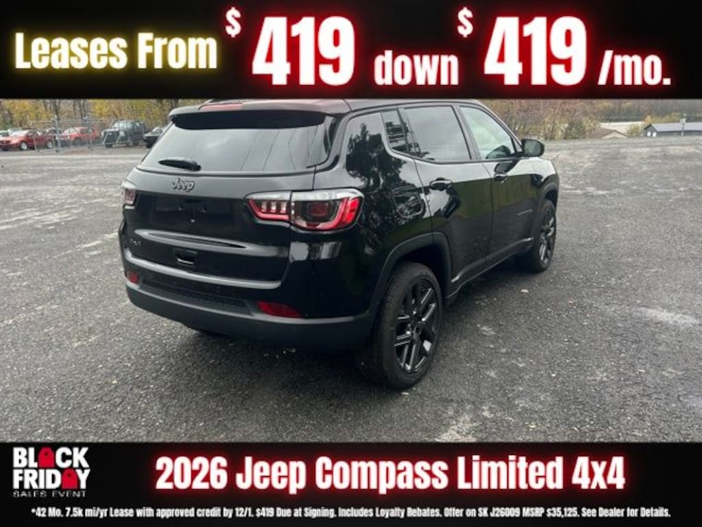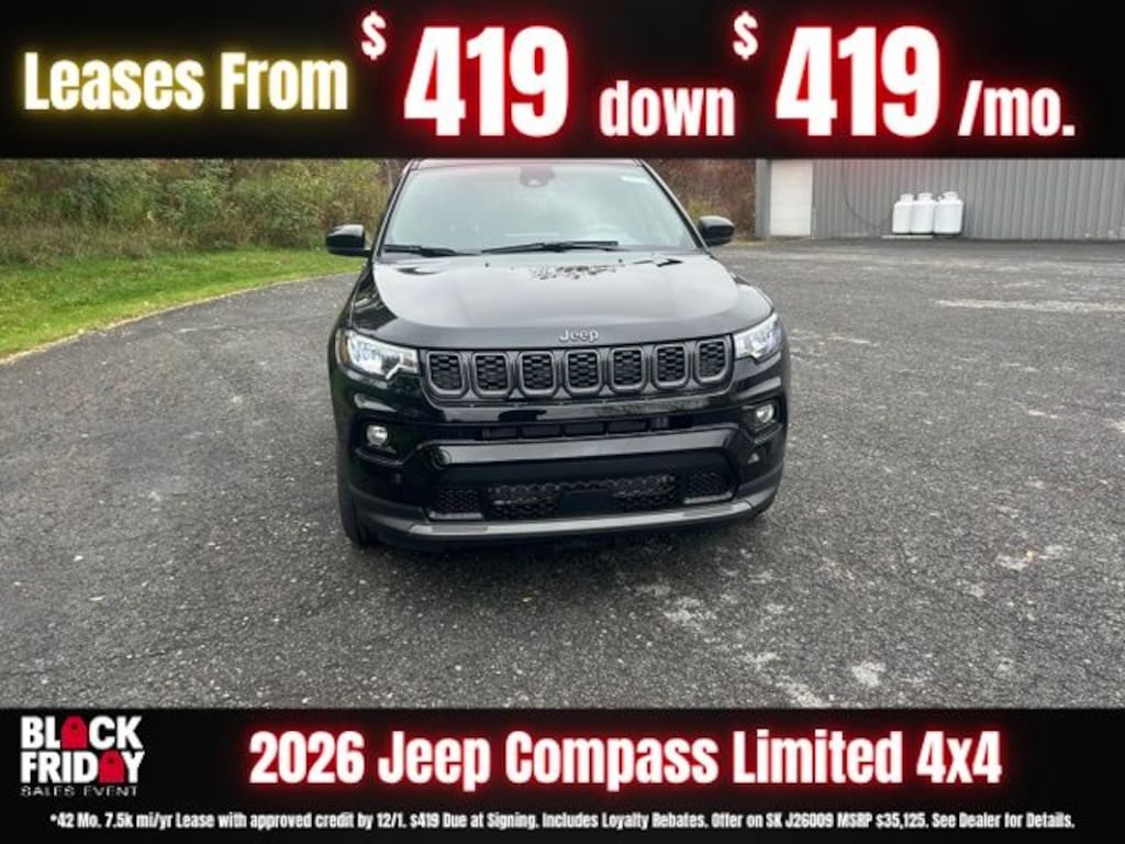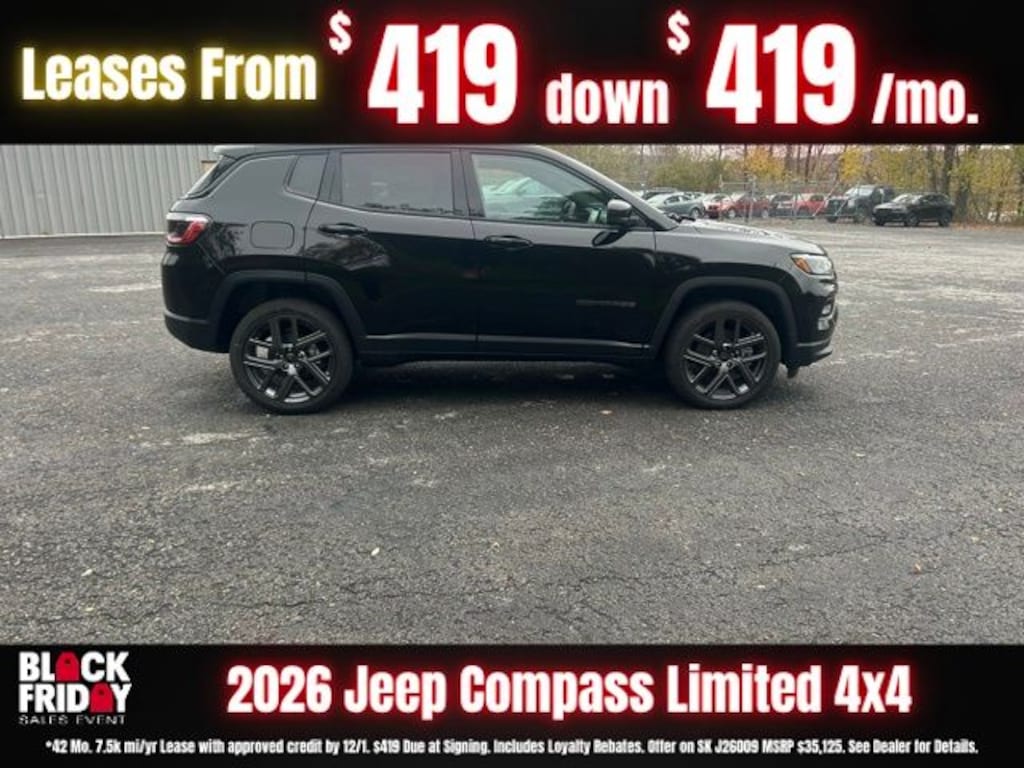 Diamond Black Crystal Pearlcoat 2026 Jeep Compass Limited 4WD 8-Speed Automatic 2.0L I4 DOHC Save Time at the Dealership by Customizing your Deal Online!, 4WD, 10.1" Touchscreen Display, 3.73 Final Drive Ratio, 4-Wheel Disc Brakes, 6 Speakers, ABS brakes, Air Conditioning, Alloy wheels, AM/FM radio: SiriusXM, Auto High-beam Headlights, Auto-dimming Rear-View mirror, Automatic temperature control, Black Day Light Opening Moldings, Brake assist, Bumpers: body-color, Compass, Delay-off headlights, Driver door bin, Driver vanity mirror, Dual front impact airbags, Dual front side impact airbags, Electronic Stability Control, Emergency communication system, Four wheel independent suspension, Front anti-roll bar, Front Bucket Seats, Front Center Armrest w/Storage, Front dual zone A/C, Front fog lights, Front License Plate Bracket, Front reading lights, Fully automatic headlights, Gloss Black Surround/Neutral Gray Rings, Heated door mirrors, Heated front seats, Heated steering wheel, Illuminated entry, Knee airbag, Leather Shift Knob, Leather steering wheel, Leatherette Seats, Limited Altitude Pack (DISC), Low tire pressure warning, Neutral Gray Exterior Accents, Neutral Gray Exterior Badging, Occupant sensing airbag, Outside temperature display, Overhead airbag, Overhead console, Panic alarm, ParkView Rear Back-Up Camera, Passenger door bin, Passenger vanity mirror, Piano Black Interior Accents, Power door mirrors, Power driver seat, Power Liftgate, Power steering, Power windows, Quick Order Package 29W Limited Altitude, Radio: Uconnect 5 w/10.1" Display, Rain sensing wipers, Rear anti-roll bar, Rear seat center armrest, Rear window defroster, Rear window wiper, Remote keyless entry, Security system, Speed control, Split folding rear seat, Spoiler, Steering wheel mounted audio controls, Tachometer, Telescoping steering wheel, Tilt steering wheel, Traction control, Trip computer, Turn signal indicator mirrors, Variably intermittent wipers, Wheels: 18" x 7" Painted Diamond Cut Aluminum, Wheels: 19" x 7.5" Aluminum Painted, 4WD.