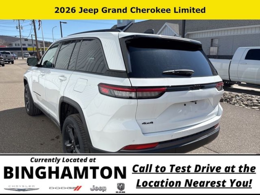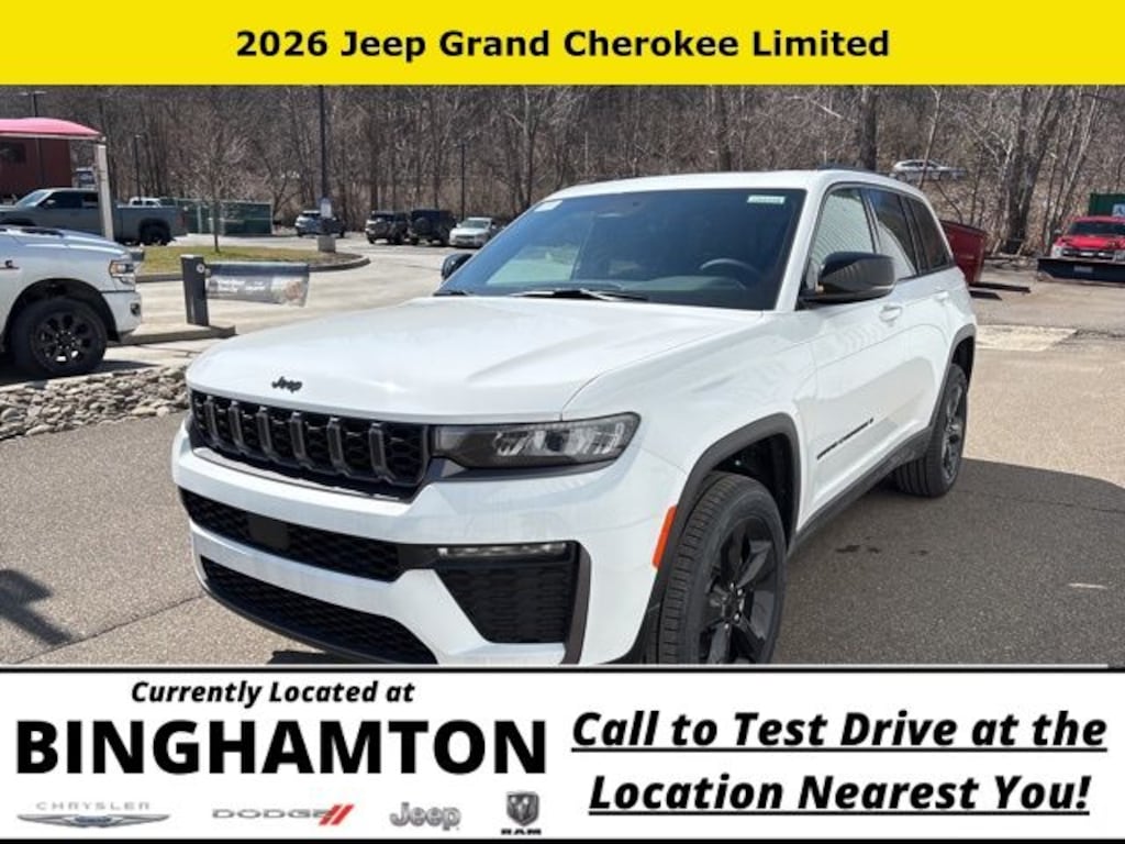 Bright White Clearcoat 2026 Jeep Grand Cherokee Limited 4WD 8-Speed Automatic 2.0L I4 PDI Turbocharged DOHC 16V LEV3-SULEV30 324hp Save Time at the Dealership by Customizing your Deal Online!, 4WD, 10 Speakers, 3.70 Rear Axle Ratio, 4-Wheel Disc Brakes, 4G LTE Wi-Fi Hot Spot, ABS brakes, Active Noise Control System, Air Conditioning, Alloy wheels, AM/FM radio: SiriusXM with 360L, Anti-whiplash front head restraints, Apple CarPlay, AppLink/Apple CarPlay and Android Auto, Audio memory, Auto High-beam Headlights, Automatic temperature control, Auxiliary Battery, Brake assist, Bumpers: body-color, Capri Leatherette Seats, Compass, Connectivity - US/Canada, Delay-off headlights, Delete Limited Badge, Disassociated Touchscreen Display, Driver door bin, Driver vanity mirror, Dual front impact airbags, Dual front side impact airbags, Dual-Pane Panoramic Sunroof, Electronic Stability Control, Emergency communication system, Exterior Accents Dark Neutral Metallic, For Details, Visit DriveUconnect.com, Four wheel independent suspension, Front anti-roll bar, Front Bucket Seats, Front Center Armrest w/Storage, Front dual zone A/C, Front fog lights, Front License Plate Bracket, Front reading lights, Fully automatic headlights, Garage door transmitter, Global Telematics Box Module (TBM), Gloss Black Exterior Mirrors, Google Android Auto, GPS Antenna Input, Heated door mirrors, Heated Exterior Mirrors, Heated front seats, Heated rear seats, Heated steering wheel, Illuminated entry, Integrated Center Stack Radio, Integrated Voice Command with Bluetooth, Knee airbag, Limited Altitude Package, Low tire pressure warning, Manual Folding Exterior Mirrors, Memory seat, MyFlexCare Service Plan, Navigation System, Normal Duty Suspension, Occupant sensing airbag, Outside temperature display, Overhead airbag, Overhead console, Panic alarm, ParkView Rear Back-Up Camera, Passenger door bin, Passenger vanity mirror, Power door mirrors, Power driver seat, Power Liftgate, Power passenger seat, Power steering, Power windows, Quick Order Package 2BE Limited, Radio data system, Radio: Uconnect 5 Nav with 12.3" Display, Rear anti-roll bar, Rear reading lights, Rear window defroster, Rear window wiper, Remote keyless entry, Security system, Speed control, Speed-Sensitive Wipers, Split folding rear seat, Spoiler, Steering wheel mounted audio controls, Tachometer, Telescoping steering wheel, Tilt steering wheel, Traction control, Trip computer, Turn signal indicator mirrors, USB Host Flip, Variably intermittent wipers, Voltmeter, Wheels: 18" x 8.0" Polished/Painted Aluminum, Wheels: 20" x 8.5" Gloss Black Painted Aluminum, 4WD.