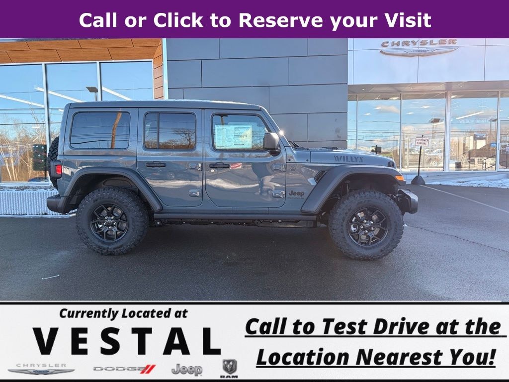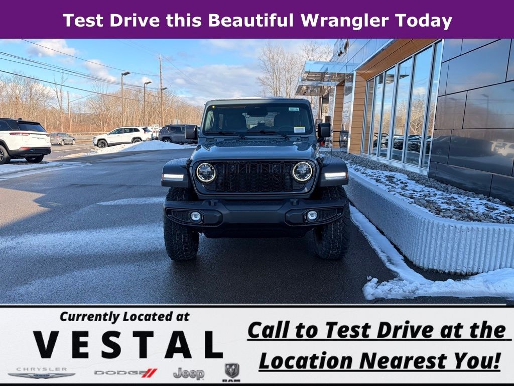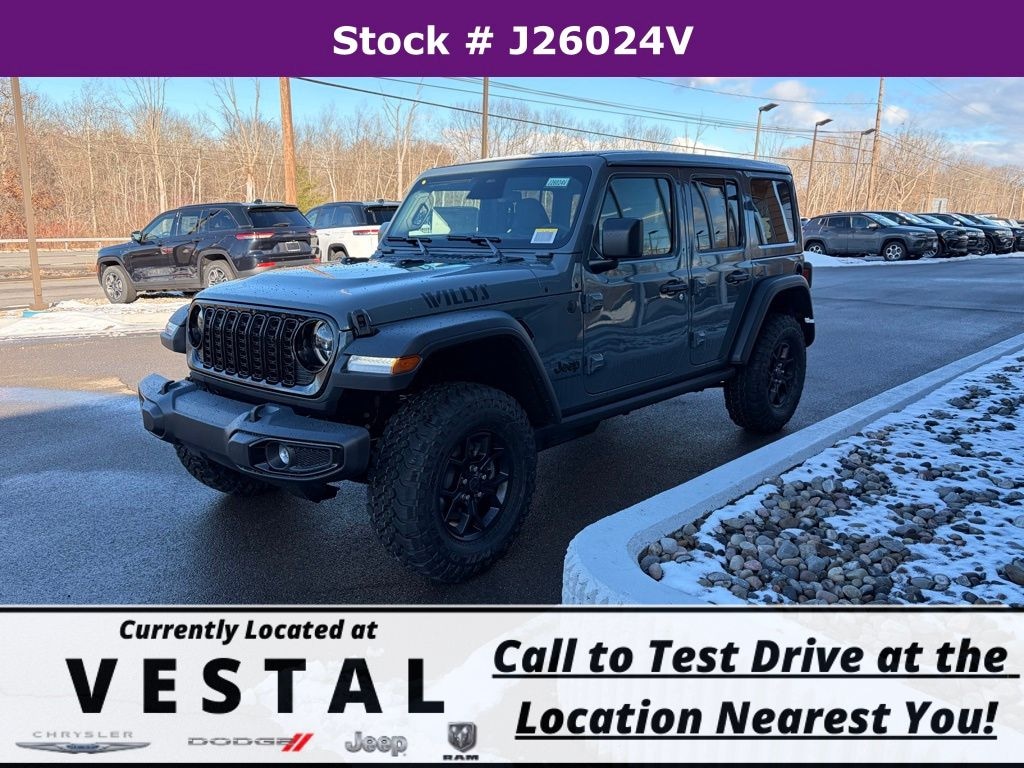Anvil Clear Coat 2026 Jeep Wrangler Willys 4WD 8-Speed Automatic 2.0L I4 DOHC 12.3" Touchscreen Display, 2-Door Passive Entry, Front Door Locks, 4-Wheel Disc Brakes, 4-Wheel Drive Swing Gate Decal, 4G LTE Wi-Fi Hot Spot, 7 and 4 Pin Wiring Harness, 8 Speakers, ABS brakes, Advanced Brake Assist, Air Conditioning, Air Conditioning with Auto Temp Control, Air Filtering, AM/FM radio: SiriusXM with 360L, Apple CarPlay, Apple CarPlay/Android Auto, Automatic Headlamps, Aux Battery, Auxiliary Switches, Black Grille with Gloss Black Rings, Brake assist, Class II Receiver Hitch, Cluster 7.0" TFT Color Display, Compass, Connectivity - US/Canada, Convenience Group, Conventional Differential Front Axle, Corning Gorilla Glass, Dana M210 Wide HD Tube Front Axle, Dana M220 Wide Rear Axle, Daytime Running Lamps LED Accents, Deep Tint Sunscreen Windows, Delay-off headlights, Driver door bin, Driver vanity mirror, Dual front impact airbags, Dual front side impact airbags, E-Locker Rear Axle, Electronic Stability Control, Emergency/Assistance Call, Enhanced Adaptive Cruise Control, For More Info, Call 800-643-2112, Front anti-roll bar, Front Bucket Seats, Front Center Armrest w/Storage, Front fog lights, Front LED Fog Lamps, Front reading lights, Full Speed Forward Collision Warning Plus, Google Android Auto, Heated Front Seats, Heated Steering Wheel, Illuminated entry, Injection Molded Black Rear Bumper, Integrated Center Stack Radio, Integrated roll-over protection, LED Premium Reflector Headlamps, Low tire pressure warning, Manufacture Statement of Origin, Mold in Color Bumper with Gloss Black, Molded in Color Rubicon Highline Flare, MOPAR All-Weather Floor Mats, Non-Lock Fuel Cap Without Discriminator, Normal Duty Suspension, Occupant sensing airbag, Off-Road Plus Mode, Outside temperature display, Overhead airbag, Panic alarm, ParkView Rear Back-Up Camera, Passenger door bin, Passenger vanity mirror, Power Dome Dual Vented Hood, Power Heated Mirrors, Power steering, Power Top Quarter Window Storage Bag, Power windows, Premium Wrapped Steering Wheel, Quick Order Package 22W Willys, Radio data system, Radio: Uconnect 5 with 12.3" Display, Rear anti-roll bar, Rear reading lights, Rear Window Defroster, Rear Window Wiper/Washer, Remote keyless entry, Removable Rear Quarter Windows, Security Alarm, SiriusXM Radio Service, SiriusXM with 360L, Sky One-Touch Power Top, Speed control, Split folding rear seat, Steel Power Dome Hood Package, Steering wheel mounted audio controls, Stop-Start Dual Battery System, Sun Visors with Illuminated Vanity Mirrors, Tachometer, Telescoping steering wheel, Tilt steering wheel, Traction control, Trip computer, Universal Garage Door Opener, Variably intermittent wipers, Wheels: 17" x 7.5" Black Steel Styled, Wheels: 17" x 7.5" Painted Black, Willy's Suspension, Willys Hood Decal.