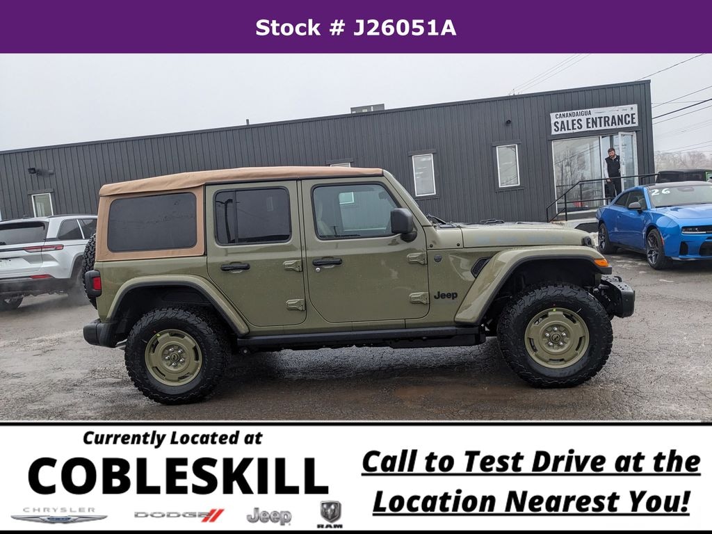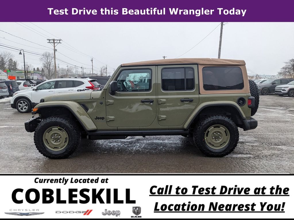 Save Time at the Dealership by Customizing your Deal Online!, Service Records on File, 12.3" Touchscreen Display, 4-Wheel Disc Brakes, 4G LTE Wi-Fi Hot Spot, 4WD Willys '41 Swing Gate Decal, 7 and 4 Pin Wiring Harness, 8 Speakers, 97 MPH Vehicle Max Speed Calibration, ABS brakes, Adaptive Cruise Control with Stop, Advanced Brake Assist, Air Conditioning, AM/FM radio: SiriusXM with 360L, Apple CarPlay, Apple CarPlay/Android Auto, Automatic Headlamps, Aux Battery, Auxiliary Switches, Body Color Grille with Gloss Black Rings, Body Color Rubicon Highline Flare, Brake assist, Class II Receiver Hitch, Cloth Low-Back Bucket Seats, Compass, Connectivity - US/Canada, Conventional Differential Front Axle, Corning Gorilla Glass, Dana M210 Wide HD Tube Front Axle, Dana M220 Wide Rear Axle, Daytime Running Lamps LED Accents, Deep Tint Sunscreen Windows, Delay-off headlights, Driver door bin, Driver vanity mirror, Dual front impact airbags, Dual front side impact airbags, E-Locker Rear Axle, Electronic Stability Control, For More Info, Call 800-643-2112, Front anti-roll bar, Front Bucket Seats, Front Center Armrest w/Storage, Front fog lights, Front LED Fog Lamps, Front reading lights, Full Speed Forward Collision Warning Plus, Google Android Auto, Illuminated entry, Integrated Center Stack Radio, Integrated roll-over protection, LED Premium Reflector Headlamps, Low tire pressure warning, MOPAR All-Weather Floor Mats, Myflexcare Service Plan, Non-Lock Fuel Cap Without Discriminator, Normal Duty Suspension, Occupant sensing airbag, Off-Road Plus Mode, Outside temperature display, Overhead airbag, Panic alarm, ParkView Rear Back-Up Camera, Passenger door bin, Passenger vanity mirror, Power Dome Dual Vented Hood, Power Heated Mirrors, Power steering, Power windows, Premium Tan Sunrider Soft Top, Premium Wrapped Steering Wheel, Quick Order Package 22H Willys 41, Radio data system, Radio: Uconnect 5 with 12.3" Display, Rear anti-roll bar, Rear reading lights, Remote keyless entry, Security Alarm, SiriusXM Radio Service, SiriusXM with 360L, Speed control, Split folding rear seat, Steel Front Bumper, Steel Power Dome Hood Package, Steel Rear Bumper, Steering wheel mounted audio controls, Stop-Start Dual Battery System, Sun Visors with Illuminated Vanity Mirrors, Tachometer, Telescoping steering wheel, Tilt steering wheel, Traction control, Trip computer, Variably intermittent wipers, Wheels: 17" x 7.5" Black Steel Styled, Wheels: 17" x 7.5" Fully Painted, Willys '41 Retro Edition Buzz Model, Willys '41 Retro Edition Hood Decal, Willys '41 Retro Edition Tailgate Plaque, Willys '41 Retro Edition Wrangler Decal, Willys '41 Retro Shift Bezel Insert, Willys '41 US Edition U.S. Hood Decal.