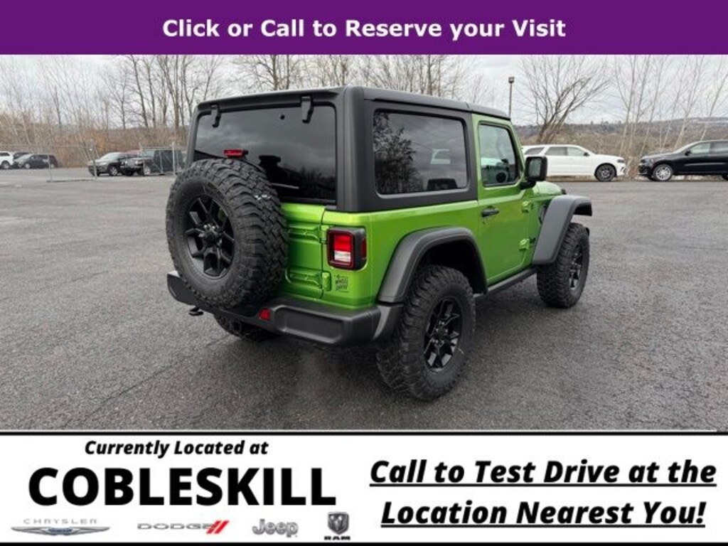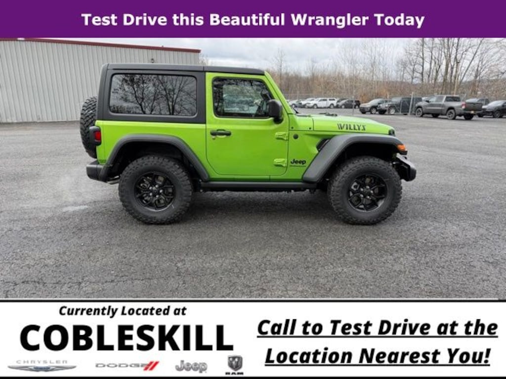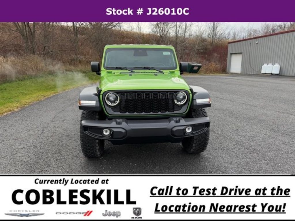 mojito clearcoat 2026 Jeep Wrangler Willys 4WD 8-Speed Automatic 2.0L I4 DOHC Save Time at the Dealership by Customizing your Deal Online!, 12.3" Touchscreen Display, 2-Door Passive Entry, Front Door Locks, 4-Wheel Disc Brakes, 4-Wheel Drive Swing Gate Decal, 4G LTE Wi-Fi Hot Spot, 7 and 4 Pin Wiring Harness, 8 Speakers, ABS brakes, Advanced Brake Assist, Air Conditioning, Air Conditioning with Auto Temp Control, Air Filtering, AM/FM radio: SiriusXM with 360L, Apple CarPlay, Apple CarPlay/Android Auto, Automatic Headlamps, Aux Battery, Auxiliary Switches, Black 3-Piece Hard Top, Black Grille, Brake assist, Class II Receiver Hitch, Cloth Low-Back Bucket Seats, Cluster 7.0" TFT Color Display, Compass, Connectivity - US/Canada, Convenience Group, Conventional Differential Front Axle, Corning Gorilla Glass, Dana M210 Wide HD Tube Front Axle, Dana M220 Wide Rear Axle, Daytime Running Lamps LED Accents, Deep Tint Sunscreen Windows, Delay-off headlights, Driver door bin, Driver vanity mirror, Dual front impact airbags, Dual front side impact airbags, E-Locker Rear Axle, Electronic Stability Control, Emergency/Assistance Call, Enhanced Adaptive Cruise Control, For More Info, Call 800-643-2112, Freedom Panel Storage Bag, Front anti-roll bar, Front Bucket Seats, Front Center Armrest w/Storage, Front fog lights, Front LED Fog Lamps, Front reading lights, Full Speed Forward Collision Warning Plus, Google Android Auto, Heated Front Seats, Heated Steering Wheel, Illuminated entry, Injection Molded Black Rear Bumper, Integrated Center Stack Radio, Integrated roll-over protection, LED Premium Reflector Headlamps, Low tire pressure warning, Mold in Color Bumper with Gloss Black, Molded in Color Rubicon Highline Flare, MOPAR All-Weather Floor Mats, Non-Lock Fuel Cap Without Discriminator, Normal Duty Suspension, Occupant sensing airbag, Off-Road Plus Mode, Outside temperature display, Overhead airbag, Panic alarm, ParkView Rear Back-Up Camera, Passenger door bin, Passenger vanity mirror, Power Heated Mirrors, Power steering, Power windows, Premium Wrapped Steering Wheel, Quick Order Package 22W Willys, Radio data system, Radio: Uconnect 5 with 12.3" Display, Rear anti-roll bar, Rear reading lights, Rear Window Defroster, Rear Window Wiper/Washer, Remote keyless entry, Security Alarm, SiriusXM Radio Service, SiriusXM with 360L, Speed control, Steering wheel mounted audio controls, Stop-Start Dual Battery System, Sun Visors with Illuminated Vanity Mirrors, Tachometer, Telescoping steering wheel, Tilt steering wheel, Traction control, Trip computer, Universal Garage Door Opener, Variably intermittent wipers, Wheels: 17" x 7.5" Black Steel Styled, Wheels: 17" x 7.5" Painted Black, Willy's Suspension, Willys Hood Decal.