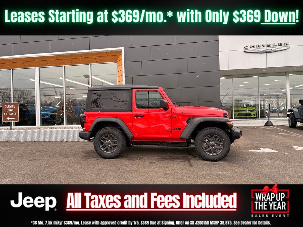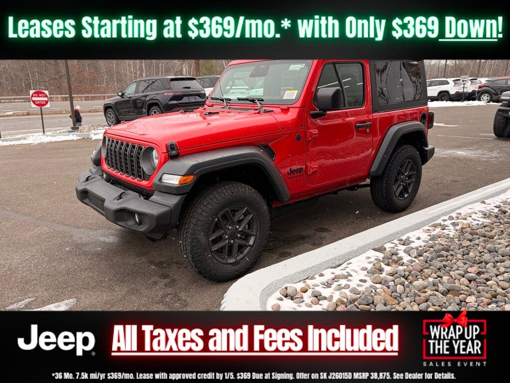 Firecracker Red Clearcoat 2026 Jeep Wrangler Sport S 2DR 4x4 4WD 8-Speed Automatic 2.0L I4 DOHC 3.45 Overall Top Gear Ratio, 4-Wheel Disc Brakes, 8 Speakers, ABS brakes, Advanced Brake Assist, Air Conditioning, AM/FM radio: SiriusXM with 360L, Apple CarPlay/Android Auto, Automatic Headlamps, Aux Battery, Brake assist, Cloth Low-Back Bucket Seats, Compass, Corning Gorilla Glass, Deep Tint Sunscreen Windows, Delay-off headlights, Driver door bin, Driver vanity mirror, Dual front impact airbags, Dual front side impact airbags, Electronic Stability Control, Enhanced Adaptive Cruise Control, Front anti-roll bar, Front Bucket Seats, Front Center Armrest w/Storage, Front fog lights, Front reading lights, Full Speed Forward Collision Warning Plus, Illuminated entry, Integrated roll-over protection, Low tire pressure warning, MOPAR All-Weather Floor Mats, Normal Duty Suspension, Occupant sensing airbag, Outside temperature display, Overhead airbag, Panic alarm, ParkView Rear Back-Up Camera, Passenger door bin, Passenger vanity mirror, Power Heated Mirrors, Power steering, Power windows, Premium Wrapped Steering Wheel, Quick Order Package 22S Sport S, Radio data system, Rear anti-roll bar, Rear reading lights, Remote keyless entry, Security Alarm, Speed control, Steering wheel mounted audio controls, Stop-Start Dual Battery System, Tachometer, Telescoping steering wheel, Tilt steering wheel, Traction control, Trip computer, Variably intermittent wipers, Wheels: 17" x 7.5" Black Steel Styled, Wheels: 17" x 7.5" Gray.