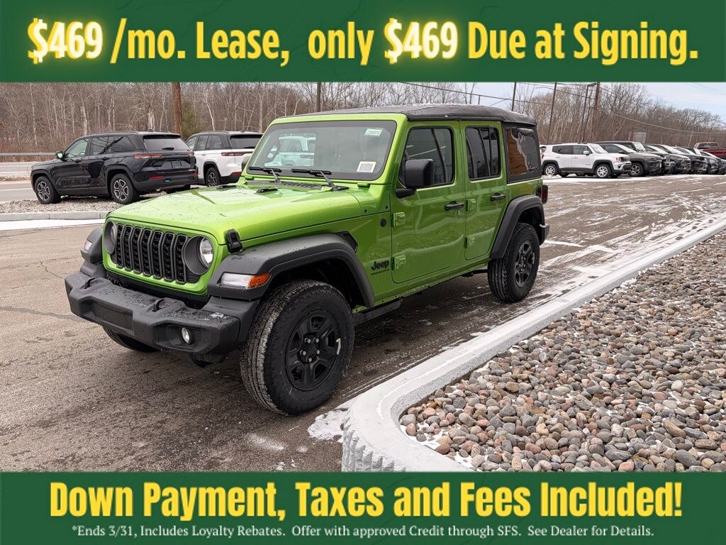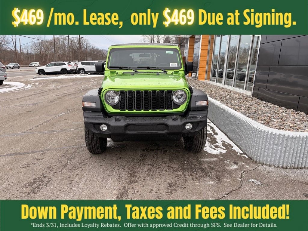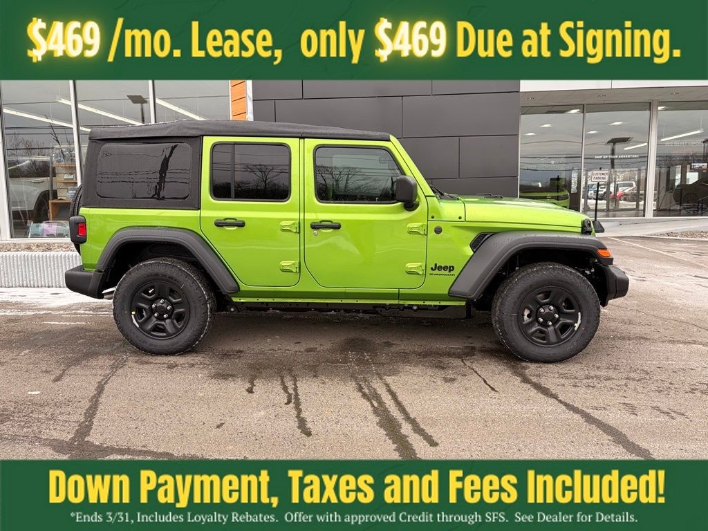 Mojito Clearcoat 2026 Jeep Wrangler Sport 4DR 4x4 4WD 8-Speed Automatic 3.6L V6 24V VVT 12.3" Touchscreen Display, 3.45 Overall Top Gear Ratio, 4-Wheel Disc Brakes, 4G LTE Wi-Fi Hot Spot, 8 Speakers, ABS brakes, Air Conditioning, AM/FM radio: SiriusXM with 360L, Apple CarPlay, Apple CarPlay/Android Auto, Aux Battery, Brake assist, Cloth Low-Back Bucket Seats, Compass, Connectivity - US/Canada, Deep Tint Sunscreen Windows, Delay-off headlights, Driver door bin, Driver vanity mirror, Dual front impact airbags, Dual front side impact airbags, Electronic Stability Control, For More Info, Call 800-643-2112, Front anti-roll bar, Front Bucket Seats, Front Center Armrest w/Storage, Front fog lights, Front reading lights, Google Android Auto, Illuminated entry, Integrated Center Stack Radio, Integrated roll-over protection, Low tire pressure warning, MOPAR All-Weather Floor Mats, Non-Lock Fuel Cap Without Discriminator, Normal Duty Suspension, Occupant sensing airbag, Outside temperature display, Overhead airbag, Panic alarm, ParkView Rear Back-Up Camera, Passenger door bin, Passenger vanity mirror, Power steering, Power windows, Quick Order Package 24B Sport, Radio data system, Radio: Uconnect 5 with 12.3" Display, Rear anti-roll bar, Rear reading lights, Remote keyless entry, SiriusXM Radio Service, SiriusXM with 360L, Speed control, Split folding rear seat, Steering wheel mounted audio controls, Stop-Start Dual Battery System, Tachometer, Telescoping steering wheel, Tilt steering wheel, Traction control, Trip computer, Variably intermittent wipers, Wheels: 17" x 7.5" Black Steel Styled.