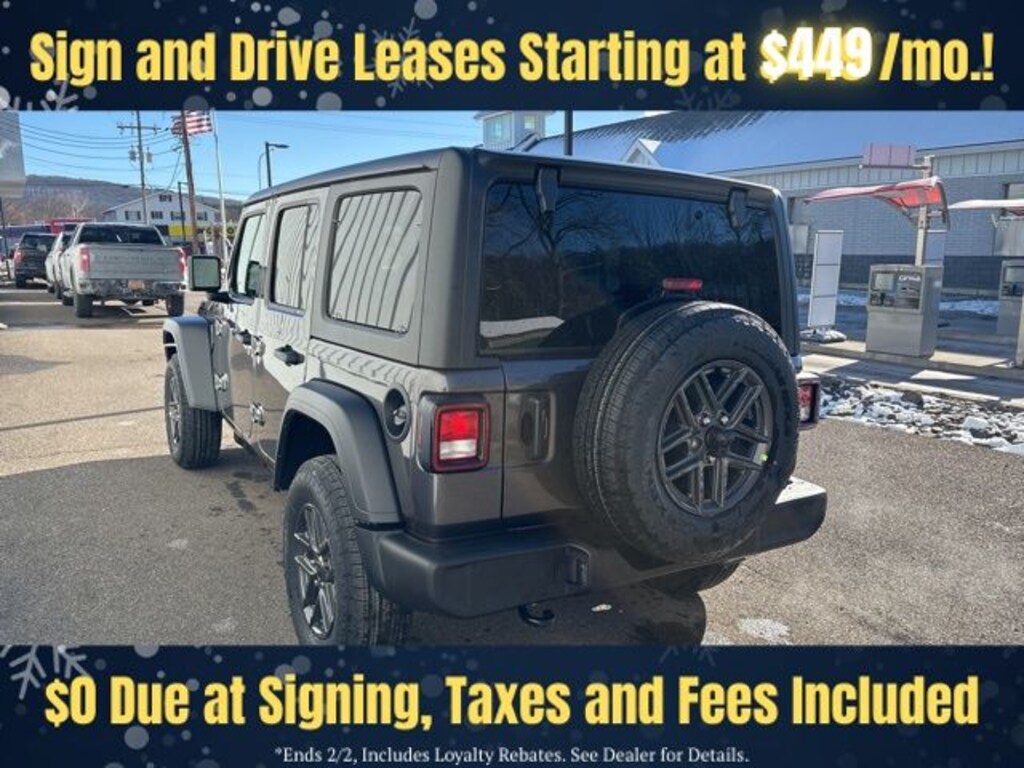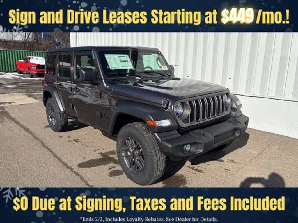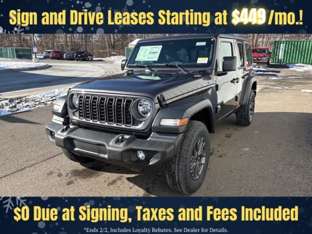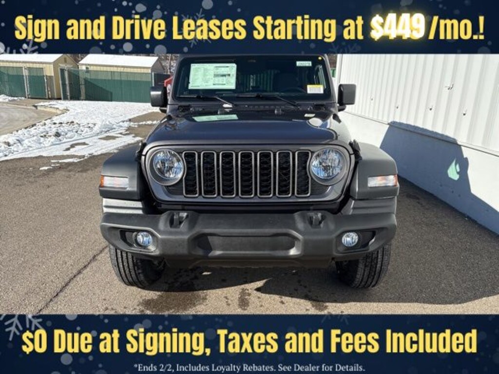 Granite Crystal Metallic Clearcoat 2026 Jeep Wrangler Sport S 4DR 4x4 4WD 8-Speed Automatic 3.6L V6 24V VVT Save Time at the Dealership by Customizing your Deal Online!, 12.3" Touchscreen Display, 2-Door Passive Entry, Front Door Locks, 3.45 Overall Top Gear Ratio, 4-Wheel Disc Brakes, 4G LTE Wi-Fi Hot Spot, 8 Speakers, ABS brakes, Advanced Brake Assist, Air Conditioning, Air Conditioning with Auto Temp Control, Air Filtering, AM/FM radio: SiriusXM with 360L, Apple CarPlay, Apple CarPlay/Android Auto, Automatic Headlamps, Aux Battery, Black 3-Piece Hard Top, Brake assist, Cloth Low-Back Bucket Seats, Cluster 7.0" TFT Color Display, Compass, Connectivity - US/Canada, Convenience Group, Corning Gorilla Glass, Deep Tint Sunscreen Windows, Delay-off headlights, Driver door bin, Driver vanity mirror, Dual front impact airbags, Dual front side impact airbags, Electronic Stability Control, Emergency/Assistance Call, Enhanced Adaptive Cruise Control, For More Info, Call 800-643-2112, Freedom Panel Storage Bag, Front anti-roll bar, Front Bucket Seats, Front Center Armrest w/Storage, Front fog lights, Front reading lights, Full Speed Forward Collision Warning Plus, Google Android Auto, Heated Front Seats, Heated Steering Wheel, Illuminated entry, Integrated Center Stack Radio, Integrated roll-over protection, Low tire pressure warning, Non-Lock Fuel Cap Without Discriminator, Normal Duty Suspension, Occupant sensing airbag, Outside temperature display, Overhead airbag, Panic alarm, ParkView Rear Back-Up Camera, Passenger door bin, Passenger vanity mirror, Power Heated Mirrors, Power steering, Power windows, Premium Wrapped Steering Wheel, Quick Order Package 24S Sport S, Radio data system, Radio: Uconnect 5 with 12.3" Display, Rear anti-roll bar, Rear reading lights, Rear Window Defroster, Rear Window Wiper/Washer, Remote keyless entry, Security Alarm, SiriusXM Radio Service, SiriusXM with 360L, Speed control, Split folding rear seat, Steering wheel mounted audio controls, Stop-Start Dual Battery System, Sun Visors with Illuminated Vanity Mirrors, Tachometer, Telescoping steering wheel, Tilt steering wheel, Traction control, Trip computer, Universal Garage Door Opener, Variably intermittent wipers, Wheels: 17" x 7.5" Black Steel Styled, Wheels: 17" x 7.5" Gray.