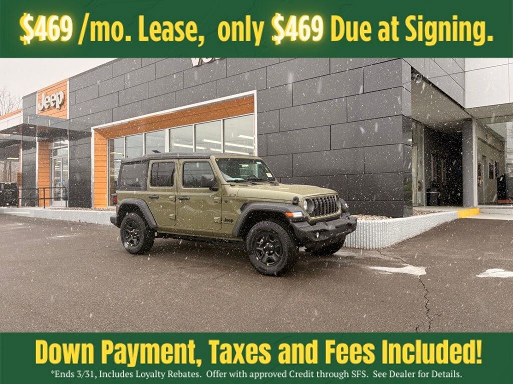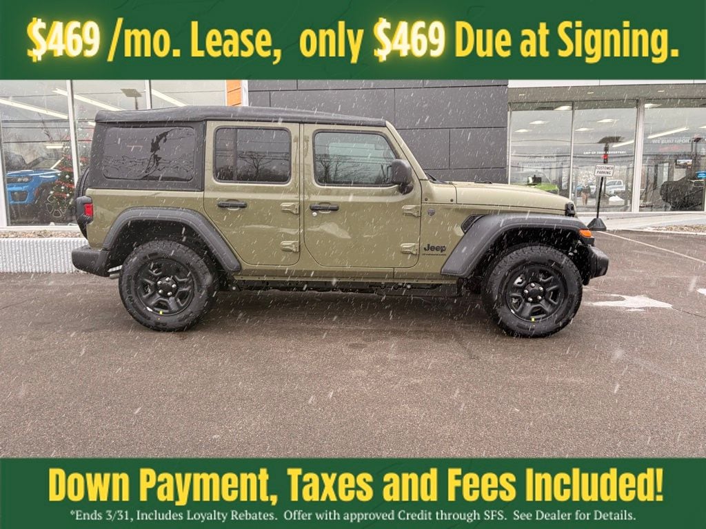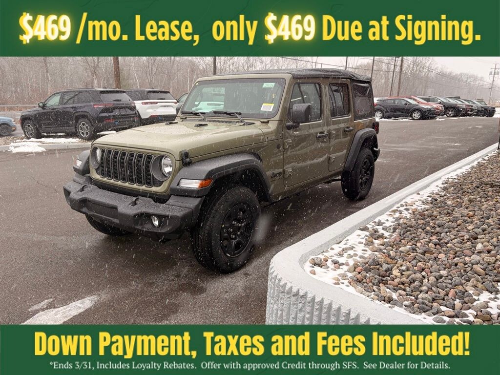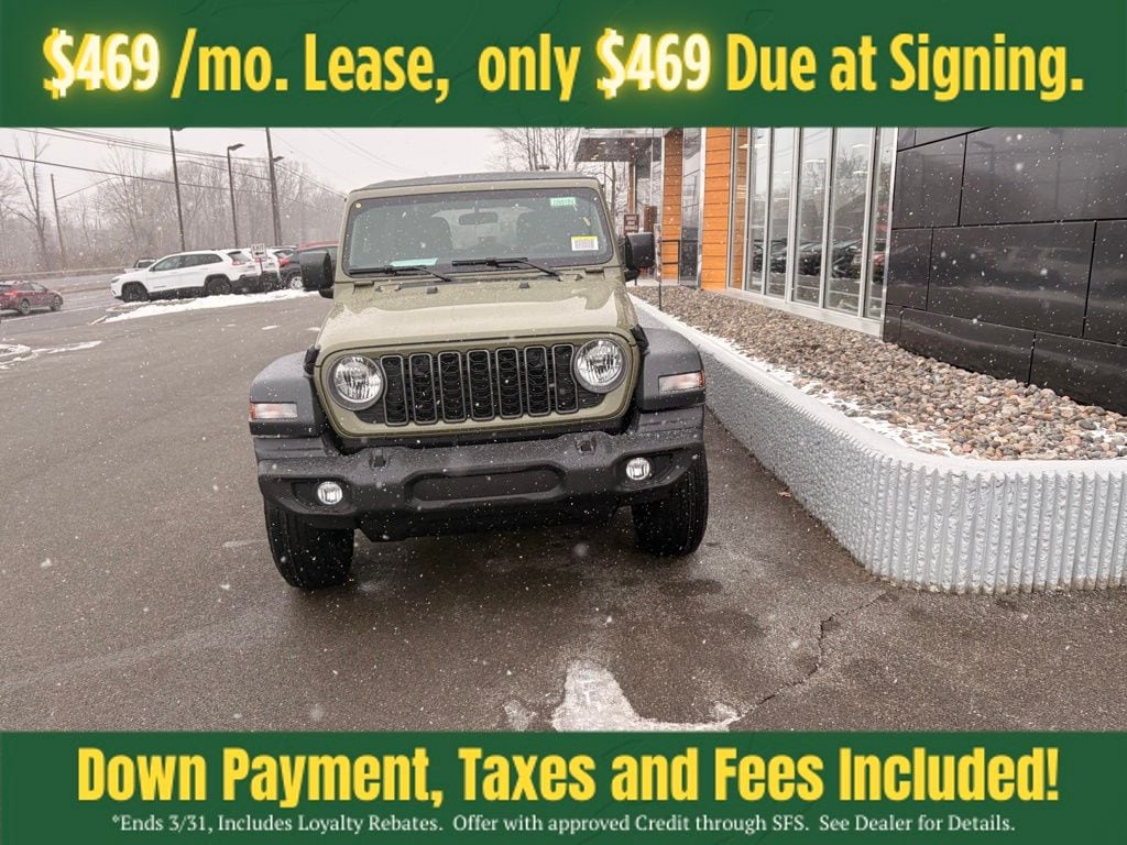 41 2026 Jeep Wrangler Sport 4DR 4x4 4WD 8-Speed Automatic 3.6L V6 24V VVT 12.3" Touchscreen Display, 3.45 Overall Top Gear Ratio, 4-Wheel Disc Brakes, 4G LTE Wi-Fi Hot Spot, 8 Speakers, ABS brakes, Air Conditioning, AM/FM radio: SiriusXM with 360L, Apple CarPlay, Apple CarPlay/Android Auto, Aux Battery, Brake assist, Cloth Low-Back Bucket Seats, Compass, Connectivity - US/Canada, Deep Tint Sunscreen Windows, Delay-off headlights, Driver door bin, Driver vanity mirror, Dual front impact airbags, Dual front side impact airbags, Electronic Stability Control, For More Info, Call 800-643-2112, Front anti-roll bar, Front Bucket Seats, Front Center Armrest w/Storage, Front fog lights, Front reading lights, Google Android Auto, Illuminated entry, Integrated Center Stack Radio, Integrated roll-over protection, Low tire pressure warning, MOPAR All-Weather Floor Mats, Non-Lock Fuel Cap Without Discriminator, Normal Duty Suspension, Occupant sensing airbag, Outside temperature display, Overhead airbag, Panic alarm, ParkView Rear Back-Up Camera, Passenger door bin, Passenger vanity mirror, Power steering, Power windows, Quick Order Package 24B Sport, Radio data system, Radio: Uconnect 5 with 12.3" Display, Rear anti-roll bar, Rear reading lights, Remote keyless entry, SiriusXM Radio Service, SiriusXM with 360L, Speed control, Split folding rear seat, Steering wheel mounted audio controls, Stop-Start Dual Battery System, Tachometer, Telescoping steering wheel, Tilt steering wheel, Traction control, Trip computer, Variably intermittent wipers, Wheels: 17" x 7.5" Black Steel Styled.