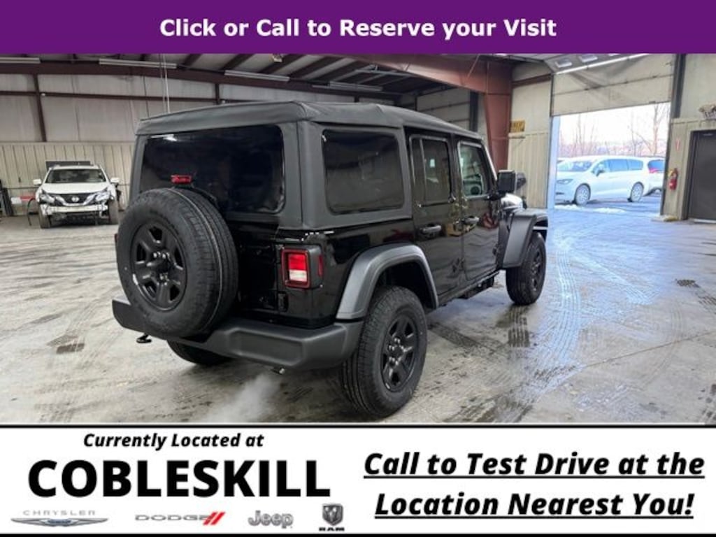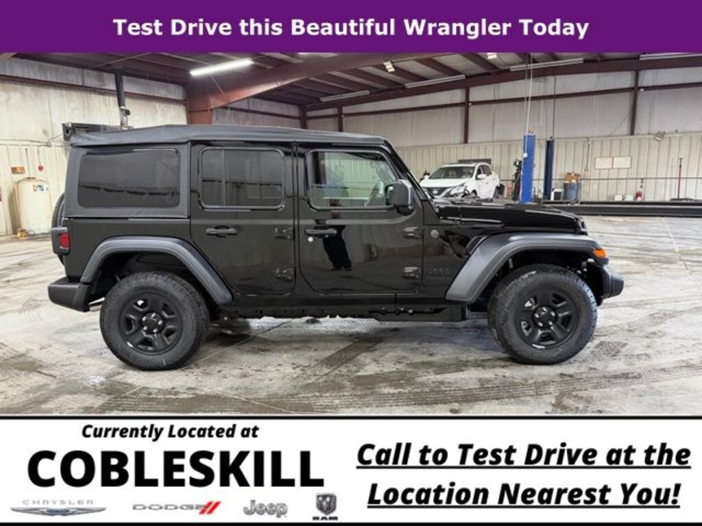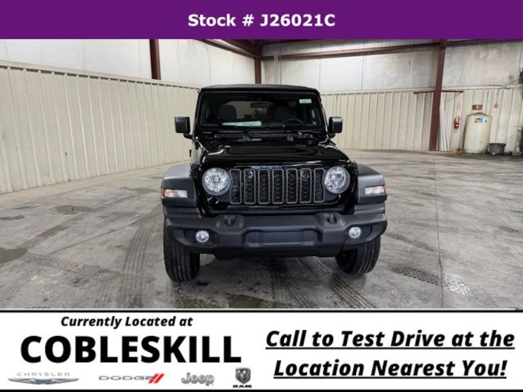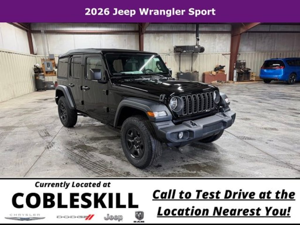 Black Clearcoat 2026 Jeep Wrangler Sport 4WD 8-Speed Automatic 2.0L I4 DOHC Save Time at the Dealership by Customizing your Deal Online!, 12.3" Touchscreen Display, 3.45 Overall Top Gear Ratio, 4-Wheel Disc Brakes, 4G LTE Wi-Fi Hot Spot, 8 Speakers, ABS brakes, Air Conditioning, AM/FM radio: SiriusXM with 360L, Apple CarPlay, Apple CarPlay/Android Auto, Aux Battery, Brake assist, Compass, Connectivity - US/Canada, Deep Tint Sunscreen Windows, Delay-off headlights, Driver door bin, Driver vanity mirror, Dual front impact airbags, Dual front side impact airbags, Electronic Stability Control, For More Info, Call 800-643-2112, Front anti-roll bar, Front Bucket Seats, Front Center Armrest w/Storage, Front fog lights, Front reading lights, Google Android Auto, Illuminated entry, Integrated Center Stack Radio, Integrated roll-over protection, Low tire pressure warning, MOPAR All-Weather Floor Mats, Non-Lock Fuel Cap Without Discriminator, Normal Duty Suspension, Occupant sensing airbag, Outside temperature display, Overhead airbag, Panic alarm, ParkView Rear Back-Up Camera, Passenger door bin, Passenger vanity mirror, Power steering, Power windows, Quick Order Package 22B Sport, Radio data system, Radio: Uconnect 5 with 12.3" Display, Rear anti-roll bar, Rear reading lights, Remote keyless entry, SiriusXM Radio Service, SiriusXM with 360L, Speed control, Split folding rear seat, Steering wheel mounted audio controls, Stop-Start Dual Battery System, Tachometer, Telescoping steering wheel, Tilt steering wheel, Traction control, Trip computer, Variably intermittent wipers, Wheels: 17" x 7.5" Black Steel Styled.