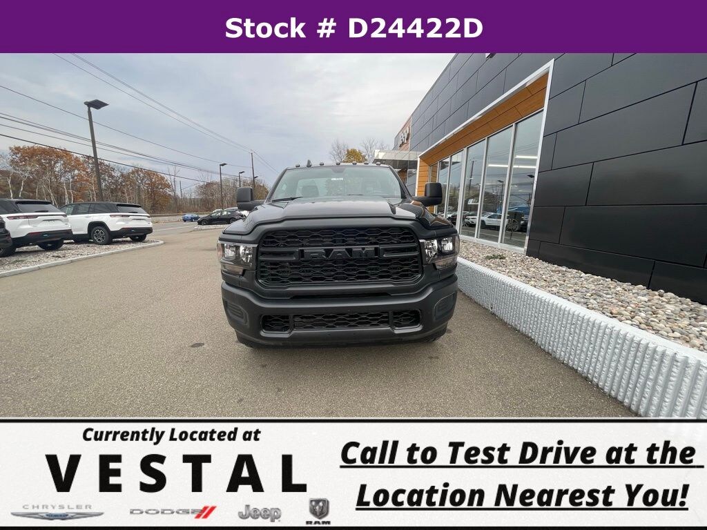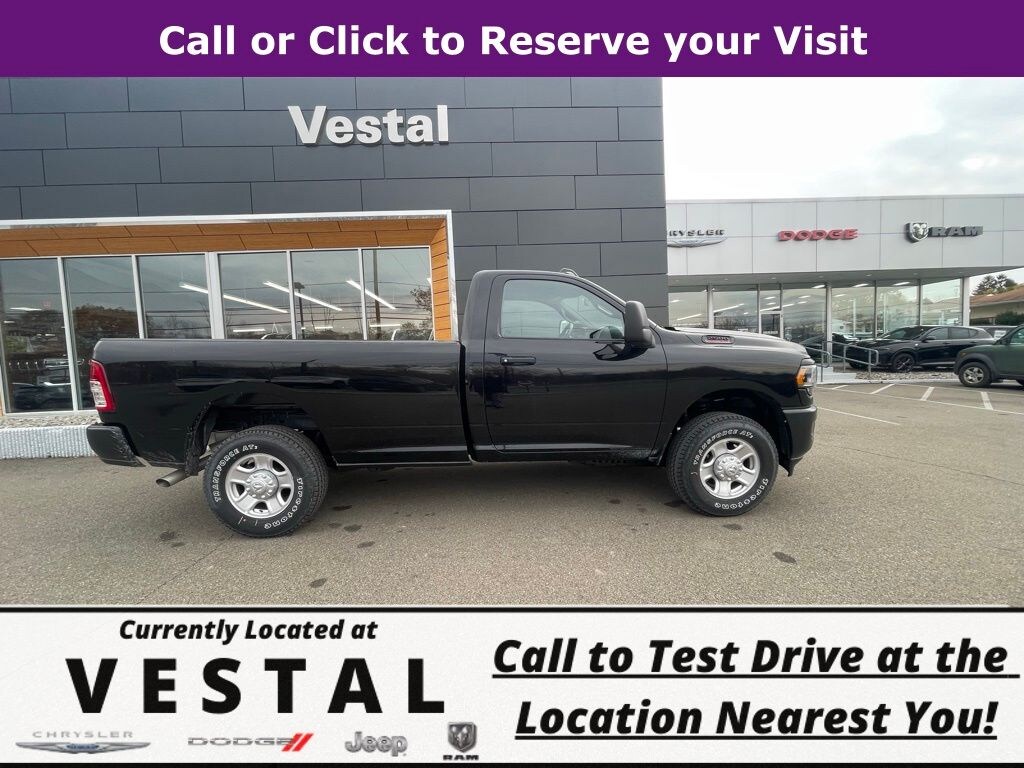 Diamond Black Crystal Pearlcoat 2024 Ram 2500 Tradesman 4WD 8-Speed Automatic 6.4L V8 17" x 7.5" Steel Styled Wheels, 2-Way Front Head Restraints, 220 Amp Alternator, 3.73 Axle Ratio, 4 Speakers, 4-Wheel Disc Brakes, 40/20/40 Split Bench Seat, ABS brakes, Air Conditioning, AM/FM radio, Anti-Spin Differential Rear Axle, Auxiliary Switches Prep, Black Exterior Mirrors, Bluetooth, Brake assist, Center Hub, Clearance Lamps, Compass, Delay-off headlights, Driver door bin, Dual Alternators Rated At 380 Amps, Dual front impact airbags, Dual front side impact airbags, Electronic Stability Control, Electronically Controlled Throttle, Emergency communication system: SiriusXM Guardian, For Details, Visit DriveUconnect.com, Front anti-roll bar, Front Armrest w/Cupholders, Front Center Armrest w/Storage, Front reading lights, Fully automatic headlights, Global Telematics Box Module (TBM), GPS Antenna Input, Heavy Duty Vinyl 40/20/40 Split Bench Seat, I/P Mounted Auxiliary Switches, Illuminated entry, Integrated Voice Command w/Bluetooth, Low tire pressure warning, Manual Adjust 4-Way Driver Seat, Manual Adjust 4-Way Front Passenger Seat, Manual Folding Exterior Mirrors, Manual Telescoping Mirrors, Manufacturer's Statement of Origin, Occupant sensing airbag, Outside temperature display, Overhead airbag, ParkView Rear Back-Up Camera, Passenger door bin, Passenger vanity mirror, Power steering, Quick Order Package 2GA Tradesman, Radio data system, Radio: Uconnect 3 w/5" Display, Rear anti-roll bar, Rear step bumper, Remote USB Port - Charge Only, Snow Chief Group, Speed control, Tachometer, Tilt steering wheel, Tip Start, Traction control, Variably intermittent wipers, Wheels: 18" x 8.0" Steel.