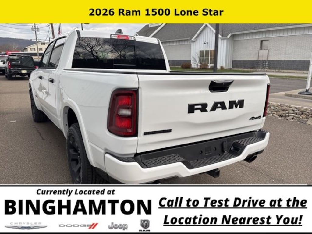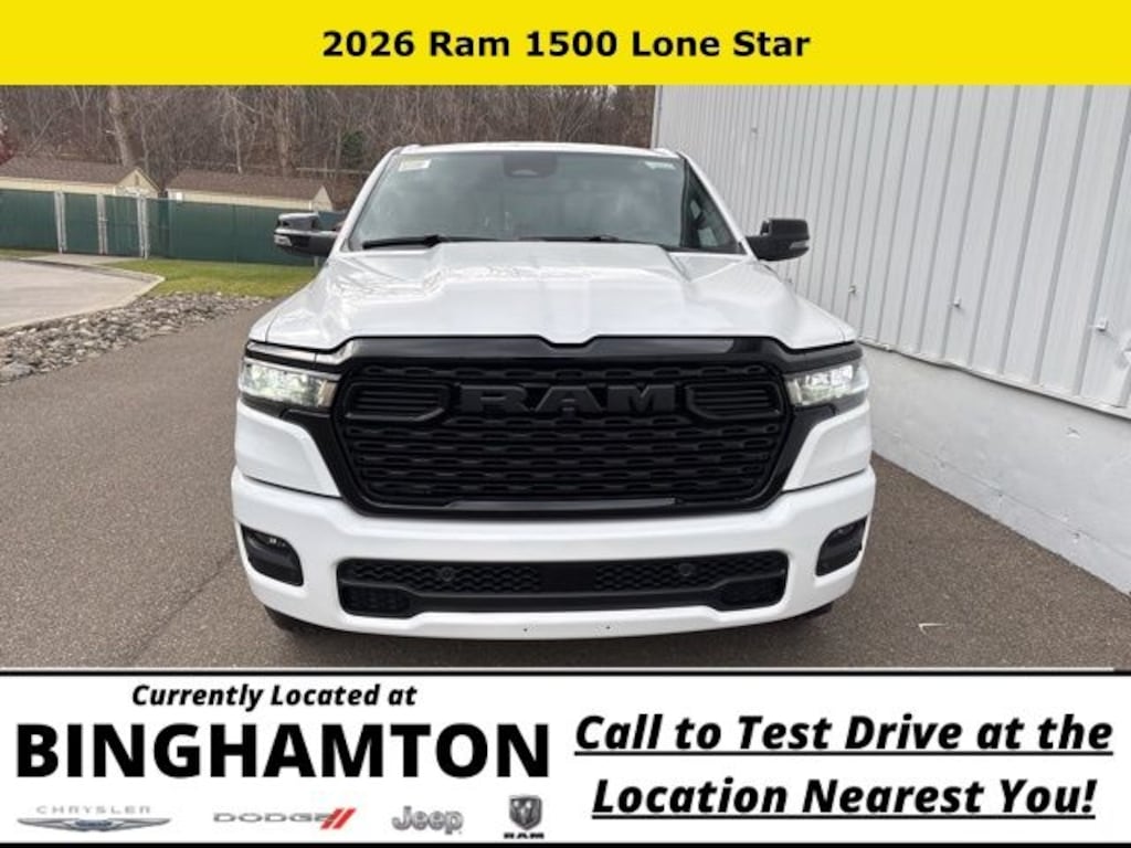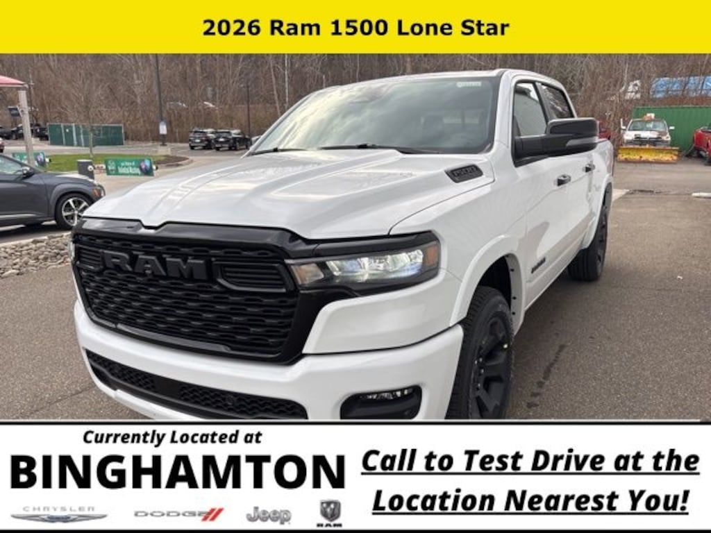 Bright White Clearcoat 2026 Ram 1500 Big Horn/Lone Star 4WD 8-Speed Automatic 3.0L I6 Save Time at the Dealership by Customizing your Deal Online!, 115V Auxiliary Power Outlet, 115V Auxiliary Rear Power Outlet, 12" Touchscreen Display, 2nd Row in Floor Storage Bins, 3 Rear Seat Head Restraints, 4 Way Front Headrests, 4-Wheel Disc Brakes, 400W Inverter, 48V Belt Starter Generator, 4G LTE Wi-Fi Hot Spot, 6 Speakers, 9 Amplified Speakers with Subwoofer, ABS brakes, Accent Color Door Handles, Accent Color Premium Power Mirrors, Accent Color Tailgate Handle, Air Conditioning, Air Conditioning ATC with Dual Zone Control, Alloy wheels, AM/FM radio, Anti-Spin Differential Rear Axle, Apple CarPlay, Apple CarPlay/Android Auto, Auto High-beam Headlights, Auto Power-Folding Mirrors, Auto-Dimming Exterior Driver Mirror, Auto-Dimming Rear-View Mirror, Big Horn Level 2 Equipment Group, Black Exterior Mirrors, Black Exterior Truck Badging, Black Headlamp Bezels, Black Interior Accents, Black Painted Exterior Mirrors Caps, Black Premium Power Mirrors, Black Tail Lamp Bezels, Body Color Fender Flares, Body Color Front Bumper, Body Color Rear Bumper with Step Pads, Brake assist, Bucket Seats, Bumpers: chrome, Center Console Parts Module, Cloth Bucket Seats, Cluster 12" TFT Color Display, Cluster 7.0" TFT Color Display, Compass, Configurable Drive Mode, Connected Travel and Traffic Services, Connectivity - US/Canada, Convex Wide-Angle Exterior Mirror Insert, Delay-off headlights, Deluxe Cloth Bucket Seats, Disassociated Touchscreen Display, Driver door bin, Dual Exhaust with Black Tips, Dual front impact airbags, Dual front side impact airbags, Electronic Stability Control, Exterior Mirrors Courtesy Lamps, Exterior Mirrors with Heating Element, Exterior Mirrors with Supplemental Signals, Front anti-roll bar, Front Bucket Seats, Front Center Armrest w/Storage, Front fog lights, Front License Plate Bracket, Front reading lights, Front Seat Back Map Pockets, Front wheel independent suspension, Full Length Floor Console, Fully automatic headlights, Global Telematics Box Module, Glove Box Lamp, Google Android Auto, GPS Antenna Input, GPS Navigation, Grille Black Surround Black Mesh, HD Radio, Heated door mirrors, Heated Front Seats, Heated Steering Wheel, Illuminated entry, Integrated Center Stack Radio, Integrated Voice Command with Bluetooth, Leather Wrapped Steering Wheel, LED Dome Lamp with on/Off Switch, LED Footwell Lighting, Low tire pressure warning, Manual Adjust 4-Way Driver Seat, Manual Adjust 4-Way Front Passenger Seat, Manual Folding Exterior Mirrors, Media Hub with 2 Charge Only USBs, MOPAR Front and Rear Rubber Floor Mats, Night Edition, Occupant sensing airbag, Outside temperature display, Overhead airbag, Overhead console, Overhead LED Lamps, Panic alarm, ParkView Rear Back-Up Camera, Passenger door bin, Passenger vanity mirror, Power 2-Way Driver Lumbar Adjust, Power Adjust 8-Way Driver Seat, Power Adjustable Pedals, Power door mirrors, Power steering, Power windows, Premium Overhead Console, Quick Order Package 21Z Big Horn, Radio data system, Radio: Uconnect 5 Navigation with 12.0" Display, Radio: Uconnect 5 W with 8.4" Display, RAM Grille Badge - Black, RAM Grille Badge - Chrome, Rear 60/40 Folding Seat, Rear anti-roll bar, Rear Center Armrest, Rear Power Sliding Window, Rear step bumper, Rear Wheelhouse Liners, Rear Window Defroster, Remote keyless entry, Remote Tailgate Release, Security Alarm, SiriusXM Radio Service, SiriusXM with 360L, Speed control, Steering Wheel Mounted Audio Controls, Sun Visors with Illuminated Vanity Mirrors, Supplier Part Tracking (J-1), Tachometer, Telescoping steering wheel, Tilt steering wheel, Traction control, Trailer Brake Control, Trip computer, Universal Garage Door Opener, USB Host Flip, Variably intermittent wipers, Voltmeter, Wheels: 20" x 9.0" Aluminum Painted Clad.