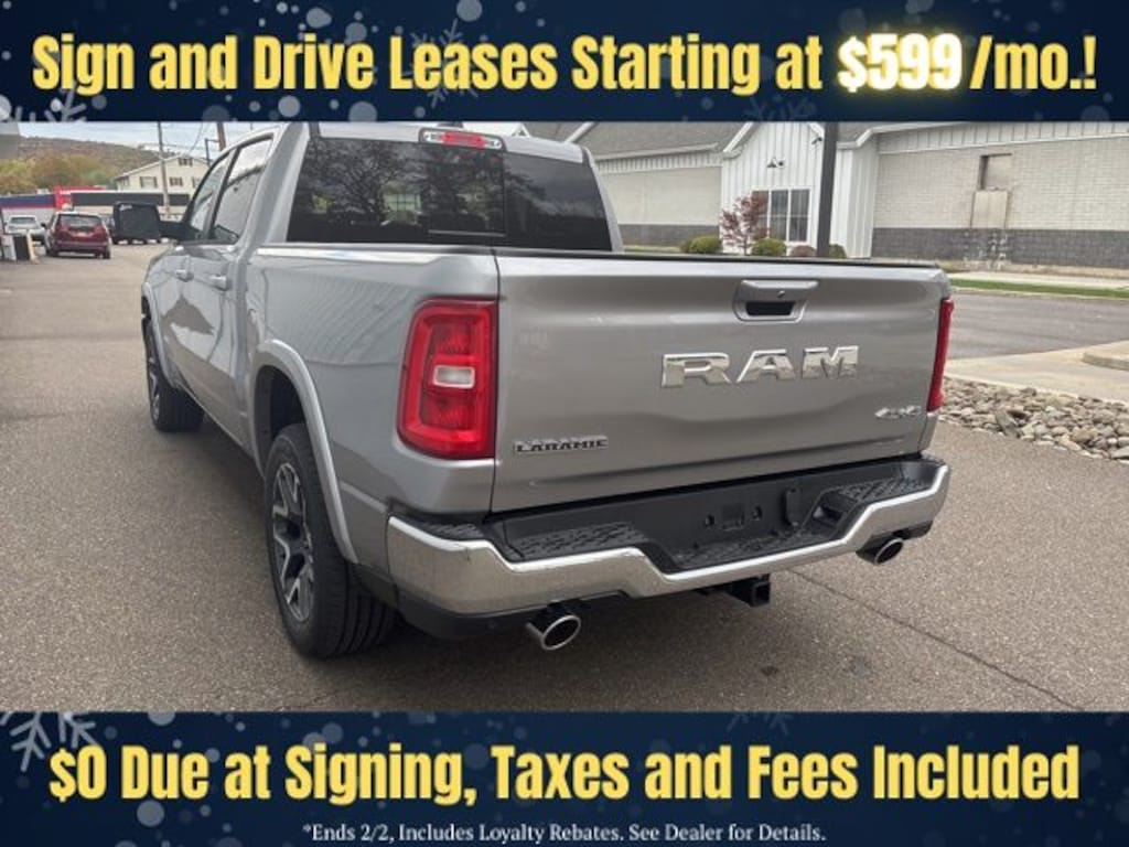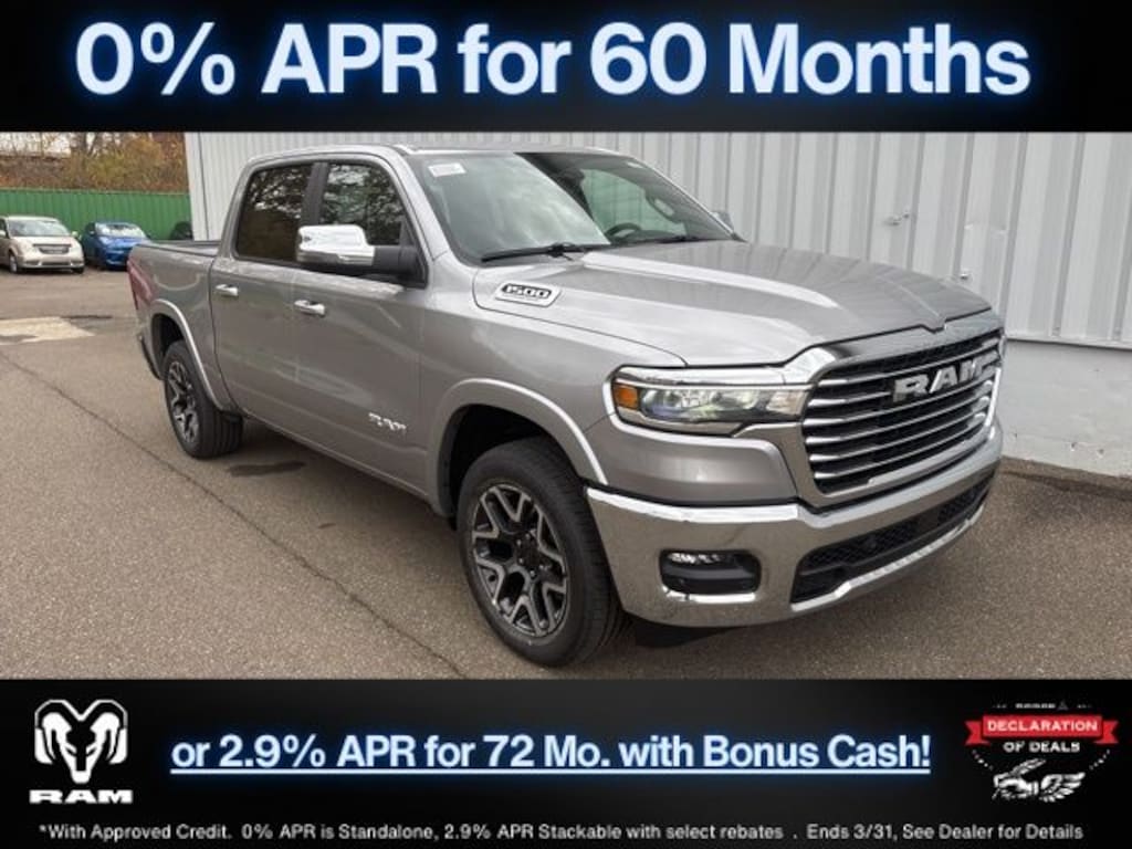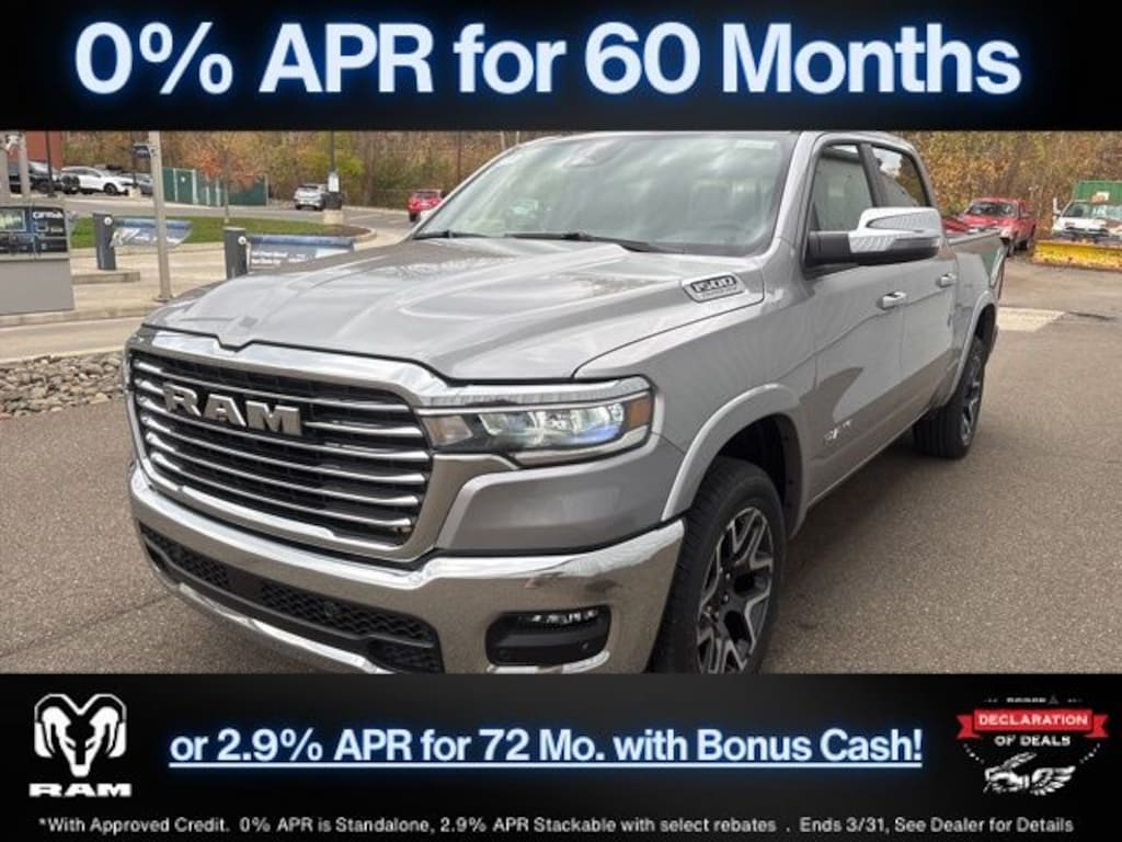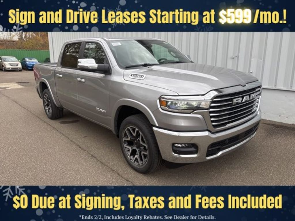 Billet Silver Metallic Clearcoat 2026 Ram 1500 Laramie 4WD 8-Speed Automatic 3.0L I6 Save Time at the Dealership by Customizing your Deal Online!, 10 Speakers, 3.55 Rear Axle Ratio, 4-Wheel Disc Brakes, 4G LTE Wi-Fi Hot Spot, ABS brakes, Active Noise Control System, Adjustable pedals, Air Conditioning, Alloy wheels, AM/FM radio: SiriusXM with 360L, Apple CarPlay/Android Auto, Audio memory, Auto High-beam Headlights, Auto Power-Folding Mirrors, Auto-dimming door mirrors, Auto-Dimming Exterior Driver Mirror, Auto-dimming Rear-View mirror, Automatic temperature control, Brake assist, Bumpers: chrome, Chrome Exterior Mirrors, Compass, Connected Travel and Traffic Services, Connectivity - US/Canada, Convex Wide-Angle Exterior Mirror Insert, Delay-off headlights, Driver door bin, Driver vanity mirror, Dual front impact airbags, Dual front side impact airbags, Electronic Stability Control, Exterior Mirrors Courtesy Lamps, Exterior Mirrors with Heating Element, Exterior Mirrors with Memory, Exterior Mirrors with Supplemental Signals, Front anti-roll bar, Front Bucket Seats, Front Center Armrest w/Storage, Front dual zone A/C, Front fog lights, Front License Plate Bracket, Front reading lights, Front wheel independent suspension, Fully automatic headlights, Garage door transmitter, GPS Navigation, Heated door mirrors, Heated front seats, Heated rear seats, Heated steering wheel, Illuminated entry, Integrated Center Stack Radio, Integrated Voice Command with Bluetooth, Laramie Level 1 Equipment Group, Leather steering wheel, Leather Trimmed Bucket Seats, Low tire pressure warning, Manufacturer's Statement of Origin, Memory seat, MOPAR Front and Rear Rubber Floor Mats, Navigation System, Occupant sensing airbag, Off-Road Information Pages, Outside temperature display, Overhead airbag, Overhead console, Panic alarm, ParkView Rear Back-Up Camera, Passenger door bin, Passenger vanity mirror, Pedal memory, Power door mirrors, Power driver seat, Power passenger seat, Power steering, Power windows, Quick Order Package 21H Laramie, Radio data system, Radio: Uconnect 5 Navigation with 12.0" Display, Rain Sensitive Windshield Wipers, RAM Grille Badge - Chrome, Rear anti-roll bar, Rear reading lights, Rear seat center armrest, Rear step bumper, Remote keyless entry, Remote Tailgate Release, Security system, SiriusXM Radio Service, SiriusXM with 360L, Speed control, Split folding rear seat, Steering wheel mounted audio controls, Tachometer, Telescoping steering wheel, Tilt steering wheel, Traction control, Trip computer, Turn signal indicator mirrors, USB Host Flip, Variably intermittent wipers, Ventilated front seats, Voltmeter, Wheels: 20" x 9" Premium Paint/Polish.
