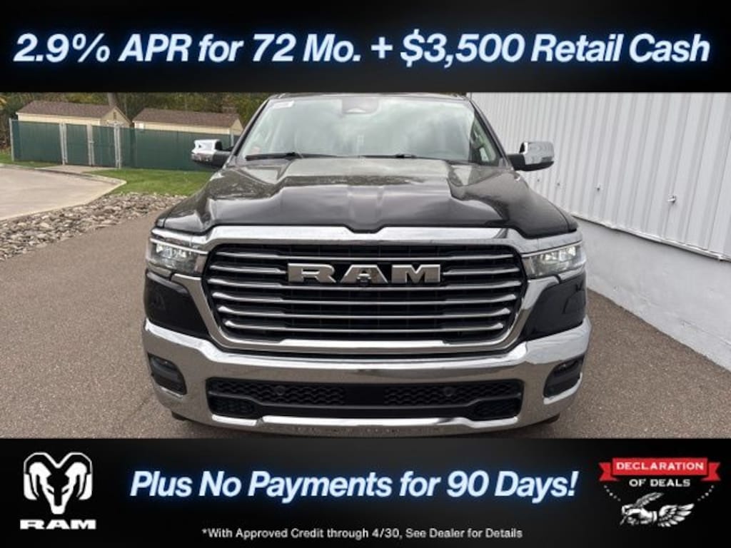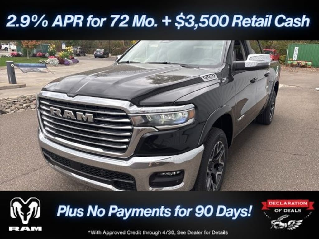 Diamond Black Crystal Pearlcoat 2026 Ram 1500 Laramie 4WD 8-Speed Automatic 3.0L I6 Save Time at the Dealership by Customizing your Deal Online!, 10 Speakers, 3.55 Rear Axle Ratio, 4-Wheel Disc Brakes, 4G LTE Wi-Fi Hot Spot, ABS brakes, Active Noise Control System, Adjustable pedals, Air Conditioning, Alloy wheels, AM/FM radio: SiriusXM with 360L, Apple CarPlay/Android Auto, Audio memory, Auto High-beam Headlights, Auto Power-Folding Mirrors, Auto-dimming door mirrors, Auto-Dimming Exterior Driver Mirror, Auto-dimming Rear-View mirror, Automatic temperature control, Brake assist, Bumpers: chrome, Chrome Exterior Mirrors, Compass, Connected Travel and Traffic Services, Connectivity - US/Canada, Convex Wide-Angle Exterior Mirror Insert, Delay-off headlights, Driver door bin, Driver vanity mirror, Dual front impact airbags, Dual front side impact airbags, Electronic Stability Control, Exterior Mirrors Courtesy Lamps, Exterior Mirrors with Heating Element, Exterior Mirrors with Memory, Exterior Mirrors with Supplemental Signals, Front anti-roll bar, Front Bucket Seats, Front Center Armrest w/Storage, Front dual zone A/C, Front fog lights, Front License Plate Bracket, Front reading lights, Front wheel independent suspension, Fully automatic headlights, Garage door transmitter, GPS Navigation, Heated door mirrors, Heated front seats, Heated rear seats, Heated steering wheel, Illuminated entry, Integrated Center Stack Radio, Integrated Voice Command with Bluetooth, Laramie Level 1 Equipment Group, Leather steering wheel, Leather Trimmed Bucket Seats, Low tire pressure warning, Manufacturer's Statement of Origin, Memory seat, MOPAR Front and Rear Rubber Floor Mats, Navigation System, Occupant sensing airbag, Off-Road Information Pages, Outside temperature display, Overhead airbag, Overhead console, Panic alarm, ParkView Rear Back-Up Camera, Passenger door bin, Passenger vanity mirror, Pedal memory, Power door mirrors, Power driver seat, Power passenger seat, Power steering, Power windows, Quick Order Package 21H Laramie, Radio data system, Radio: Uconnect 5 Navigation with 12.0" Display, Rain Sensitive Windshield Wipers, RAM Grille Badge - Chrome, Rear anti-roll bar, Rear reading lights, Rear seat center armrest, Rear step bumper, Remote keyless entry, Remote Tailgate Release, Security system, SiriusXM Radio Service, SiriusXM with 360L, Speed control, Split folding rear seat, Steering wheel mounted audio controls, Tachometer, Telescoping steering wheel, Tilt steering wheel, Traction control, Trip computer, Turn signal indicator mirrors, USB Host Flip, Variably intermittent wipers, Ventilated front seats, Voltmeter, Wheels: 20" x 9" Premium Paint/Polish.