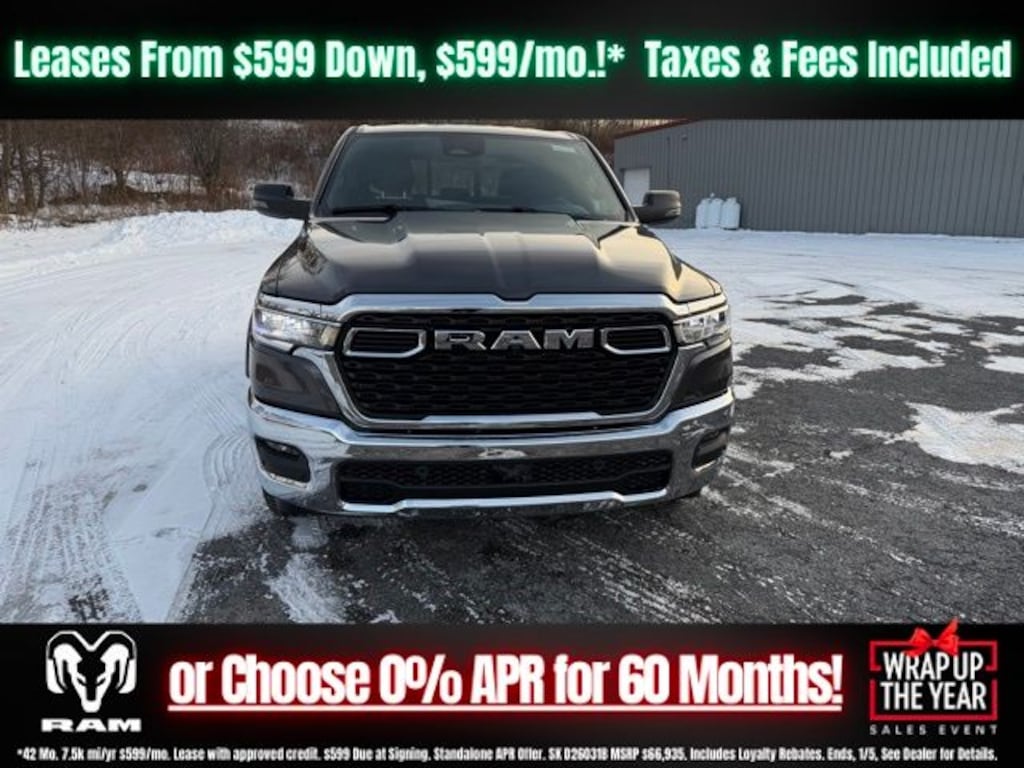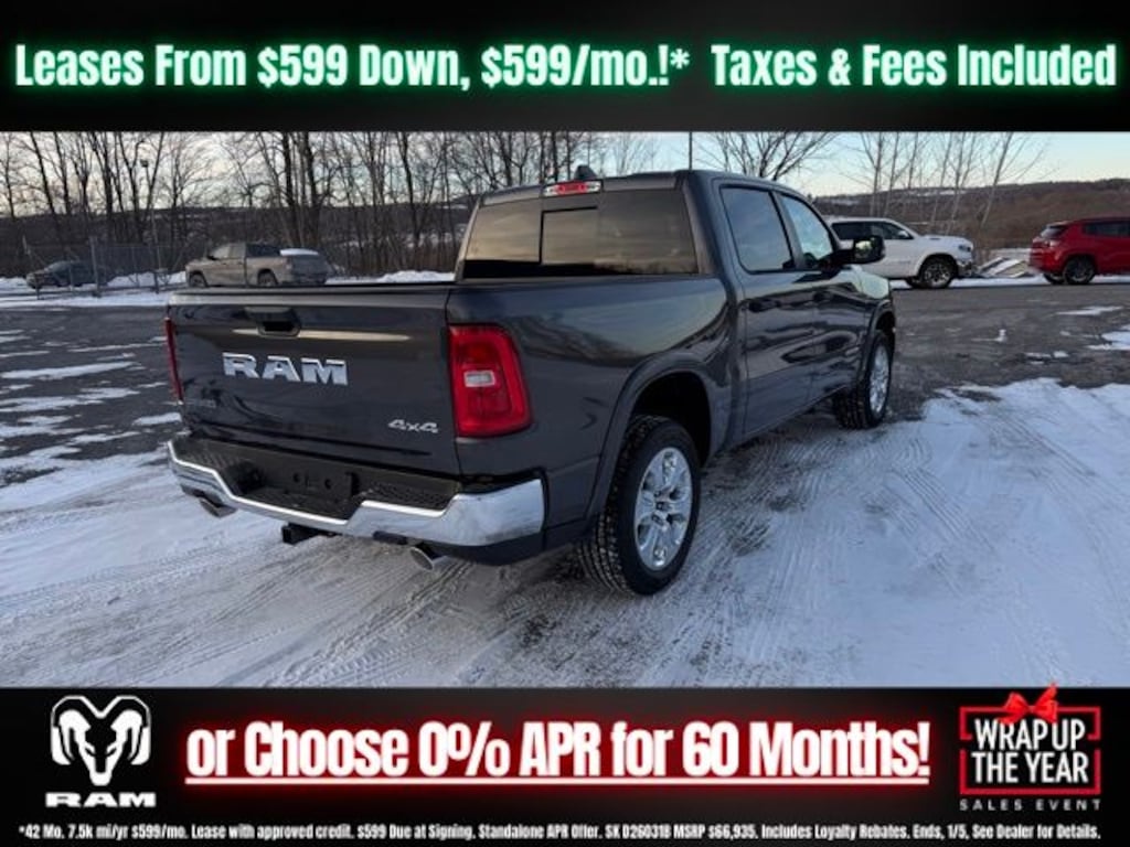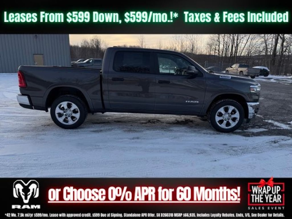 Granite Crystal Metallic Clearcoat 2026 Ram 1500 Big Horn/Lone Star 4WD 8-Speed Automatic 3.0L I6 Save Time at the Dealership by Customizing your Deal Online!, 115V Auxiliary Power Outlet, 2nd Row in Floor Storage Bins, 3 Rear Seat Head Restraints, 4 Way Front Headrests, 4-Wheel Disc Brakes, 400W Inverter, 48V Belt Starter Generator, 4G LTE Wi-Fi Hot Spot, 6 Speakers, ABS brakes, Air Conditioning, Alloy wheels, AM/FM radio, Apple CarPlay, Apple CarPlay/Android Auto, Auto High-beam Headlights, Auto Power-Folding Mirrors, Auto-Dimming Exterior Driver Mirror, Auto-Dimming Rear-View Mirror, Big Horn Level 1 Equipment Group, Black Exterior Mirrors, Black Premium Power Mirrors, Body Color Fender Flares, Brake assist, Bucket Seats, Bumpers: chrome, Center Console Parts Module, Cloth Bucket Seats, Compass, Connectivity - US/Canada, Convex Wide-Angle Exterior Mirror Insert, Delay-off headlights, Deluxe Cloth Bucket Seats, Driver door bin, Dual front impact airbags, Dual front side impact airbags, Electronic Stability Control, Exterior Mirrors Courtesy Lamps, Exterior Mirrors with Heating Element, Exterior Mirrors with Supplemental Signals, Front anti-roll bar, Front Bucket Seats, Front Center Armrest w/Storage, Front fog lights, Front License Plate Bracket, Front reading lights, Front Seat Back Map Pockets, Front wheel independent suspension, Full Length Floor Console, Fully automatic headlights, Global Telematics Box Module, Glove Box Lamp, Google Android Auto, GPS Antenna Input, Heated door mirrors, Heated Front Seats, Heated Steering Wheel, Illuminated entry, Integrated Center Stack Radio, Integrated Voice Command with Bluetooth, Leather Wrapped Steering Wheel, Low tire pressure warning, Manual Adjust 4-Way Driver Seat, Manual Adjust 4-Way Front Passenger Seat, Manual Folding Exterior Mirrors, Manufacturer's Statement of Origin, MOPAR Front and Rear Rubber Floor Mats, Occupant sensing airbag, Outside temperature display, Overhead airbag, Overhead console, Panic alarm, ParkView Rear Back-Up Camera, Passenger door bin, Passenger vanity mirror, Power 2-Way Driver Lumbar Adjust, Power Adjust 8-Way Driver Seat, Power Adjustable Pedals, Power door mirrors, Power steering, Power windows, Quick Order Package 21Z Big Horn, Radio data system, Radio: Uconnect 5 W with 8.4" Display, RAM Grille Badge - Chrome, Rear 60/40 Folding Seat, Rear anti-roll bar, Rear Center Armrest, Rear Dome with on/Off Switch Lamp, Rear Power Sliding Window, Rear step bumper, Rear Wheelhouse Liners, Rear Window Defroster, Remote keyless entry, SiriusXM Radio Service, SiriusXM Satellite Radio, Speed control, Steering Wheel Mounted Audio Controls, Sun Visors with Illuminated Vanity Mirrors, Supplier Part Tracking (J-1), Tachometer, Telescoping steering wheel, Tilt steering wheel, Traction control, Trip computer, Universal Garage Door Opener, USB Host Flip, Variably intermittent wipers, Voltmeter, Wheels: 20" x 9" Aluminum Chrome Clad.