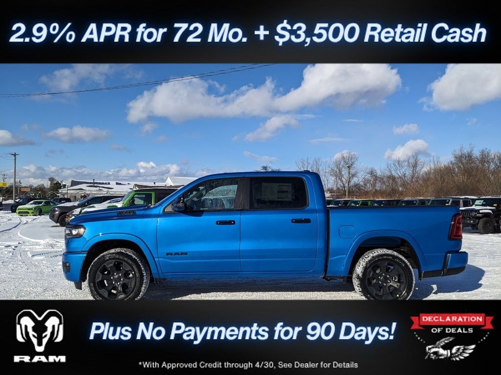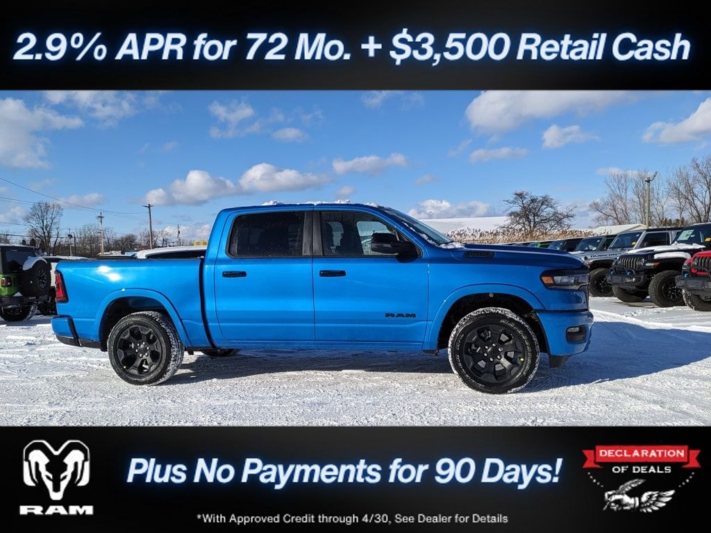 Save Time at the Dealership by Customizing your Deal Online!, Service Records on File, 115V Auxiliary Power Outlet, 2nd Row in Floor Storage Bins, 3 Rear Seat Head Restraints, 3.21 Rear Axle Ratio, 4 Way Front Headrests, 4-Wheel Disc Brakes, 400W Inverter, 48V Belt Starter Generator, 4G LTE Wi-Fi Hot Spot, 6 Speakers, ABS brakes, Accent Color Door Handles, Accent Color Premium Power Mirrors, Accent Color Tailgate Handle, Air Conditioning, Alloy wheels, AM/FM radio, Anti-Spin Differential Rear Axle, Apple CarPlay, Apple CarPlay/Android Auto, Auto High-beam Headlights, Auto Power-Folding Mirrors, Auto-Dimming Exterior Driver Mirror, Auto-Dimming Rear-View Mirror, Big Horn Level 1 Equipment Group, Black Exterior Mirrors, Black Exterior Truck Badging, Black Headlamp Bezels, Black Interior Accents, Black Painted Exterior Mirrors Caps, Black Premium Power Mirrors, Black Tail Lamp Bezels, Body Color Fender Flares, Body Color Front Bumper, Body Color Rear Bumper with Step Pads, Brake assist, Bucket Seats, Bumpers: chrome, Center Console Parts Module, Cloth Bucket Seats, Compass, Connectivity - US/Canada, Convex Wide-Angle Exterior Mirror Insert, Delay-off headlights, Deluxe Cloth Bucket Seats, Driver door bin, Dual Exhaust with Black Tips, Dual front impact airbags, Dual front side impact airbags, Electronic Stability Control, Exterior Mirrors Courtesy Lamps, Exterior Mirrors with Heating Element, Exterior Mirrors with Supplemental Signals, Front anti-roll bar, Front Bucket Seats, Front Center Armrest w/Storage, Front fog lights, Front License Plate Bracket, Front reading lights, Front Seat Back Map Pockets, Front wheel independent suspension, Full Length Floor Console, Fully automatic headlights, Global Telematics Box Module, Glove Box Lamp, Google Android Auto, GPS Antenna Input, Grille Black Surround Black Mesh, Heated door mirrors, Heated Front Seats, Heated Steering Wheel, Illuminated entry, Integrated Center Stack Radio, Integrated Voice Command with Bluetooth, Leather Wrapped Steering Wheel, Low tire pressure warning, Manual Adjust 4-Way Driver Seat, Manual Adjust 4-Way Front Passenger Seat, Manual Folding Exterior Mirrors, MOPAR Front and Rear Rubber Floor Mats, MyFlexCare Service Plan, Night Edition, Occupant sensing airbag, Outside temperature display, Overhead airbag, Overhead console, Panic alarm, ParkView Rear Back-Up Camera, Passenger door bin, Passenger vanity mirror, Power 2-Way Driver Lumbar Adjust, Power Adjust 8-Way Driver Seat, Power Adjustable Pedals, Power door mirrors, Power steering, Power windows, Quick Order Package 23Z Big Horn, Radio data system, Radio: Uconnect 5 W with 8.4" Display, RAM Grille Badge - Black, RAM Grille Badge - Chrome, Rear 60/40 Folding Seat, Rear anti-roll bar, Rear Center Armrest, Rear Dome with on/Off Switch Lamp, Rear Power Sliding Window, Rear step bumper, Rear Window Defroster, Remote keyless entry, SiriusXM Radio Service, SiriusXM Satellite Radio, Speed control, Steering Wheel Mounted Audio Controls, Sun Visors with Illuminated Vanity Mirrors, Supplier Part Tracking (J-1), Tachometer, Telescoping steering wheel, Tilt steering wheel, Traction control, Trip computer, Universal Garage Door Opener, USB Host Flip, Variably intermittent wipers, Voltmeter, Wheels: 20" x 9.0" Aluminum Painted Clad.