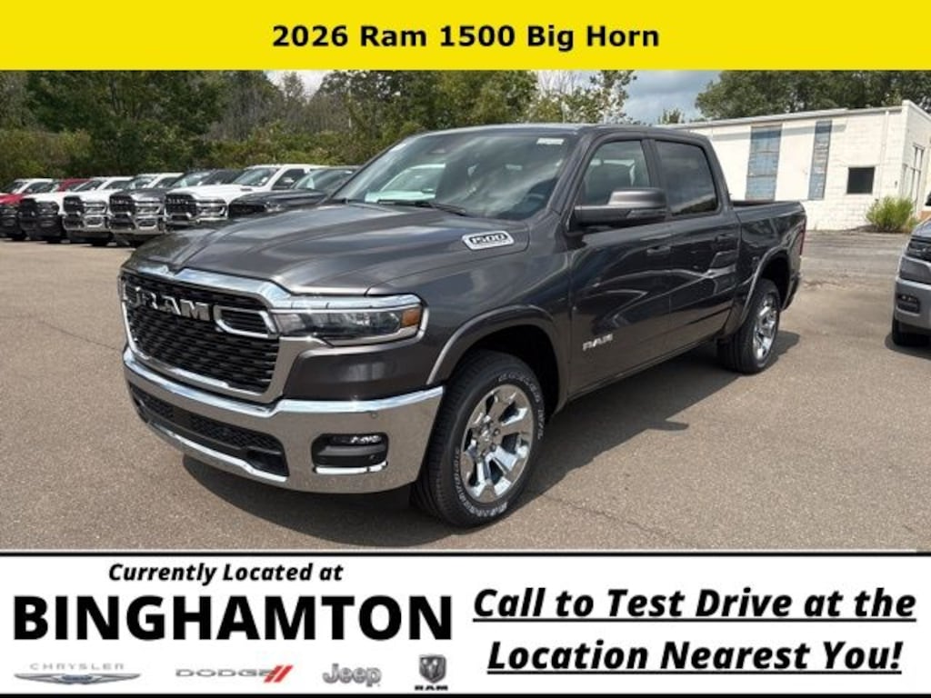 Granite Crystal Metallic Clearcoat 2026 Ram 1500 Big Horn/Lone Star 4WD 8-Speed Automatic 3.0L I6 Save Time at the Dealership by Customizing your Deal Online!, 115V Auxiliary Power Outlet, 115V Auxiliary Rear Power Outlet, 12" Touchscreen Display, 2nd Row in Floor Storage Bins, 3 Rear Seat Head Restraints, 4 Way Front Headrests, 4-Wheel Disc Brakes, 400W Inverter, 48V Belt Starter Generator, 4G LTE Wi-Fi Hot Spot, 6 Speakers, 9 Amplified Speakers with Subwoofer, ABS brakes, Air Conditioning, Air Conditioning ATC with Dual Zone Control, Alloy wheels, AM/FM radio, Apple CarPlay, Apple CarPlay/Android Auto, Auto High-beam Headlights, Auto Power-Folding Mirrors, Auto-Dimming Exterior Driver Mirror, Auto-Dimming Rear-View Mirror, Big Horn Level 2 Equipment Group, Black Exterior Mirrors, Black Premium Power Mirrors, Body Color Fender Flares, Brake assist, Bucket Seats, Bumpers: chrome, Center Console Parts Module, Cloth Bucket Seats, Cluster 12" TFT Color Display, Cluster 7.0" TFT Color Display, Compass, Configurable Drive Mode, Connected Travel and Traffic Services, Connectivity - US/Canada, Convex Wide-Angle Exterior Mirror Insert, Delay-off headlights, Deluxe Cloth Bucket Seats, Disassociated Touchscreen Display, Driver door bin, Dual front impact airbags, Dual front side impact airbags, Electronic Stability Control, Exterior Mirrors Courtesy Lamps, Exterior Mirrors with Heating Element, Exterior Mirrors with Supplemental Signals, Front anti-roll bar, Front Bucket Seats, Front Center Armrest w/Storage, Front fog lights, Front License Plate Bracket, Front reading lights, Front Seat Back Map Pockets, Front wheel independent suspension, Full Length Floor Console, Fully automatic headlights, Global Telematics Box Module, Glove Box Lamp, Google Android Auto, GPS Antenna Input, GPS Navigation, HD Radio, Heated door mirrors, Heated Front Seats, Heated Steering Wheel, Illuminated entry, Integrated Center Stack Radio, Integrated Voice Command with Bluetooth, Leather Wrapped Steering Wheel, LED Dome Lamp with on/Off Switch, LED Footwell Lighting, Low tire pressure warning, Manual Adjust 4-Way Driver Seat, Manual Adjust 4-Way Front Passenger Seat, Manual Folding Exterior Mirrors, Media Hub with 2 Charge Only USBs, MOPAR Front and Rear Rubber Floor Mats, Occupant sensing airbag, Outside temperature display, Overhead airbag, Overhead console, Overhead LED Lamps, Panic alarm, ParkView Rear Back-Up Camera, Passenger door bin, Passenger vanity mirror, Power 2-Way Driver Lumbar Adjust, Power Adjust 8-Way Driver Seat, Power Adjustable Pedals, Power door mirrors, Power steering, Power windows, Premium Overhead Console, Quick Order Package 21Z Big Horn, Radio data system, Radio: Uconnect 5 Navigation with 12.0" Display, Radio: Uconnect 5 W with 8.4" Display, RAM Grille Badge - Chrome, Rear 60/40 Folding Seat, Rear anti-roll bar, Rear Center Armrest, Rear Power Sliding Window, Rear step bumper, Rear Wheelhouse Liners, Rear Window Defroster, Remote keyless entry, Remote Tailgate Release, Security Alarm, SiriusXM Radio Service, SiriusXM with 360L, Speed control, Steering Wheel Mounted Audio Controls, Sun Visors with Illuminated Vanity Mirrors, Supplier Part Tracking (J-1), Tachometer, Telescoping steering wheel, Tilt steering wheel, Traction control, Trip computer, Universal Garage Door Opener, USB Host Flip, Variably intermittent wipers, Voltmeter.