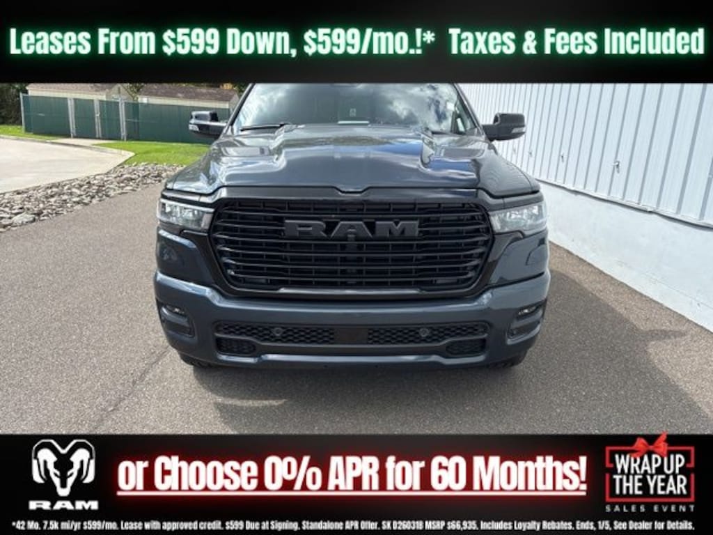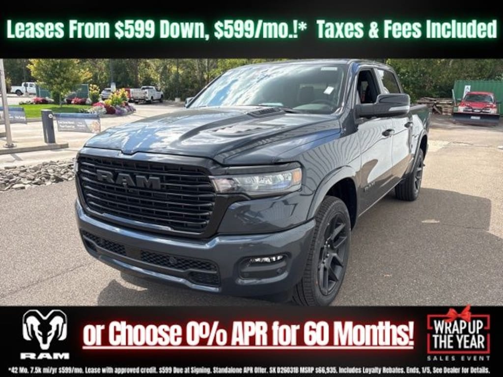 Forged Blue Metallic 2026 Ram 1500 Laramie 4WD 8-Speed Automatic 3.0L I6 Save Time at the Dealership by Customizing your Deal Online!, 10 Speakers, 14.4" Touchscreen Display, 3.55 Rear Axle Ratio, 4-Wheel Disc Brakes, 4G LTE Wi-Fi Hot Spot, ABS brakes, Accent Color Door Handles, Accent Color Premium Power Mirrors, Accent Color Tailgate Handle, Active Noise Control System, Air Conditioning, Alloy wheels, AM/FM radio: SiriusXM with 360L, Anti-Spin Differential Rear Axle, Apple CarPlay/Android Auto, Audio memory, Auto High-beam Headlights, Auto Power-Folding Mirrors, Auto-dimming door mirrors, Auto-Dimming Exterior Driver Mirror, Auto-dimming Rear-View mirror, Automatic temperature control, Bed Utility Group, Black Exterior Truck Badging, Black Headlamp Bezels, Black Interior Accents, Black Painted Exterior Mirrors Caps, Black Tail Lamp Bezels, Body Color Front Bumper, Body Color Rear Bumper with Step Pads, Brake assist, Bumpers: chrome, Chrome Exterior Mirrors, Cluster 12" TFT Color Display, Compass, Connected Travel and Traffic Services, Connectivity - US/Canada, Convex Wide-Angle Exterior Mirror Insert, Delay-off headlights, Dome Dual LED Reading Lamp, Driver door bin, Driver vanity mirror, Dual Exhaust with Black Tips, Dual front impact airbags, Dual front side impact airbags, Dual-Pane Panoramic Sunroof, Electronic Stability Control, Exterior 115V AC Outlet, Exterior Mirrors Approach Lamps, Exterior Mirrors Courtesy Lamps, Exterior Mirrors with Heating Element, Exterior Mirrors with Memory, Exterior Mirrors with Supplemental Signals, Front anti-roll bar, Front Bucket Seats, Front Center Armrest w/Storage, Front dual zone A/C, Front fog lights, Front License Plate Bracket, Front Passenger Interactive Display, Front reading lights, Front wheel independent suspension, Fully automatic headlights, Garage door transmitter, GPS Navigation, Grille Surround 3 Black Texture 2 Black, Harman/Kardon 19 Speaker Premium Sound, Heated door mirrors, Heated front seats, Heated rear seats, Heated steering wheel, Illuminated entry, Integrated Center Stack Radio, Integrated Voice Command with Bluetooth, Laramie Level 2 Equipment Group, Leather steering wheel, Leather Trimmed Bucket Seats, LED Dome/Reading Lamp, Low tire pressure warning, Manufacturer's Statement of Origin, Memory seat, MOPAR 4 Adjustable Cargo Tie-Down Hooks, MOPAR Front and Rear Rubber Floor Mats, MOPAR Spray in Bedliner, Navigation System, Night Edition, Occupant sensing airbag, Off-Road Information Pages, Outside temperature display, Overhead airbag, Overhead console, Panic alarm, ParkView Rear Back-Up Camera, Passenger door bin, Passenger vanity mirror, Pirelli Brand Tires, Power door mirrors, Power driver seat, Power passenger seat, Power steering, Power Tailgate, Power windows, Proximity Approach/Departure Lamps, Quick Order Package 21H Laramie, Radio data system, Radio: Uconnect 5 Nav with 14.4" Display, Radio: Uconnect 5 Navigation with 12.0" Display, Rain Sensitive Windshield Wipers, RAM Grille Badge - Black, RAM Grille Badge - Chrome, Rear anti-roll bar, Rear reading lights, Rear seat center armrest, Rear step bumper, Remote keyless entry, Security system, SiriusXM Radio Service, SiriusXM with 360L, Speed control, Split folding rear seat, Sport Performance Hood, Steering wheel mounted audio controls, Tachometer, Telescoping steering wheel, Tilt steering wheel, Traction control, Trailer Brake Control, Trip computer, Turn signal indicator mirrors, USB Host Flip, Variably intermittent wipers, Ventilated front seats, Voltmeter, Wheels: 20" x 9" Premium Paint/Polish, Wheels: 22" x 9" Forged Aluminum.