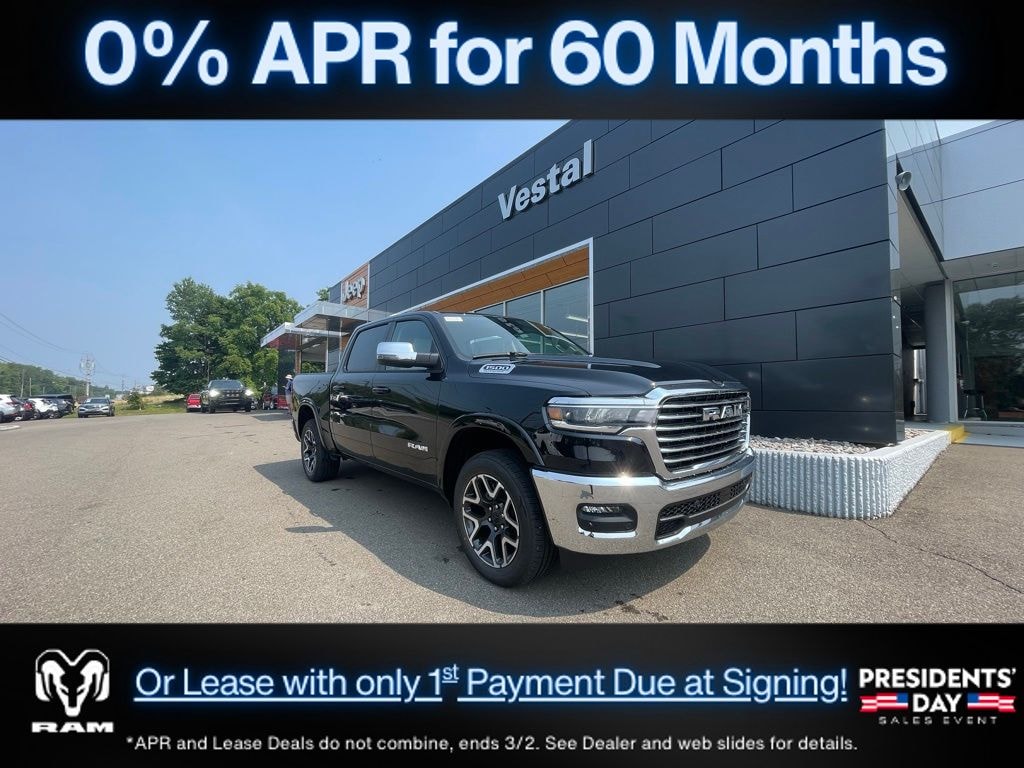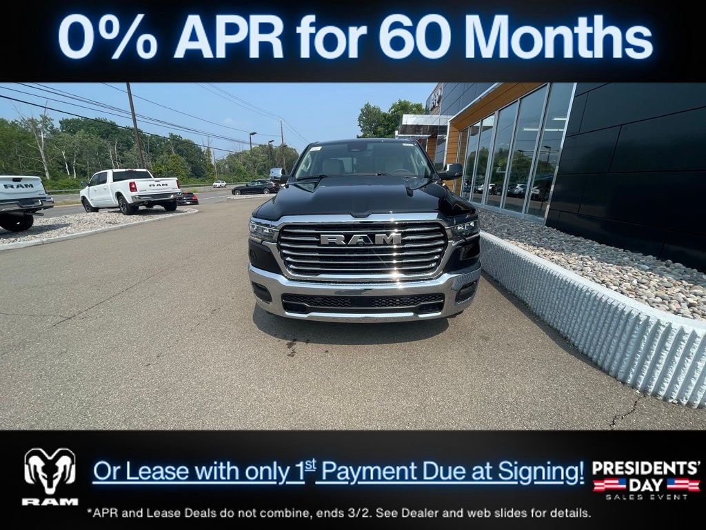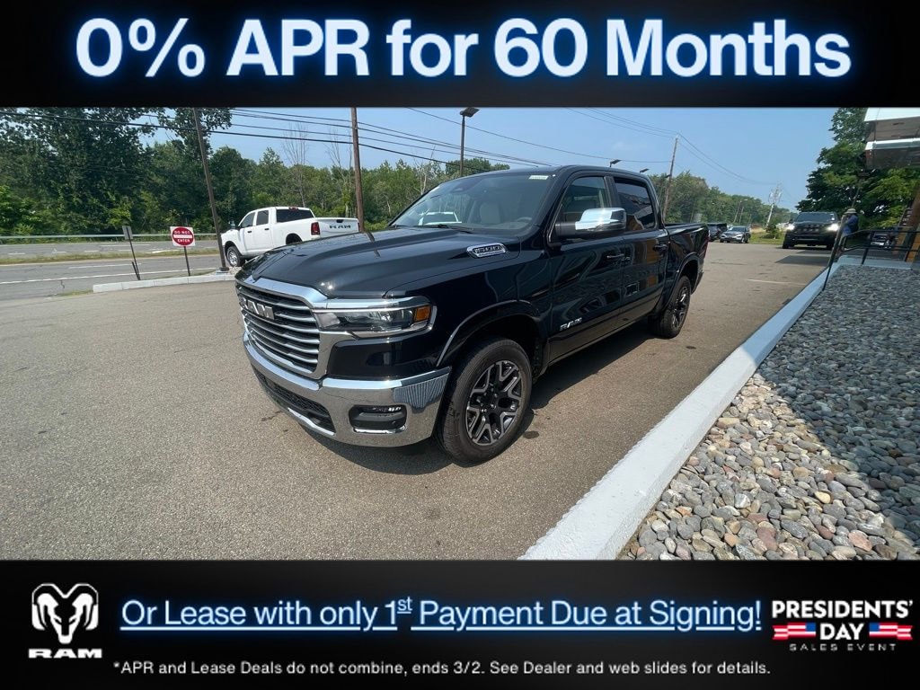 Diamond Black Crystal Pearlcoat 2026 Ram 1500 Laramie 4WD 8-Speed Automatic 3.0L I6 10 Speakers, 3.55 Rear Axle Ratio, 4-Wheel Disc Brakes, 4G LTE Wi-Fi Hot Spot, ABS brakes, Active Noise Control System, Adjustable pedals, Air Conditioning, Alloy wheels, AM/FM radio: SiriusXM with 360L, Apple CarPlay/Android Auto, Audio memory, Auto High-beam Headlights, Auto Power-Folding Mirrors, Auto-dimming door mirrors, Auto-Dimming Exterior Driver Mirror, Auto-dimming Rear-View mirror, Automatic temperature control, Bluetooth, Brake assist, Bumpers: chrome, Chrome Exterior Mirrors, Compass, Connected Travel and Traffic Services, Connectivity - US/Canada, Convex Wide-Angle Exterior Mirror Insert, Delay-off headlights, Driver door bin, Driver vanity mirror, Dual front impact airbags, Dual front side impact airbags, Electronic Stability Control, Exterior Mirrors Courtesy Lamps, Exterior Mirrors with Heating Element, Exterior Mirrors with Memory, Exterior Mirrors with Supplemental Signals, Front anti-roll bar, Front Bucket Seats, Front Center Armrest w/Storage, Front dual zone A/C, Front fog lights, Front License Plate Bracket, Front reading lights, Front wheel independent suspension, Fully automatic headlights, Garage door transmitter, GPS Navigation, Heated door mirrors, Heated front seats, Heated rear seats, Heated steering wheel, Illuminated entry, Integrated Center Stack Radio, Integrated Voice Command with Bluetooth, Laramie Level 1 Equipment Group, Leather steering wheel, Leather Trimmed Bucket Seats, Low tire pressure warning, Manufacturer's Statement of Origin, Memory seat, MOPAR Front and Rear Rubber Floor Mats, Navigation System, Occupant sensing airbag, Off-Road Information Pages, Outside temperature display, Overhead airbag, Overhead console, Panic alarm, ParkView Rear Back-Up Camera, Passenger door bin, Passenger vanity mirror, Pedal memory, Power door mirrors, Power driver seat, Power passenger seat, Power steering, Power windows, Quick Order Package 21H Laramie, Radio data system, Radio: Uconnect 5 Navigation with 12.0" Display, Rain Sensitive Windshield Wipers, RAM Grille Badge - Chrome, Rear anti-roll bar, Rear reading lights, Rear seat center armrest, Rear step bumper, Remote keyless entry, Remote Tailgate Release, Security system, SiriusXM Radio Service, SiriusXM with 360L, Speed control, Split folding rear seat, Steering wheel mounted audio controls, Tachometer, Telescoping steering wheel, Tilt steering wheel, Traction control, Trip computer, Turn signal indicator mirrors, USB Host Flip, Variably intermittent wipers, Ventilated front seats, Wheels: 20" x 9" Premium Paint/Polish.