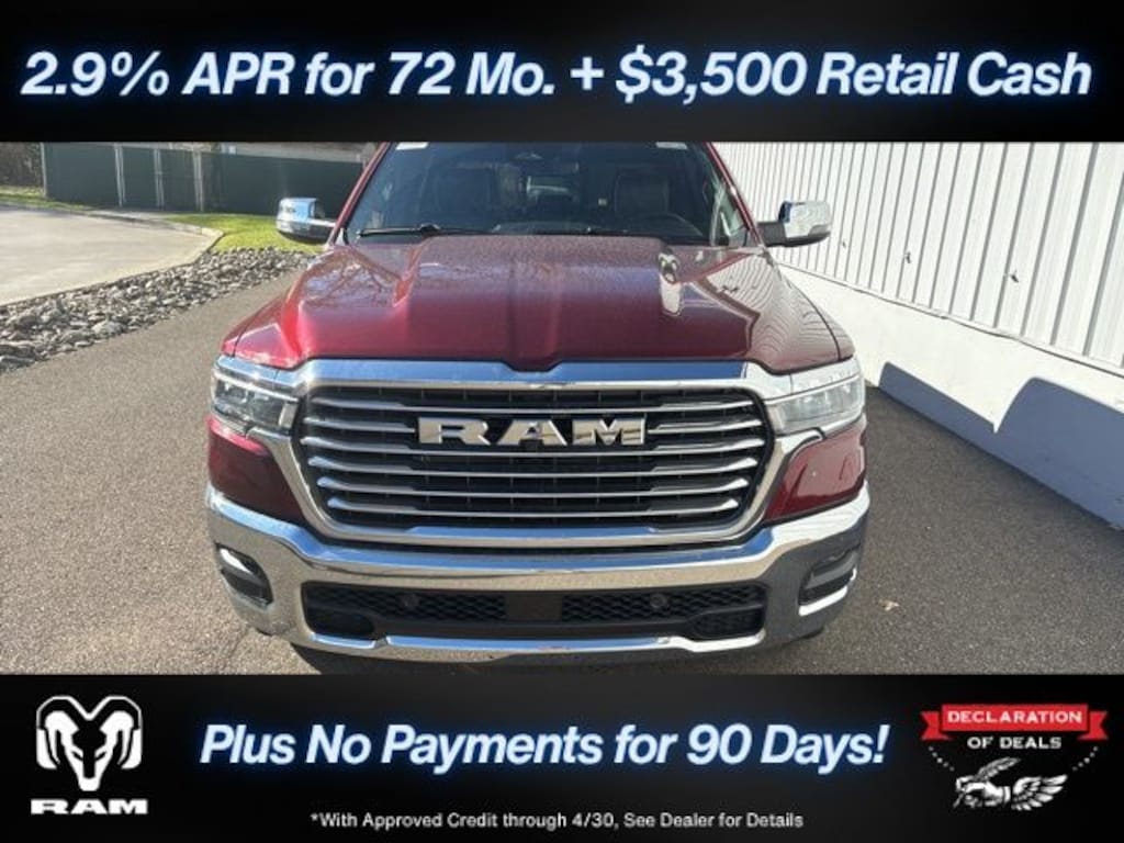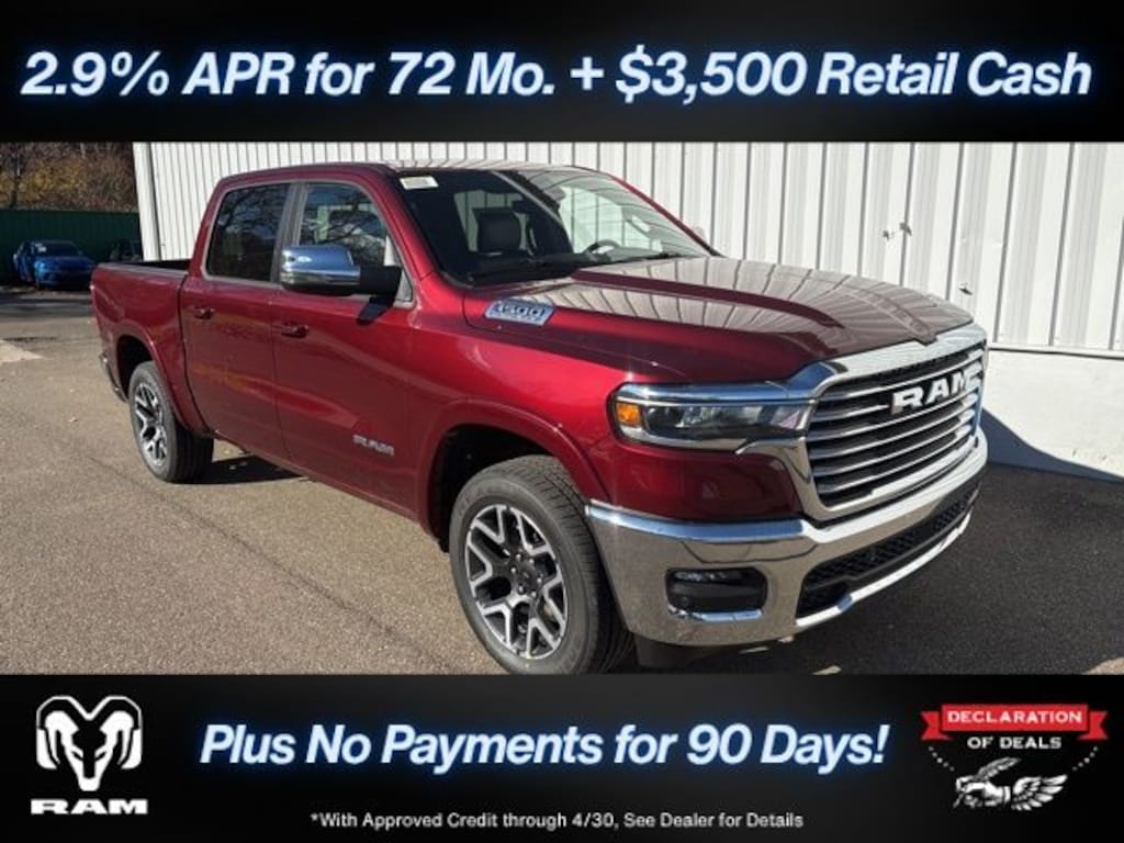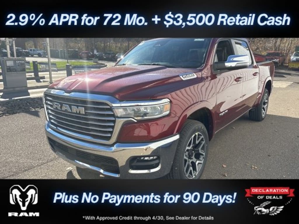 Delmonico Red Pearlcoat 2026 Ram 1500 Laramie 4WD 8-Speed Automatic 3.0L I6 Save Time at the Dealership by Customizing your Deal Online!, 10 Speakers, 3.55 Rear Axle Ratio, 4-Wheel Disc Brakes, 4G LTE Wi-Fi Hot Spot, ABS brakes, Active Noise Control System, Adjustable pedals, Air Conditioning, Alloy wheels, AM/FM radio: SiriusXM with 360L, Apple CarPlay/Android Auto, Audio memory, Auto High-beam Headlights, Auto Power-Folding Mirrors, Auto-dimming door mirrors, Auto-Dimming Exterior Driver Mirror, Auto-dimming Rear-View mirror, Automatic temperature control, Brake assist, Bumpers: chrome, Chrome Exterior Mirrors, Compass, Connected Travel and Traffic Services, Connectivity - US/Canada, Convex Wide-Angle Exterior Mirror Insert, Delay-off headlights, Driver door bin, Driver vanity mirror, Dual front impact airbags, Dual front side impact airbags, Electronic Stability Control, Exterior Mirrors Courtesy Lamps, Exterior Mirrors with Heating Element, Exterior Mirrors with Memory, Exterior Mirrors with Supplemental Signals, Front anti-roll bar, Front Bucket Seats, Front Center Armrest w/Storage, Front dual zone A/C, Front fog lights, Front License Plate Bracket, Front reading lights, Front wheel independent suspension, Fully automatic headlights, Garage door transmitter, GPS Navigation, Heated door mirrors, Heated front seats, Heated rear seats, Heated steering wheel, Illuminated entry, Integrated Center Stack Radio, Integrated Voice Command with Bluetooth, Leather steering wheel, Leather Trimmed Bucket Seats, Low tire pressure warning, Manufacturer's Statement of Origin, Memory seat, MOPAR Front and Rear Rubber Floor Mats, Navigation System, Occupant sensing airbag, Off-Road Information Pages, Outside temperature display, Overhead airbag, Overhead console, Panic alarm, ParkView Rear Back-Up Camera, Passenger door bin, Passenger vanity mirror, Pedal memory, Power door mirrors, Power driver seat, Power passenger seat, Power steering, Power windows, Quick Order Package 21H Laramie, Radio data system, Radio: Uconnect 5 Navigation with 12.0" Display, RAM Grille Badge - Chrome, Rear anti-roll bar, Rear reading lights, Rear seat center armrest, Rear step bumper, Remote keyless entry, Security system, SiriusXM Radio Service, SiriusXM with 360L, Speed control, Split folding rear seat, Steering wheel mounted audio controls, Tachometer, Telescoping steering wheel, Tilt steering wheel, Traction control, Trip computer, Turn signal indicator mirrors, USB Host Flip, Variably intermittent wipers, Ventilated front seats, Voltmeter, Wheels: 20" x 9" Premium Paint/Polish.