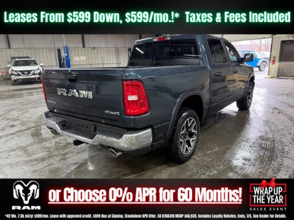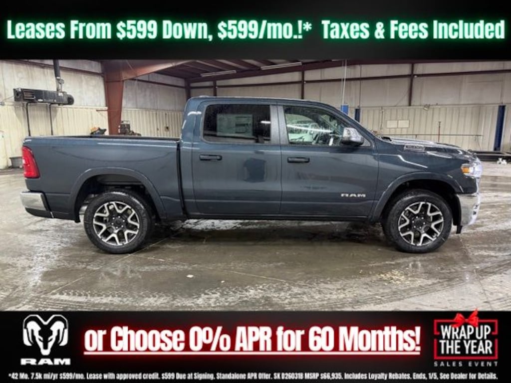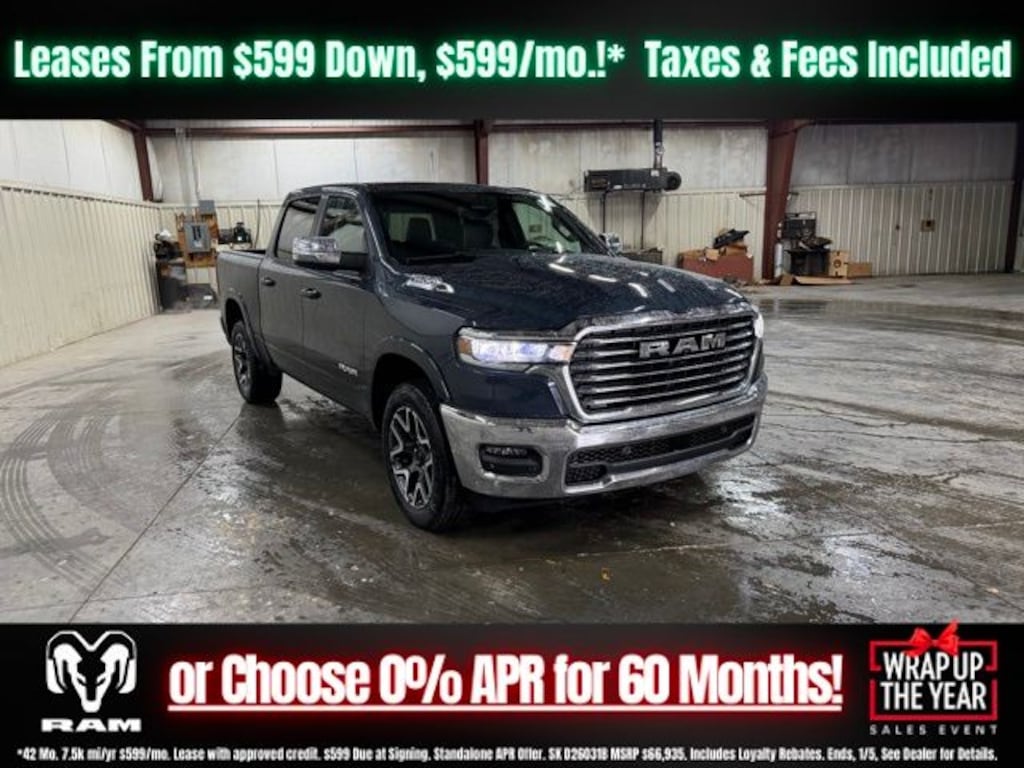 Forged Blue Metallic 2026 Ram 1500 Laramie 4WD 8-Speed Automatic 3.0L I6 Save Time at the Dealership by Customizing your Deal Online!, 10 Speakers, 3.55 Rear Axle Ratio, 4-Wheel Disc Brakes, 4G LTE Wi-Fi Hot Spot, ABS brakes, Active Noise Control System, Air Conditioning, Alloy wheels, AM/FM radio: SiriusXM with 360L, Apple CarPlay/Android Auto, Audio memory, Auto High-beam Headlights, Auto Power-Folding Mirrors, Auto-dimming door mirrors, Auto-Dimming Exterior Driver Mirror, Auto-dimming Rear-View mirror, Automatic temperature control, Brake assist, Bumpers: chrome, Chrome Exterior Mirrors, Compass, Connected Travel and Traffic Services, Connectivity - US/Canada, Convex Wide-Angle Exterior Mirror Insert, Delay-off headlights, Driver door bin, Driver vanity mirror, Dual front impact airbags, Dual front side impact airbags, Electronic Stability Control, Exterior Mirrors Courtesy Lamps, Exterior Mirrors with Heating Element, Exterior Mirrors with Memory, Exterior Mirrors with Supplemental Signals, Front anti-roll bar, Front Bucket Seats, Front Center Armrest w/Storage, Front dual zone A/C, Front fog lights, Front License Plate Bracket, Front reading lights, Front wheel independent suspension, Fully automatic headlights, Garage door transmitter, GPS Navigation, Heated door mirrors, Heated front seats, Heated rear seats, Heated steering wheel, Illuminated entry, Integrated Center Stack Radio, Integrated Voice Command with Bluetooth, Leather steering wheel, Leather Trimmed Bucket Seats, Low tire pressure warning, Manufacturer's Statement of Origin, Memory seat, Navigation System, Occupant sensing airbag, Off-Road Information Pages, Outside temperature display, Overhead airbag, Overhead console, Panic alarm, ParkView Rear Back-Up Camera, Passenger door bin, Passenger vanity mirror, Power door mirrors, Power driver seat, Power passenger seat, Power steering, Power windows, Quick Order Package 21H Laramie, Radio data system, Radio: Uconnect 5 Navigation with 12.0" Display, RAM Grille Badge - Chrome, Rear anti-roll bar, Rear reading lights, Rear seat center armrest, Rear step bumper, Remote keyless entry, Security system, SiriusXM Radio Service, SiriusXM with 360L, Speed control, Split folding rear seat, Steering wheel mounted audio controls, Tachometer, Telescoping steering wheel, Tilt steering wheel, Traction control, Trip computer, Turn signal indicator mirrors, USB Host Flip, Variably intermittent wipers, Ventilated front seats, Voltmeter, Wheels: 20" x 9" Premium Paint/Polish.