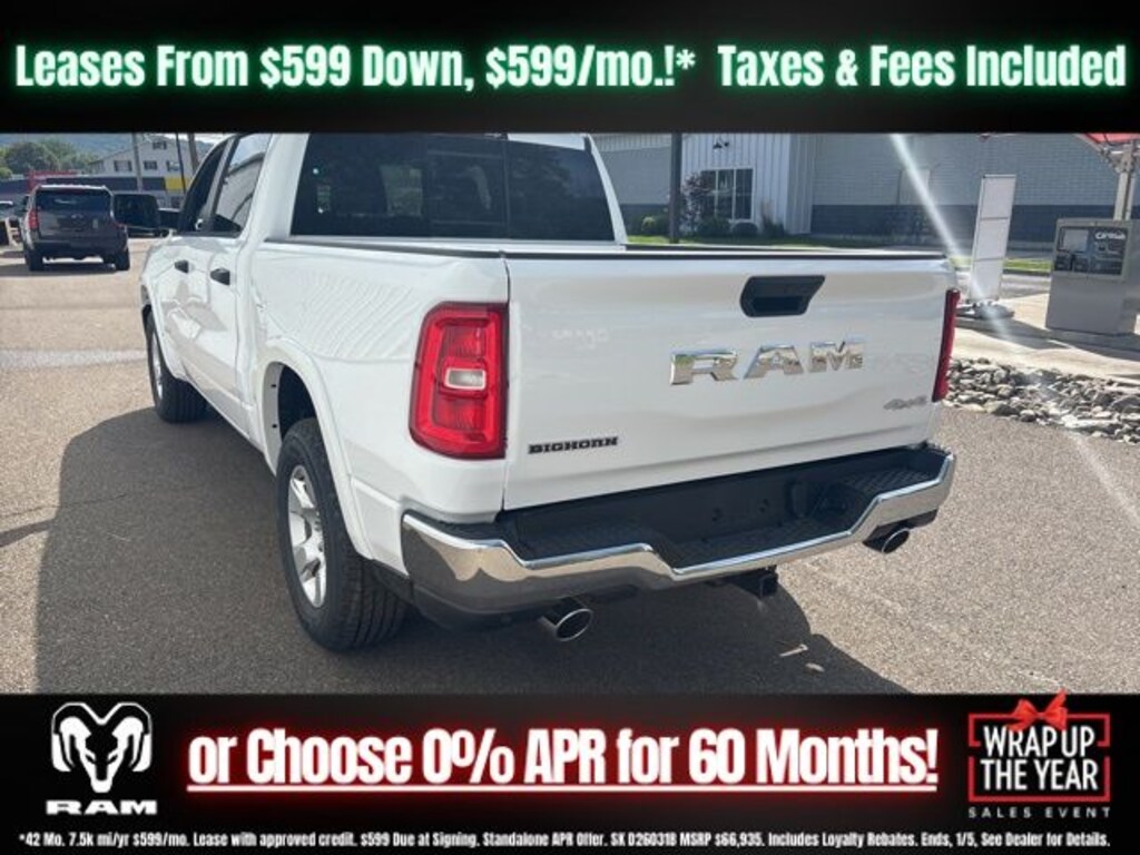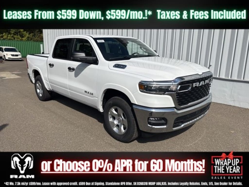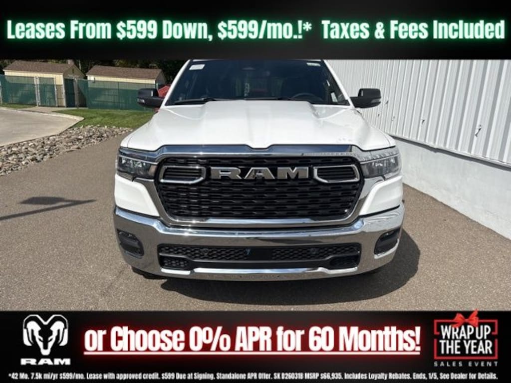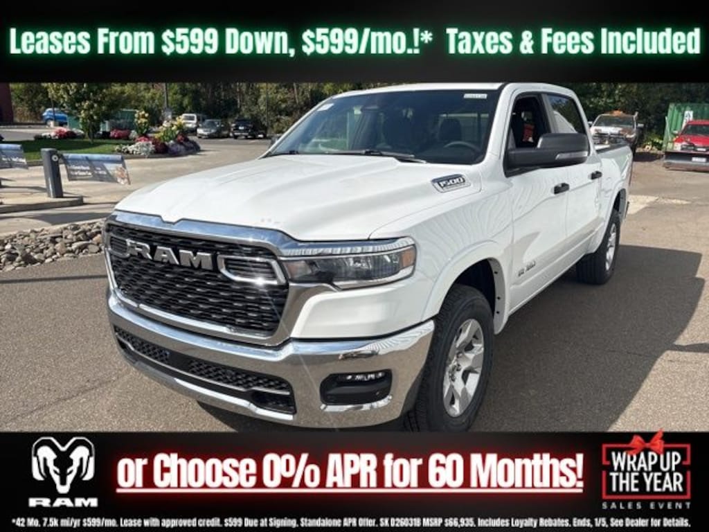 Bright White Clearcoat 2026 Ram 1500 Big Horn/Lone Star 4WD 8-Speed Automatic 3.0L I6 Save Time at the Dealership by Customizing your Deal Online!, 115V Auxiliary Power Outlet, 2nd Row in Floor Storage Bins, 3 Rear Seat Head Restraints, 4 Way Front Headrests, 4-Wheel Disc Brakes, 400W Inverter, 48V Belt Starter Generator, 4G LTE Wi-Fi Hot Spot, 6 Speakers, ABS brakes, Air Conditioning, Alloy wheels, AM/FM radio, Apple CarPlay, Apple CarPlay/Android Auto, Auto High-beam Headlights, Auto Power-Folding Mirrors, Auto-Dimming Exterior Driver Mirror, Auto-Dimming Rear-View Mirror, Big Horn Level 1 Equipment Group, Black Exterior Mirrors, Black Premium Power Mirrors, Body Color Fender Flares, Brake assist, Bucket Seats, Bumpers: chrome, Center Console Parts Module, Cloth Bucket Seats, Compass, Connectivity - US/Canada, Convex Wide-Angle Exterior Mirror Insert, Delay-off headlights, Deluxe Cloth Bucket Seats, Driver door bin, Dual front impact airbags, Dual front side impact airbags, Electronic Stability Control, Exterior Mirrors Courtesy Lamps, Exterior Mirrors with Heating Element, Exterior Mirrors with Supplemental Signals, Front anti-roll bar, Front Bucket Seats, Front Center Armrest w/Storage, Front fog lights, Front License Plate Bracket, Front reading lights, Front Seat Back Map Pockets, Front wheel independent suspension, Full Length Floor Console, Fully automatic headlights, Global Telematics Box Module, Glove Box Lamp, Google Android Auto, GPS Antenna Input, Heated door mirrors, Heated Front Seats, Heated Steering Wheel, Illuminated entry, Integrated Center Stack Radio, Integrated Voice Command with Bluetooth, Leather Wrapped Steering Wheel, Low tire pressure warning, Manual Adjust 4-Way Driver Seat, Manual Adjust 4-Way Front Passenger Seat, Manual Folding Exterior Mirrors, MOPAR Front and Rear Rubber Floor Mats, Occupant sensing airbag, Outside temperature display, Overhead airbag, Overhead console, Panic alarm, ParkView Rear Back-Up Camera, Passenger door bin, Passenger vanity mirror, Power 2-Way Driver Lumbar Adjust, Power Adjust 8-Way Driver Seat, Power Adjustable Pedals, Power door mirrors, Power steering, Power windows, Quick Order Package 21Z Big Horn, Radio data system, Radio: Uconnect 5 W with 8.4" Display, RAM Grille Badge - Chrome, Rear 60/40 Folding Seat, Rear anti-roll bar, Rear Center Armrest, Rear Dome with on/Off Switch Lamp, Rear Power Sliding Window, Rear step bumper, Rear Wheelhouse Liners, Rear Window Defroster, Remote keyless entry, SiriusXM Radio Service, SiriusXM Satellite Radio, Speed control, Steering Wheel Mounted Audio Controls, Sun Visors with Illuminated Vanity Mirrors, Supplier Part Tracking (J-1), Tachometer, Telescoping steering wheel, Tilt steering wheel, Traction control, Trip computer, Universal Garage Door Opener, USB Host Flip, Variably intermittent wipers, Voltmeter, Wheels: 18" x 8" Cast-Aluminum Painted.