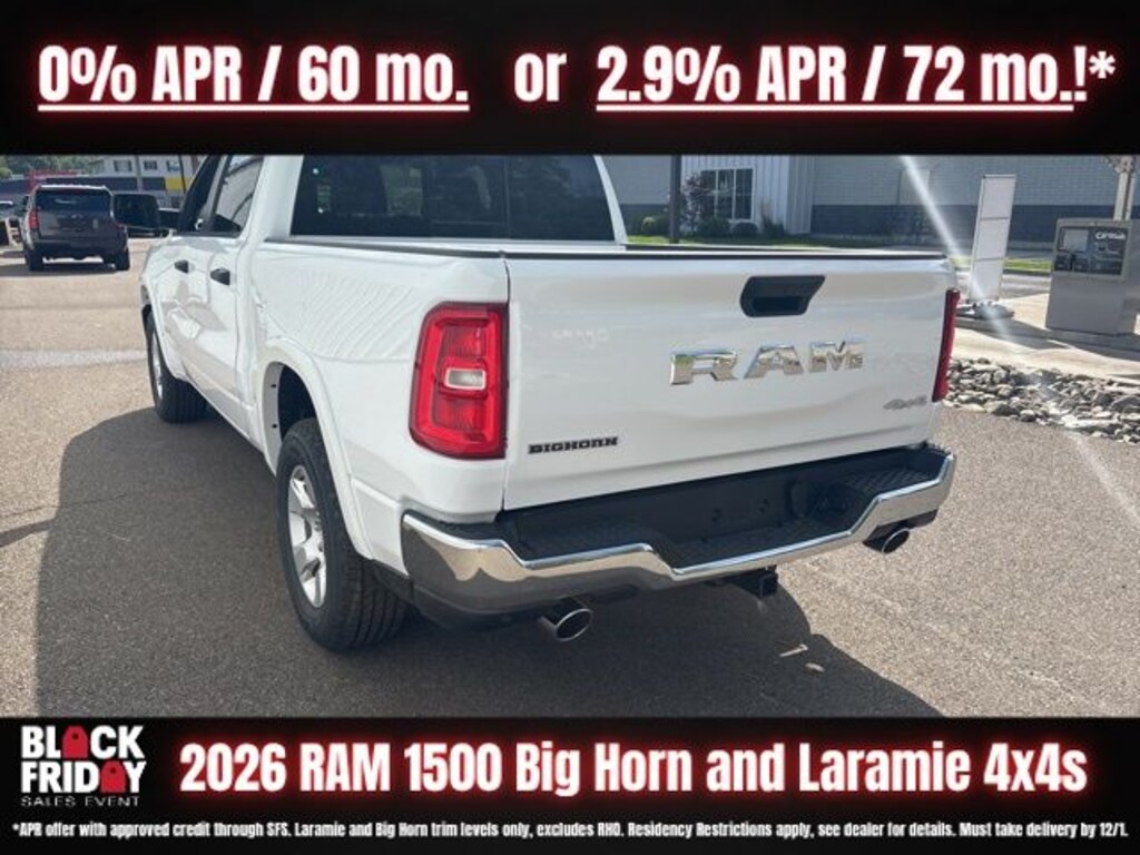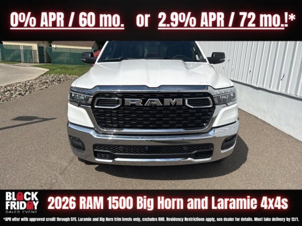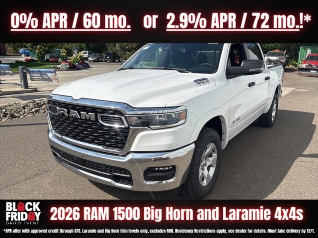 Bright White Clearcoat 2026 Ram 1500 Big Horn/Lone Star 4WD 8-Speed Automatic 3.0L I6 Save Time at the Dealership by Customizing your Deal Online!, 115V Auxiliary Power Outlet, 2nd Row In Floor Storage Bins, 3 Rear Seat Head Restraints, 4 Way Front Headrests, 4-Wheel Disc Brakes, 400W Inverter, 48V Belt Starter Generator, 4G LTE Wi-Fi Hot Spot, 6 Speakers, ABS brakes, Air Conditioning, Alloy wheels, AM/FM radio, Apple CarPlay, Apple CarPlay/Android Auto, Auto High-beam Headlights, Auto Power-Folding Mirrors, Auto-Dimming Exterior Driver Mirror, Auto-Dimming Rear-View Mirror, Big Horn Level 1 Equipment Group, Black Exterior Mirrors, Black Premium Power Mirrors, Body Color Fender Flares, Brake assist, Bucket Seats, Bumpers: chrome, Center Console Parts Module, Cloth Bucket Seats, Compass, Connectivity - US/Canada, Convex Wide-Angle Exterior Mirror Insert, Delay-off headlights, Deluxe Cloth Bucket Seats, Driver door bin, Dual front impact airbags, Dual front side impact airbags, Electronic Stability Control, Exterior Mirrors Courtesy Lamps, Exterior Mirrors w/Heating Element, Exterior Mirrors w/Supplemental Signals, Front anti-roll bar, Front Bucket Seats, Front Center Armrest w/Storage, Front fog lights, Front License Plate Bracket, Front reading lights, Front Seat Back Map Pockets, Front wheel independent suspension, Full Length Floor Console, Fully automatic headlights, Global Telematics Box Module (TBM), Glove Box Lamp, Google Android Auto, GPS Antenna Input, Heated door mirrors, Heated Front Seats, Heated Steering Wheel, Illuminated entry, Integrated Center Stack Radio, Integrated Voice Command w/Bluetooth, Leather Wrapped Steering Wheel, Low tire pressure warning, Manual Adjust 4-Way Driver Seat, Manual Adjust 4-Way Front Passenger Seat, Manual Folding Exterior Mirrors, MOPAR Front & Rear Rubber Floor Mats, Occupant sensing airbag, Outside temperature display, Overhead airbag, Overhead console, Panic alarm, ParkView Rear Back-Up Camera, Passenger door bin, Passenger vanity mirror, Power 2-Way Driver Lumbar Adjust, Power Adjust 8-Way Driver Seat, Power Adjustable Pedals, Power door mirrors, Power steering, Power windows, Quick Order Package 21Z Big Horn, Radio data system, Radio: Uconnect 5 W w/8.4" Display, RAM Grille Badge - Chrome, Rear 60/40 Folding Seat, Rear anti-roll bar, Rear Center Armrest, Rear Dome w/On/Off Switch Lamp, Rear Power Sliding Window, Rear step bumper, Rear Wheelhouse Liners, Rear Window Defroster, Remote keyless entry, SiriusXM Radio Service, SiriusXM Satellite Radio, Speed control, Steering Wheel Mounted Audio Controls, Sun Visors w/Illuminated Vanity Mirrors, Supplier Part Tracking (J-1), Tachometer, Telescoping steering wheel, Tilt steering wheel, Traction control, Trip computer, Universal Garage Door Opener, USB Host Flip, Variably intermittent wipers, Voltmeter, Wheels: 18" x 8" Cast-Aluminum Painted.