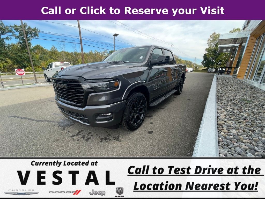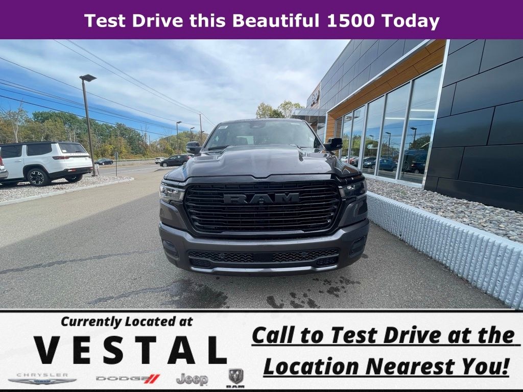 Granite Crystal Metallic Clearcoat 2026 Ram 1500 Laramie 4WD 8-Speed Automatic 3.0L I6 10 Speakers, 14.4" Touchscreen Display, 3.55 Rear Axle Ratio, 4-Wheel Disc Brakes, 4G LTE Wi-Fi Hot Spot, ABS brakes, Accent Color Door Handles, Accent Color Premium Power Mirrors, Accent Color Tailgate Handle, Active Noise Control System, Air Conditioning, Alloy wheels, AM/FM radio: SiriusXM with 360L, Anti-Spin Differential Rear Axle, Apple CarPlay, Apple CarPlay/Android Auto, Audio memory, Auto High-beam Headlights, Auto Power-Folding Mirrors, Auto-dimming door mirrors, Auto-Dimming Exterior Driver Mirror, Auto-dimming Rear-View mirror, Automatic temperature control, Bed Utility Group, Black Exterior Truck Badging, Black Headlamp Bezels, Black Interior Accents, Black Painted Exterior Mirrors Caps, Black Tail Lamp Bezels, Bluetooth, Body Color Front Bumper, Body Color Rear Bumper w/Step Pads, Brake assist, Bumpers: chrome, Chrome Exterior Mirrors, Cluster 12" TFT Color Display, Compass, Connected Travel & Traffic Services, Connectivity - US/Canada, Convex Wide-Angle Exterior Mirror Insert, Delay-off headlights, Disassociated Touchscreen Display, Dome Dual LED Reading Lamp, Driver door bin, Driver vanity mirror, Dual Exhaust w/Black Tips, Dual front impact airbags, Dual front side impact airbags, Dual Wireless Charging Pad, Dual-Pane Panoramic Sunroof, Electronic Stability Control, Exterior 115V AC Outlet, Exterior Mirrors Approach Lamps, Exterior Mirrors Courtesy Lamps, Exterior Mirrors w/Heating Element, Exterior Mirrors w/Memory, Exterior Mirrors w/Supplemental Signals, Front anti-roll bar, Front Bucket Seats, Front Center Armrest w/Storage, Front dual zone A/C, Front fog lights, Front License Plate Bracket, Front Passenger Interactive Display, Front reading lights, Front wheel independent suspension, Fully automatic headlights, Garage door transmitter, Global Telematics Box Module (TBM), Google Android Auto, GPS Antenna Input, GPS Navigation, Grille Surround 3 Black Texture 2 Black, harman/kardon 19 Speaker Premium Sound, HD Radio, Heated door mirrors, Heated front seats, Heated rear seats, Heated steering wheel, Illuminated entry, Integrated Center Stack Radio, Integrated Voice Command w/Bluetooth, Laramie Level 2 Equipment Group, Leather steering wheel, Leather Trimmed Bucket Seats, LED Dome/Reading Lamp, Low tire pressure warning, Manufacturer's Statement of Origin, Memory seat, MOPAR 4 Adjustable Cargo Tie-Down Hooks, Mopar Black Tubular Side Steps, MOPAR Front & Rear Rubber Floor Mats, MOPAR Spray In Bedliner, Navigation System, Night Edition, Occupant sensing airbag, Off-Road Information Pages, Outside temperature display, Overhead airbag, Overhead console, Panic alarm, ParkView Rear Back-Up Camera, Passenger door bin, Passenger vanity mirror, Pirelli Brand Tires, Power door mirrors, Power driver seat, Power passenger seat, Power steering, Power Tailgate, Power windows, Proximity Approach/Departure Lamps, Quick Order Package 21H Laramie, Radio data system, Radio: Uconnect 5 Nav w/12.0" Display, Radio: Uconnect 5 Nav w/14.4" Display, Rain Sensitive Windshield Wipers, RAM Grille Badge - Black, RAM Grille Badge - Chrome, Rear anti-roll bar, Rear reading lights, Rear seat center armrest, Rear step bumper, Remote keyless entry, Secondary Active Grille Shutters, Security system, SiriusXM Radio Service, SiriusXM w/360L, Smartphone As A Key Capable, Speed control, Split folding rear seat, Sport Performance Hood, Steering wheel mounted audio controls, Tachometer, Telescoping steering wheel, Tilt steering wheel, Traction control, Trailer Brake Control, Trip computer, Turn signal indicator mirrors, USB Host Flip, Variably intermittent wipers, Ventilated front seats, Wheels: 20" x 9" Premium Paint/Polish, Wheels: 22" x 9" Forged Aluminum.