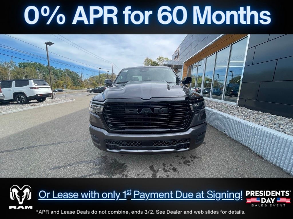 Granite Crystal Metallic Clearcoat 2026 Ram 1500 Laramie 4WD 8-Speed Automatic 3.0L I6 10 Speakers, 14.4" Touchscreen Display, 3.55 Rear Axle Ratio, 4-Wheel Disc Brakes, 4G LTE Wi-Fi Hot Spot, ABS brakes, Accent Color Door Handles, Accent Color Premium Power Mirrors, Accent Color Tailgate Handle, Active Noise Control System, Adjustable pedals, Air Conditioning, Alloy wheels, AM/FM radio: SiriusXM with 360L, Anti-Spin Differential Rear Axle, Apple CarPlay/Android Auto, Audio memory, Auto High-beam Headlights, Auto Power-Folding Mirrors, Auto-dimming door mirrors, Auto-Dimming Exterior Driver Mirror, Auto-dimming Rear-View mirror, Automatic temperature control, Bed Utility Group, Black Exterior Truck Badging, Black Headlamp Bezels, Black Interior Accents, Black Painted Exterior Mirrors Caps, Black Tail Lamp Bezels, Bluetooth, Body Color Front Bumper, Body Color Rear Bumper with Step Pads, Brake assist, Bumpers: chrome, Chrome Exterior Mirrors, Cluster 12" TFT Color Display, Compass, Connected Travel and Traffic Services, Connectivity - US/Canada, Convex Wide-Angle Exterior Mirror Insert, Delay-off headlights, Dome Dual LED Reading Lamp, Driver door bin, Driver vanity mirror, Dual Exhaust with Black Tips, Dual front impact airbags, Dual front side impact airbags, Dual-Pane Panoramic Sunroof, Electronic Stability Control, Exterior 115V AC Outlet, Exterior Mirrors Approach Lamps, Exterior Mirrors Courtesy Lamps, Exterior Mirrors with Heating Element, Exterior Mirrors with Memory, Exterior Mirrors with Supplemental Signals, Front anti-roll bar, Front Bucket Seats, Front Center Armrest w/Storage, Front dual zone A/C, Front fog lights, Front License Plate Bracket, Front Passenger Interactive Display, Front reading lights, Front wheel independent suspension, Fully automatic headlights, Garage door transmitter, GPS Navigation, Grille Surround 3 Black Texture 2 Black, Harman/Kardon 19 Speaker Premium Sound, Heated door mirrors, Heated front seats, Heated rear seats, Heated steering wheel, Illuminated entry, Integrated Center Stack Radio, Integrated Voice Command with Bluetooth, Laramie Level 2 Equipment Group, Leather steering wheel, Leather Trimmed Bucket Seats, LED Dome/Reading Lamp, Low tire pressure warning, Manufacturer's Statement of Origin, Memory seat, MOPAR 4 Adjustable Cargo Tie-Down Hooks, Mopar Black Tubular Side Steps, MOPAR Front and Rear Rubber Floor Mats, MOPAR Spray in Bedliner, Navigation System, Night Edition, Occupant sensing airbag, Off-Road Information Pages, Outside temperature display, Overhead airbag, Overhead console, Panic alarm, ParkView Rear Back-Up Camera, Passenger door bin, Passenger vanity mirror, Pedal memory, Pirelli Brand Tires, Power door mirrors, Power driver seat, Power passenger seat, Power steering, Power Tailgate, Power windows, Proximity Approach/Departure Lamps, Quick Order Package 21H Laramie, Radio data system, Radio: Uconnect 5 Nav with 14.4" Display, Radio: Uconnect 5 Navigation with 12.0" Display, Rain Sensitive Windshield Wipers, RAM Grille Badge - Black, RAM Grille Badge - Chrome, Rear anti-roll bar, Rear reading lights, Rear seat center armrest, Rear step bumper, Remote keyless entry, Security system, SiriusXM Radio Service, SiriusXM with 360L, Speed control, Split folding rear seat, Sport Performance Hood, Steering wheel mounted audio controls, Tachometer, Telescoping steering wheel, Tilt steering wheel, Traction control, Trailer Brake Control, Trip computer, Turn signal indicator mirrors, USB Host Flip, Variably intermittent wipers, Ventilated front seats, Wheels: 20" x 9" Premium Paint/Polish, Wheels: 22" x 9" Forged Aluminum.