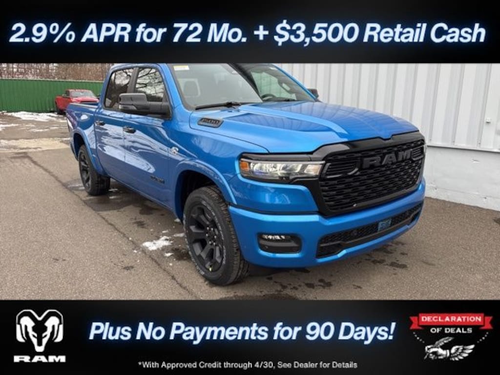 Hydro Blue Pearlcoat 2026 Ram 1500 Big Horn/Lone Star 4WD 8-Speed Automatic HEMI 5.7L V8 Multi Displacement VVT eTorque Save Time at the Dealership by Customizing your Deal Online!, 115V Auxiliary Power Outlet, 115V Auxiliary Rear Power Outlet, 12" Touchscreen Display, 2nd Row in Floor Storage Bins, 3 Rear Seat Head Restraints, 33 Gallon Fuel Tank, 4 Way Front Headrests, 4-Wheel Disc Brakes, 400W Inverter, 48V Belt Starter Generator, 4G LTE Wi-Fi Hot Spot, 6 Speakers, 9 Amplified Speakers with Subwoofer, ABS brakes, Accent Color Door Handles, Accent Color Premium Power Mirrors, Accent Color Tailgate Handle, Air Conditioning, Air Conditioning ATC with Dual Zone Control, Alloy wheels, AM/FM radio, Anti-Spin Differential Rear Axle, Apple CarPlay, Apple CarPlay/Android Auto, Auto High-beam Headlights, Auto Power-Folding Mirrors, Auto-Dimming Exterior Driver Mirror, Auto-Dimming Rear-View Mirror, Big Horn Level 2 Equipment Group, Black Exterior Mirrors, Black Exterior Truck Badging, Black Headlamp Bezels, Black Interior Accents, Black Painted Exterior Mirrors Caps, Black Premium Power Mirrors, Black Tail Lamp Bezels, Body Color Fender Flares, Body Color Front Bumper, Body Color Rear Bumper with Step Pads, Brake assist, Bucket Seats, Bumpers: chrome, Center Console Parts Module, Cloth Bucket Seats, Cluster 7.0" TFT Color Display, Compass, Configurable Drive Mode, Connected Travel and Traffic Services, Connectivity - US/Canada, Convex Wide-Angle Exterior Mirror Insert, Delay-off headlights, Deluxe Cloth Bucket Seats, Disassociated Touchscreen Display, Driver door bin, Dual Exhaust with Black Tips, Dual front impact airbags, Dual front side impact airbags, Electronic Stability Control, Exterior Mirrors Courtesy Lamps, Exterior Mirrors with Heating Element, Exterior Mirrors with Supplemental Signals, Front anti-roll bar, Front Bucket Seats, Front Center Armrest w/Storage, Front fog lights, Front License Plate Bracket, Front reading lights, Front Seat Back Map Pockets, Front wheel independent suspension, Full Length Floor Console, Fully automatic headlights, Global Telematics Box Module, Glove Box Lamp, Google Android Auto, GPS Antenna Input, GPS Navigation, Grille Black Surround Black Mesh, HD Radio, Heated door mirrors, Heated Front Seats, Heated Steering Wheel, Illuminated entry, Integrated Center Stack Radio, Integrated Voice Command with Bluetooth, Leather Wrapped Steering Wheel, LED Dome Lamp with on/Off Switch, LED Footwell Lighting, Low tire pressure warning, Manual Adjust 4-Way Driver Seat, Manual Adjust 4-Way Front Passenger Seat, Manual Folding Exterior Mirrors, Media Hub with 2 Charge Only USBs, MOPAR Front and Rear Rubber Floor Mats, Night Edition, Occupant sensing airbag, Outside temperature display, Overhead airbag, Overhead console, Overhead LED Lamps, Panic alarm, ParkView Rear Back-Up Camera, Passenger door bin, Passenger vanity mirror, Power 2-Way Driver Lumbar Adjust, Power Adjust 8-Way Driver Seat, Power Adjustable Pedals, Power door mirrors, Power steering, Power windows, Premium Overhead Console, Quick Order Package 27Z Big Horn, Radio data system, Radio: Uconnect 5 Navigation with 12.0" Display, Radio: Uconnect 5 W with 8.4" Display, RAM Grille Badge - Black, RAM Grille Badge - Chrome, Rear 60/40 Folding Seat, Rear anti-roll bar, Rear Center Armrest, Rear Power Sliding Window, Rear step bumper, Rear Window Defroster, Remote keyless entry, Remote Tailgate Release, Security Alarm, SiriusXM Radio Service, SiriusXM with 360L, Speed control, Steering Wheel Mounted Audio Controls, Sun Visors with Illuminated Vanity Mirrors, Supplier Part Tracking (J-1), Tachometer, Telescoping steering wheel, Tilt steering wheel, Traction control, Trailer Brake Control, Trip computer, Universal Garage Door Opener, USB Host Flip, Variably intermittent wipers, Voltmeter, Wheels: 20" x 9.0" Aluminum Painted Clad.