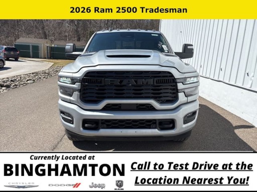 Silver Zynith 2026 Ram 2500 Tradesman 4WD 8-Speed Automatic 6.7L I6 Save Time at the Dealership by Customizing your Deal Online!, 115-Volt Auxiliary Front Power Outlet, 12" Touchscreen Display, 2 Way Rear Headrest Seat, 4 Way Front Headrests, 4-Wheel Disc Brakes, 40/20/40 Split Bench Seat, 400W Inverter, 4G LTE Wi-Fi Hot Spot, 6 Speakers, ABS brakes, Air Conditioning, Air Conditioning ATC with Dual Zone Control, Alexa Built-in, AM/FM radio: SiriusXM, Anti-Spin Differential Rear Axle, Apple CarPlay, Apple CarPlay/Android Auto, Auto Power-Folding Mirrors, Auto-Dimming Rear-View Mirror, Bed Convenience Group, Black Exterior Mirrors, Black Wheel Center Hub, Body Color Grille-Surround, Brake assist, Carpet Floor Covering, Clearance Lamps, Cloth 40/20/40 Bench Seat, Compass, Connected Travel and Traffic Services, Connectivity - US/Canada, Delay-off headlights, Disassociated Touchscreen Display, Driver door bin, Dual front impact airbags, Dual front side impact airbags, Electronic Stability Control, Emergency Vehicle Alert System (EVAS), Exterior 115V AC Outlet, Exterior Mirrors Courtesy Lamps, Exterior Mirrors with Heating Element, Exterior Mirrors with Supplemental Signals, For Details, Visit DriveUconnect.com, For More Info, Call 800-643-2112, Forward and Reverse Utility Lights, Front and Rear Floor Mats, Front anti-roll bar, Front Armrest with Cupholders, Front Center Armrest w/Storage, Front fog lights, Front License Plate Bracket, Front reading lights, Fully automatic headlights, Global Telematics Box Module, Google Android Auto, GPS Antenna Input, GPS Navigation, HD Radio, Illuminated entry, Integrated Voice Command with Bluetooth, LED Bed Lighting, Low tire pressure warning, Manual Adjust 4-Way Driver Seat, Manual Adjust 4-Way Front Passenger Seat, Manual Folding Exterior Mirrors, Manual Telescoping Mirrors, Manufacturer's Statement of Origin, Mirror Running Lights, Mopar Black Tubular Side Steps, MOPAR Spray in Bedliner, Occupant sensing airbag, Off-Road Info Pages, Outside temperature display, Overhead airbag, Overhead console, Painted Front Bumper, Painted Rear Bumper, Panic alarm, ParkSense Front/Rear Park Assist System, ParkView Rear Back-Up Camera, Passenger door bin, Passenger vanity mirror, Power Adjust Mirrors, Power Heated Folding Telescopic Mirrors, Power steering, Power Telescoping Mirrors, Power windows, Power-Adjustable Convex Aux Mirrors, Quick Order Package 24C Black Express, Radio data system, Radio: Uconnect 5 Navigation with 12.0" Display, Radio: Uconnect 5 with 8.4" Display, Rear anti-roll bar, Rear Backup Alarm, Rear Folding Seat, Rear Power Sliding Window, Rear step bumper, Rear Wheelhouse Liners, Rear window defroster, Remote keyless entry, Remote USB Port - Charge Only, Selectable Tire Fill Alert, SiriusXM Radio Service, SiriusXM with 360L, Speed control, Sport Performance Hood, Storage Tray, Tachometer, Tilt steering wheel, Tinted Acoustic Windshield Glass, Traction control, Tradesman Level 1 Equipment Group, Trailer Tow Pages, Variably intermittent wipers, Voltmeter, Wheels: 17" x 7.5" Black Steel Styled, Wheels: 20" x 8.0" Black Painted Aluminum.
