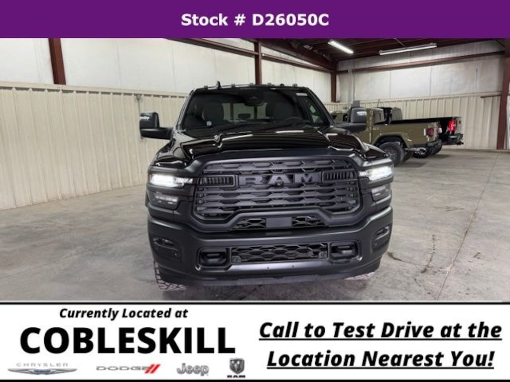 Diamond Black Crystal Pearlcoat 2026 Ram 2500 Tradesman 4WD 8-Speed Automatic 6.4L V8 Save Time at the Dealership by Customizing your Deal Online!, 115-Volt Auxiliary Front Power Outlet, 12" Touchscreen Display, 2 Way Rear Headrest Seat, 4 Way Front Headrests, 4-Wheel Disc Brakes, 40/20/40 Split Bench Seat, 400W Inverter, 4G LTE Wi-Fi Hot Spot, 6 Speakers, ABS brakes, Air Conditioning, Air Conditioning ATC with Dual Zone Control, Alexa Built-in, AM/FM radio: SiriusXM, Anti-Spin Differential Rear Axle, Apple CarPlay, Apple CarPlay/Android Auto, Auto Power-Folding Mirrors, Auto-Dimming Rear-View Mirror, Bed Convenience Group, Black Exterior Mirrors, Black Wheel Center Hub, Black Wheel Flares, Brake assist, Carpet Floor Covering, Clearance Lamps, Cloth 40/20/40 Bench Seat, Compass, Connected Travel and Traffic Services, Connectivity - US/Canada, Delay-off headlights, Disassociated Touchscreen Display, Driver door bin, Dual front impact airbags, Dual front side impact airbags, Electronic Stability Control, Emergency Vehicle Alert System (EVAS), Exterior 115V AC Outlet, Exterior Mirrors Courtesy Lamps, Exterior Mirrors with Heating Element, Exterior Mirrors with Supplemental Signals, For Details, Visit DriveUconnect.com, For More Info, Call 800-643-2112, Forward and Reverse Utility Lights, Front anti-roll bar, Front Armrest with Cupholders, Front Center Armrest w/Storage, Front fog lights, Front License Plate Bracket, Front Performance Tuned Shock Absorbers, Front reading lights, Fully automatic headlights, Global Telematics Box Module, Google Android Auto, GPS Antenna Input, GPS Navigation, HD Radio, Hill Descent Control, Illuminated entry, Integrated Voice Command with Bluetooth, LED Bed Lighting, Low tire pressure warning, Manual Adjust 4-Way Driver Seat, Manual Adjust 4-Way Front Passenger Seat, Manual Folding Exterior Mirrors, Manual Telescoping Mirrors, Manufacturer's Statement of Origin, Mirror Running Lights, Mopar Black Tubular Side Steps, MOPAR Front and Rear Rubber Floor Mats, MOPAR Spray in Bedliner, MyFlexCare Service Plan, Occupant sensing airbag, Off-Road Info Pages, Outside temperature display, Overhead airbag, Overhead console, Panic alarm, ParkView Rear Back-Up Camera, Passenger door bin, Passenger vanity mirror, Power Adjust Mirrors, Power Heated Folding Telescopic Mirrors, Power steering, Power Telescoping Mirrors, Power windows, Power-Adjustable Convex Aux Mirrors, Quick Order Package 2UB Warlock, Radio data system, Radio: Uconnect 5 Navigation with 12.0" Display, Radio: Uconnect 5 with 8.4" Display, Rear anti-roll bar, Rear Backup Alarm, Rear Folding Seat, Rear Performance Tuned Shock Absorbers, Rear Power Sliding Window, Rear step bumper, Rear Wheelhouse Liners, Rear window defroster, Remote keyless entry, Remote USB Port - Charge Only, Selectable Tire Fill Alert, SiriusXM Radio Service, SiriusXM with 360L, Speed control, Storage Tray, Tachometer, Tilt steering wheel, Tinted Acoustic Windshield Glass, Traction control, Tradesman Level 1 Equipment Group, Trailer Tow Pages, Variably intermittent wipers, Voltmeter, Warlock Decal, Wheels: 17" x 7.5" Black Steel Styled, Wheels: 20" x 8.0" Black Diamond Cut Aluminum.