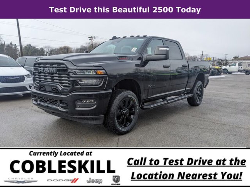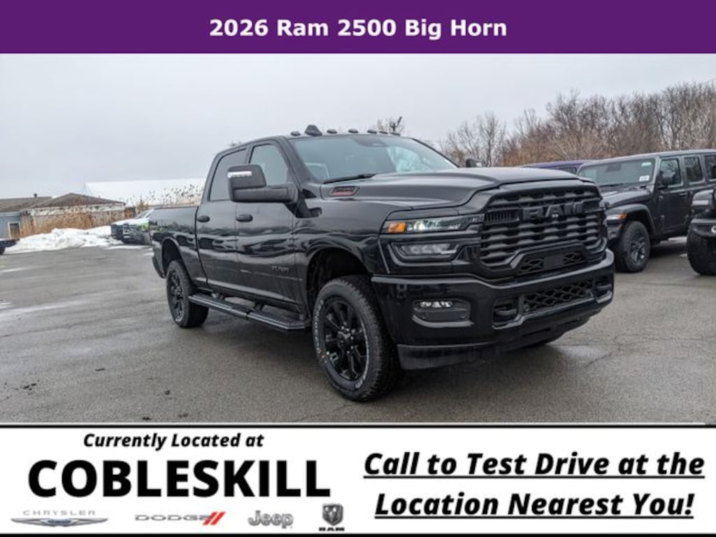 Diamond Black Crystal Pearlcoat 2026 Ram 2500 Big Horn 4WD 8-Speed Automatic 6.4L V8 Save Time at the Dealership by Customizing your Deal Online!, 12" Touchscreen Display, 2 Way Rear Headrest Seat, 2nd Row in Floor Storage Bins, 3.73 Axle Ratio, 4 Way Front Headrests, 4-Wheel Disc Brakes, 40/20/40 Split Bench Seat, 4G LTE Wi-Fi Hot Spot, 5th Wheel/Gooseneck Towing Prep Group, 6 Speakers, 9 Alpine Speakers with Subwoofer, ABS brakes, Air Conditioning, Air Conditioning ATC with Dual Zone Control, Alexa Built-in, Alloy wheels, AM/FM radio: SiriusXM, Anti-Spin Differential Rear Axle, Apple CarPlay, Apple CarPlay/Android Auto, Auto Power-Folding Mirrors, Auto-Dimming Rear-View Mirror, Big Horn Level 1 Plus Equipment Group, Black Exterior Mirrors, Black Exterior Truck Badging, Black Interior Accents, Black Wheel Center Hub, Body Color Grille-Surround, Brake assist, Bumpers: chrome, Center Hub, Clearance Lamps, Cloth 40/20/40 Bench Seat, Compass, Connected Travel and Traffic Services, Connectivity - US/Canada, Delay-off headlights, Disassociated Touchscreen Display, Driver door bin, Dual front impact airbags, Dual front side impact airbags, Dual Glove Boxes, Electronic Stability Control, Emergency Vehicle Alert System (EVAS), Exterior Mirrors Courtesy Lamps, Exterior Mirrors with Heating Element, Exterior Mirrors with Supplemental Signals, Foam Bottle Insert (door Trim Panel), Folding Flat Load Floor Storage, Footwell Courtesy Lamp, For Details, Visit DriveUconnect.com, For More Info, Call 800-643-2112, Forward and Reverse Utility Lights, Front anti-roll bar, Front Armrest with Cupholders, Front Center Armrest w/Storage, Front Center Seat Cushion Storage, Front fog lights, Front License Plate Bracket, Front reading lights, Front Seat Back Map Pockets, Fully automatic headlights, Global Telematics Box Module, Gloss Black Nostrils/Mic Black Grille, Glove Box Lamp, Google Android Auto, GPS Antenna Input, GPS Navigation, HD Radio, Heated door mirrors, Heated Front Seats, Heated Seats and Wheel Group, Heated Steering Wheel, Illuminated entry, Integrated Voice Command with Bluetooth, LED Bed Lighting, Locking Lower Glove Box, Low tire pressure warning, Luxury Steering Wheel, Manual Adjust 4-Way Driver Seat, Manual Adjust 4-Way Front Passenger Seat, Manufacturer's Statement of Origin, Mirror Running Lights, MOPAR Deployable Bed Step, MOPAR Front and Rear Rubber Floor Mats, MOPAR Spray in Bedliner, MyFlexCare Service Plan, Night Edition, Occupant sensing airbag, Off-Road Info Pages, Outside temperature display, Overhead airbag, Overhead console, Painted Flat Wheel-to-Wheel Side Steps, Painted Front Bumper, Painted Rear Bumper, Panic alarm, ParkView Rear Back-Up Camera, Passenger door bin, Passenger vanity mirror, Power 2-Way Driver Lumbar Adjust, Power Adjust 8-Way Driver Seat, Power Adjust Mirrors, Power door mirrors, Power Heated Folding Telescopic Mirrors, Power steering, Power Telescoping Mirrors, Power windows, Power-Adjustable Convex Aux Mirrors, Premium Cloth 40/20/40 Bench Seat, Quick Order Package 2UZ Big Horn, Radio data system, Radio: Uconnect 5 Navigation with 12.0" Display, Radio: Uconnect 5 with 8.4" Display, Rear 60/40 Folding Seat, Rear anti-roll bar, Rear Dome with on/Off Switch Lamp, Rear Folding Seat, Rear seat center armrest, Rear step bumper, Rear Wheelhouse Liners, Rear window defroster, Remote keyless entry, Remote Start System, Remote USB Port - Charge Only, Security system, Selectable Tire Fill Alert, SiriusXM Radio Service, SiriusXM with 360L, Speed control, Steering Wheel Mounted Audio Controls, Storage Tray, Tachometer, Tilt steering wheel, Traction control, Trailer Tow Pages, Trip computer, Turn signal indicator mirrors, Variably intermittent wipers, Voltmeter, Wheels: 18" x 8.0" Polished Aluminum, Wheels: 20" x 8.0" Black Painted Aluminum.