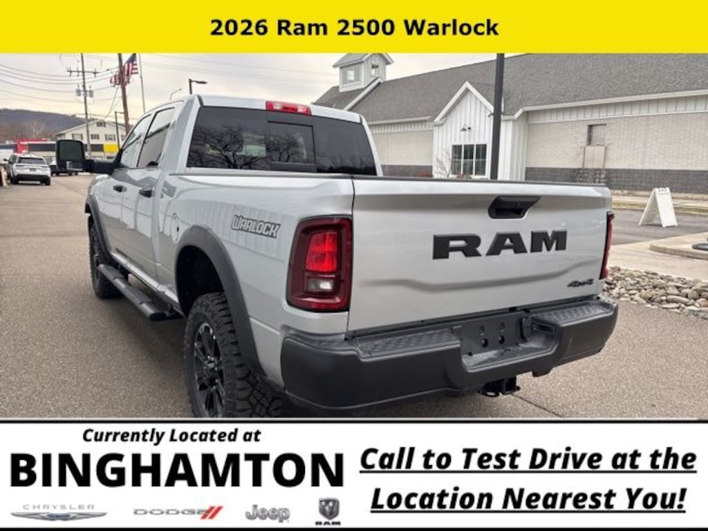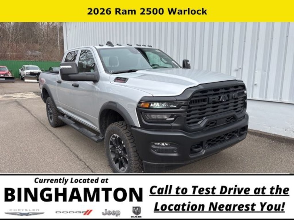 Silver Zynith 2026 Ram 2500 Tradesman 4WD 8-Speed Automatic 6.4L V8 Save Time at the Dealership by Customizing your Deal Online!, 115-Volt Auxiliary Front Power Outlet, 12" Touchscreen Display, 2 Way Rear Headrest Seat, 3.73 Axle Ratio, 4 Way Front Headrests, 4-Wheel Disc Brakes, 40/20/40 Split Bench Seat, 400W Inverter, 4G LTE Wi-Fi Hot Spot, 6 Speakers, ABS brakes, Air Conditioning, Air Conditioning ATC with Dual Zone Control, Alexa Built-in, AM/FM radio: SiriusXM, Anti-Spin Differential Rear Axle, Apple CarPlay, Apple CarPlay/Android Auto, Auto Power-Folding Mirrors, Auto-Dimming Rear-View Mirror, Bed Convenience Group, Black Exterior Mirrors, Black Wheel Center Hub, Black Wheel Flares, Brake assist, Carpet Floor Covering, Clearance Lamps, Cloth 40/20/40 Bench Seat, Compass, Connected Travel and Traffic Services, Connectivity - US/Canada, Delay-off headlights, Disassociated Touchscreen Display, Driver door bin, Dual front impact airbags, Dual front side impact airbags, Electronic Stability Control, Emergency Vehicle Alert System (EVAS), Exterior 115V AC Outlet, Exterior Mirrors Courtesy Lamps, Exterior Mirrors with Heating Element, Exterior Mirrors with Supplemental Signals, For Details, Visit DriveUconnect.com, For More Info, Call 800-643-2112, Forward and Reverse Utility Lights, Front anti-roll bar, Front Armrest with Cupholders, Front Center Armrest w/Storage, Front fog lights, Front License Plate Bracket, Front Performance Tuned Shock Absorbers, Front reading lights, Fully automatic headlights, Global Telematics Box Module, Google Android Auto, GPS Antenna Input, GPS Navigation, HD Radio, Hill Descent Control, Illuminated entry, Integrated Voice Command with Bluetooth, LED Bed Lighting, Low tire pressure warning, Manual Adjust 4-Way Driver Seat, Manual Adjust 4-Way Front Passenger Seat, Manual Folding Exterior Mirrors, Manual Telescoping Mirrors, Manufacturer's Statement of Origin, Mirror Running Lights, Mopar Black Tubular Side Steps, MOPAR Front and Rear Rubber Floor Mats, MOPAR Spray in Bedliner, Occupant sensing airbag, Off-Road Info Pages, Outside temperature display, Overhead airbag, Overhead console, Panic alarm, ParkView Rear Back-Up Camera, Passenger door bin, Passenger vanity mirror, Power Adjust Mirrors, Power Heated Folding Telescopic Mirrors, Power steering, Power Telescoping Mirrors, Power windows, Power-Adjustable Convex Aux Mirrors, Quick Order Package 2UB Warlock, Radio data system, Radio: Uconnect 5 Navigation with 12.0" Display, Radio: Uconnect 5 with 8.4" Display, Rear anti-roll bar, Rear Folding Seat, Rear Performance Tuned Shock Absorbers, Rear Power Sliding Window, Rear step bumper, Rear Wheelhouse Liners, Rear window defroster, Remote keyless entry, Remote USB Port - Charge Only, Selectable Tire Fill Alert, SiriusXM Radio Service, SiriusXM with 360L, Speed control, Storage Tray, Tachometer, Tilt steering wheel, Tinted Acoustic Windshield Glass, Traction control, Tradesman Level 1 Equipment Group, Trailer Tow Pages, Variably intermittent wipers, Voltmeter, Warlock Decal, Wheels: 17" x 7.5" Black Steel Styled, Wheels: 20" x 8.0" Black Diamond Cut Aluminum.