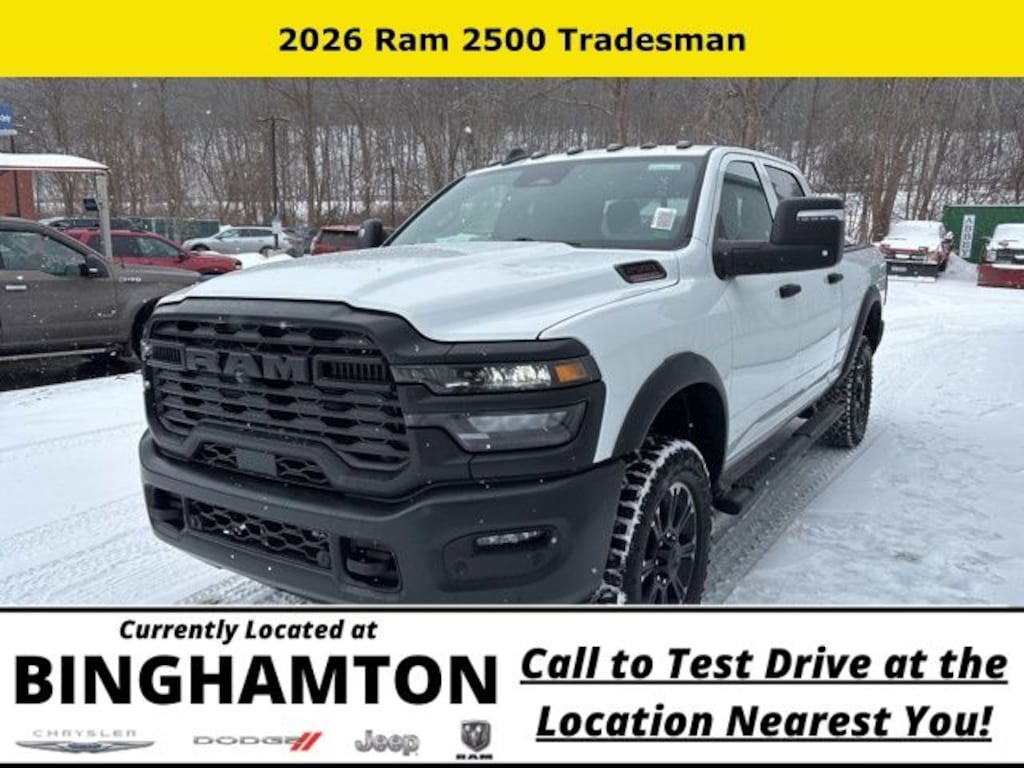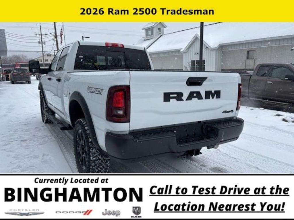 Bright White Clearcoat 2026 Ram 2500 Tradesman 4WD 8-Speed Automatic 6.4L V8 Save Time at the Dealership by Customizing your Deal Online!, 115-Volt Auxiliary Front Power Outlet, 12" Touchscreen Display, 2 Way Rear Headrest Seat, 3.73 Axle Ratio, 4 Way Front Headrests, 4-Wheel Disc Brakes, 40/20/40 Split Bench Seat, 400W Inverter, 4G LTE Wi-Fi Hot Spot, 6 Speakers, ABS brakes, Air Conditioning, Air Conditioning ATC with Dual Zone Control, Alexa Built-in, AM/FM radio: SiriusXM, Anti-Spin Differential Rear Axle, Apple CarPlay, Apple CarPlay/Android Auto, Auto Power-Folding Mirrors, Auto-Dimming Rear-View Mirror, Bed Convenience Group, Black Exterior Mirrors, Black Wheel Center Hub, Black Wheel Flares, Brake assist, Carpet Floor Covering, Clearance Lamps, Cloth 40/20/40 Bench Seat, Compass, Connected Travel and Traffic Services, Connectivity - US/Canada, Delay-off headlights, Disassociated Touchscreen Display, Driver door bin, Dual front impact airbags, Dual front side impact airbags, Electronic Stability Control, Emergency Vehicle Alert System (EVAS), Exterior 115V AC Outlet, Exterior Mirrors Courtesy Lamps, Exterior Mirrors with Heating Element, Exterior Mirrors with Supplemental Signals, For Details, Visit DriveUconnect.com, For More Info, Call 800-643-2112, Forward and Reverse Utility Lights, Front anti-roll bar, Front Armrest with Cupholders, Front Center Armrest w/Storage, Front fog lights, Front License Plate Bracket, Front Performance Tuned Shock Absorbers, Front reading lights, Fully automatic headlights, Global Telematics Box Module, Google Android Auto, GPS Antenna Input, GPS Navigation, HD Radio, Hill Assist, Illuminated entry, Integrated Voice Command with Bluetooth, LED Bed Lighting, Low tire pressure warning, Manual Adjust 4-Way Driver Seat, Manual Adjust 4-Way Front Passenger Seat, Manual Folding Exterior Mirrors, Manuarl Telescoping Mirrors, Manufacturer's Statement of Origin, Mirror Running Lights, Mopar Black Tubular Side Steps, MOPAR Front and Rear Rubber Floor Mats, MOPAR Spray in Bedliner, Occupant sensing airbag, Off-Road Info Pages, Outside temperature display, Overhead airbag, Overhead console, Panic alarm, ParkView Rear Back-Up Camera, Passenger door bin, Passenger vanity mirror, Power Adjust Mirrors, Power Heated Folding Telescopic Mirrors, Power steering, Power Telescoping Mirrors, Power windows, Power-Adjustable Convex Aux Mirrors, Quick Order Package 2UB Warlock, Radio data system, Radio: Uconnect 5 Navigation with 12.0" Display, Radio: Uconnect 5 with 8.4" Display, Rear anti-roll bar, Rear Folding Seat, Rear Performance Tuned Shock Absorbers, Rear Power Sliding Window, Rear step bumper, Rear Wheelhouse Liners, Rear window defroster, Remote keyless entry, Remote USB Port - Charge Only, Selectable Tire Fill Alert, SiriusXM Radio Service, SiriusXM with 360L, Speed control, Storage Tray, Tachometer, Tilt steering wheel, Tinted Acoustic Windshield Glass, Traction control, Tradesman Level 1 Equipment Group, Trailer Tow Pages, Variably intermittent wipers, Voltmeter, Warlock Decal, Wheels: 17" x 7.5" Black Steel Styled, Wheels: 20" x 8.0" Black Diamond Cut Aluminum.