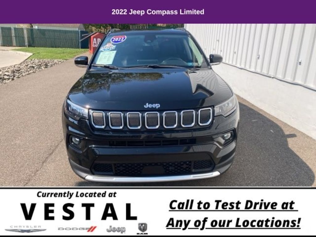 4WD, 10.1" Touchscreen Display, 3.73 Axle Ratio, 4-Wheel Disc Brakes, 6 Speakers, ABS brakes, Air Conditioning, Alloy wheels, AM/FM radio: SiriusXM, Anti-whiplash front head restraints, Auto High-beam Headlights, Auto-dimming Rear-View mirror, Automatic temperature control, Brake assist, Bumpers: body-color, Compass, Delay-off headlights, Disassociated Touchscreen Display, Driver door bin, Driver vanity mirror, Dual front impact airbags, Dual front side impact airbags, Electronic Stability Control, Emergency communication system: SiriusXM Guardian, Four wheel independent suspension, Front anti-roll bar, Front Bucket Seats, Front Center Armrest w/Storage, Front dual zone A/C, Front fog lights, Front reading lights, Fully automatic headlights, Global Telematics Box Module (TBM), Gloss Black Exterior Mirrors, Heated door mirrors, Heated front seats, Heated steering wheel, Illuminated entry, Knee airbag, Leather Shift Knob, Leather Trimmed Bucket Seats, Low tire pressure warning, Occupant sensing airbag, Outside temperature display, Overhead airbag, Overhead console, Panic alarm, ParkView Rear Back-Up Camera, Passenger door bin, Passenger vanity mirror, Power door mirrors, Power driver seat, Power steering, Power windows, Quick Order Package 2GG, Radio: Uconnect 5 w/10.1" Display, Rain sensing wipers, Rear anti-roll bar, Rear seat center armrest, Rear window defroster, Rear window wiper, Remote keyless entry, Roof rack: rails only, Security system, Speed control, Split folding rear seat, Spoiler, Steering wheel mounted audio controls, Tachometer, Telescoping steering wheel, Tilt steering wheel, Traction control, Trip computer, Turn signal indicator mirrors, Variably intermittent wipers, Wheels: 18" x 7" Painted Diamond Cut Aluminum, 4WD. 2022 Jeep Compass 4D Sport Utility Limited Diamond Black Crystal Pearlcoat 4WD 9-Speed 948TE Automatic 2.4L I4