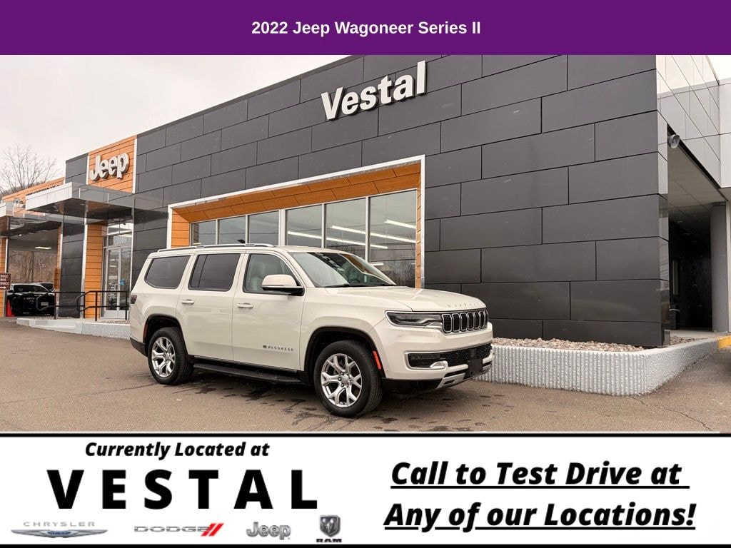 10 Speakers, 3.21 Rear Axle Ratio, 3rd row seats: bench, 4-Wheel Disc Brakes, ABS brakes, Adjustable pedals, Air Conditioning, Alloy wheels, AM/FM radio: SiriusXM with 360L, Anti-whiplash front head restraints, Audio memory, Auto-dimming door mirrors, Auto-dimming Rear-View mirror, Auto-leveling suspension, Automatic temperature control, Bluetooth, Brake assist, Bumpers: body-color, Compass, Delay-off headlights, Driver door bin, Driver vanity mirror, Driver's Seat Mounted Armrest, Dual front impact airbags, Dual front side impact airbags, Electronic Stability Control, Exterior Parking Camera Rear, Four wheel independent suspension, Front anti-roll bar, Front Bucket Seats, Front Center Armrest w/Storage, Front dual zone A/C, Front fog lights, Front reading lights, Fully automatic headlights, Garage door transmitter, Genuine wood console insert, Genuine wood dashboard insert, Genuine wood door panel insert, Heated door mirrors, Heated front seats, Heated steering wheel, Illuminated entry, Knee airbag, Leather Trimmed Bucket Seats, Low tire pressure warning, Memory seat, Navigation System, Normal Duty Suspension, Occupant sensing airbag, Outside temperature display, Overhead airbag, Overhead console, Panic alarm, Passenger door bin, Passenger seat mounted armrest, Passenger vanity mirror, Pedal memory, Power adjustable front head restraints, Power door mirrors, Power driver seat, Power Liftgate, Power passenger seat, Power steering, Power windows, Quick Order Package 22J, Radio data system, Radio: Uconnect 5 Nav w/10.1" Display, Rain sensing wipers, Rear air conditioning, Rear anti-roll bar, Rear dual zone A/C, Rear reading lights, Rear seat center armrest, Rear window defroster, Rear window wiper, Reclining 3rd row seat, Remote keyless entry, Security system, Speed control, Speed-sensing steering, Speed-Sensitive Wipers, Split folding rear seat, Steering wheel memory, Steering wheel mounted audio controls, Tachometer, Telescoping steering wheel, Tilt steering wheel, Traction control, Trip computer, Turn signal indicator mirrors, Variably intermittent wipers, Ventilated front seats, Wheels: 20" x 9.0" Aluminum Base Finish. 2022 Jeep Wagoneer 4D Sport Utility Series II Luxury White Pearlcoat 4WD 8-Speed Automatic 5.7L V8