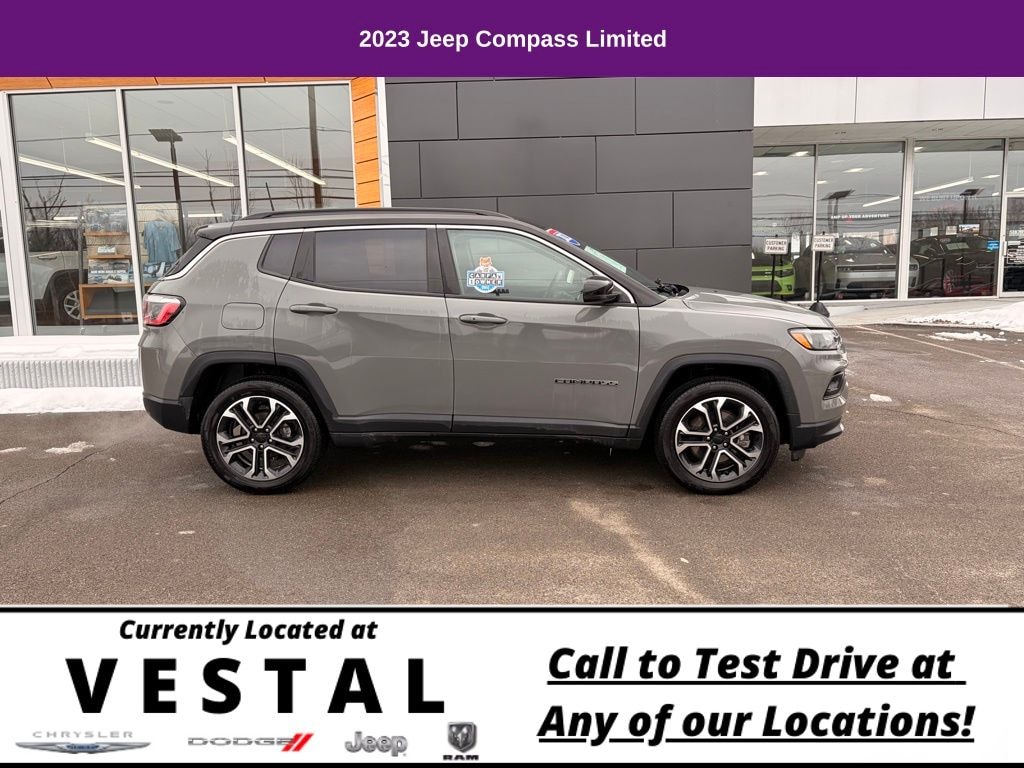 4WD, 10.1" Touchscreen Display, 3.73 Final Drive Ratio, 4-Wheel Disc Brakes, 6 Speakers, ABS brakes, Air Conditioning, Alloy wheels, AM/FM radio: SiriusXM, Auto High-beam Headlights, Auto-dimming Rear-View mirror, Automatic temperature control, Brake assist, Bumpers: body-color, Compass, Delay-off headlights, Disassociated Touchscreen Display, Driver door bin, Driver vanity mirror, Dual front impact airbags, Dual front side impact airbags, Electronic Stability Control, Four wheel independent suspension, Front anti-roll bar, Front Bucket Seats, Front Center Armrest w/Storage, Front dual zone A/C, Front fog lights, Front reading lights, Fully automatic headlights, Heated door mirrors, Heated front seats, Heated steering wheel, Hidden Exhaust Tips-Dual, Illuminated entry, Knee airbag, Leather Shift Knob, Leatherette Seats, Low tire pressure warning, Occupant sensing airbag, Outside temperature display, Overhead airbag, Overhead console, Panic alarm, ParkView Rear Back-Up Camera, Passenger door bin, Passenger vanity mirror, Power door mirrors, Power driver seat, Power steering, Power windows, Quick Order Package 29G, Radio: Uconnect 5 w/10.1" Display, Rain sensing wipers, Rear anti-roll bar, Rear seat center armrest, Rear window defroster, Rear window wiper, Remote keyless entry, Security system, SiriusXM Radio Service, Speed control, Split folding rear seat, Spoiler, Steering wheel mounted audio controls, Tachometer, Telescoping steering wheel, Tilt steering wheel, Traction control, Trip computer, Turn signal indicator mirrors, Variably intermittent wipers, Wheels: 18" x 7" Painted Diamond Cut Aluminum, 4WD. 2023 Jeep Compass 4D Sport Utility Limited Sting-Gray Clearcoat 4x4 4WD 8-Speed Automatic 2.0L I4 DOHC